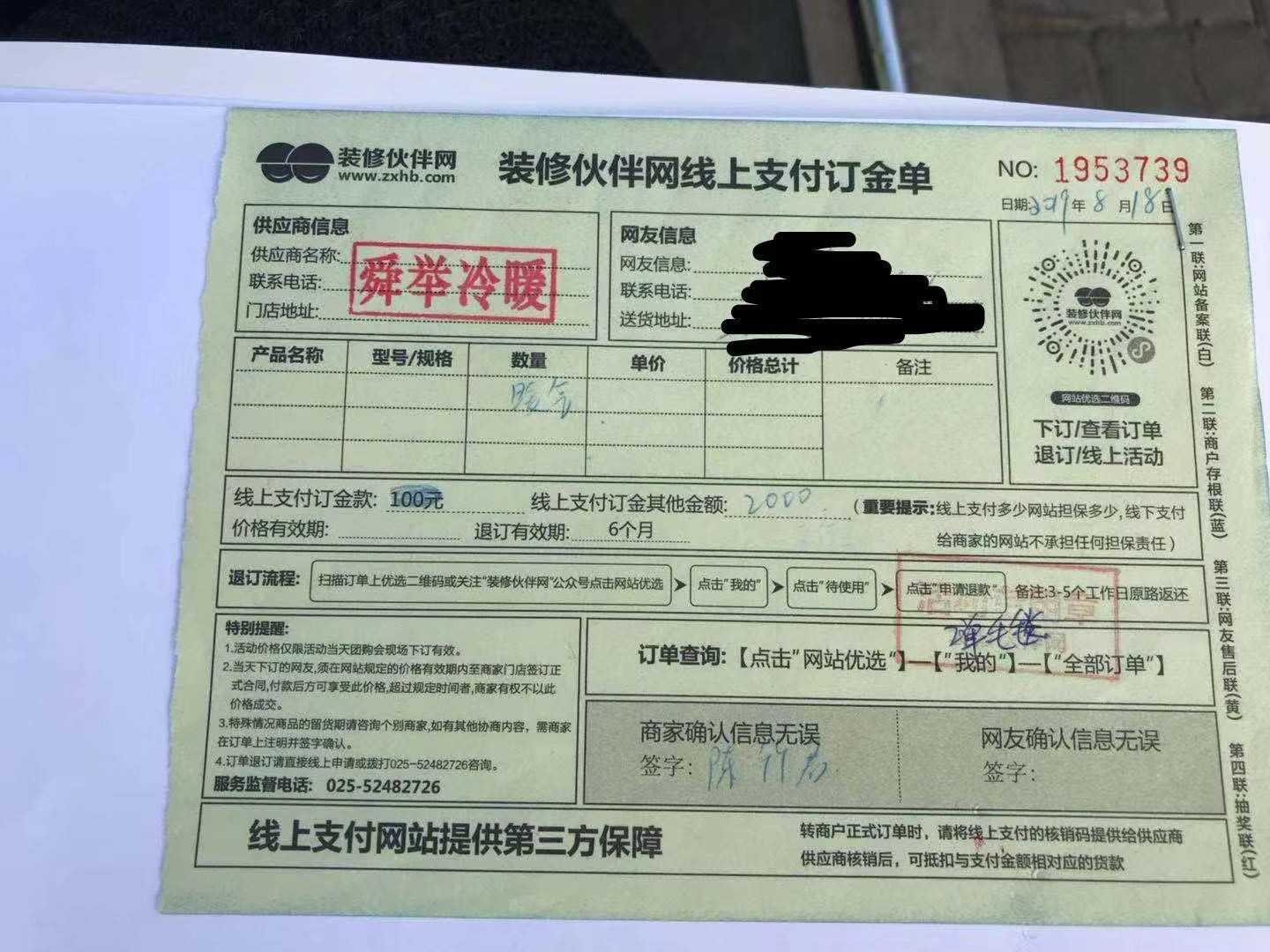 2019年8月18日通过在奥体展会上交给舜举公司2000元订金,为我家加装冷暖设备,但由于报价过高,再三要求退还订金,商家一再拖延,并且销售员陈某态度恶劣,以各种理由刁难,拒不退还,信用及其差,强烈要求退还我订金!
