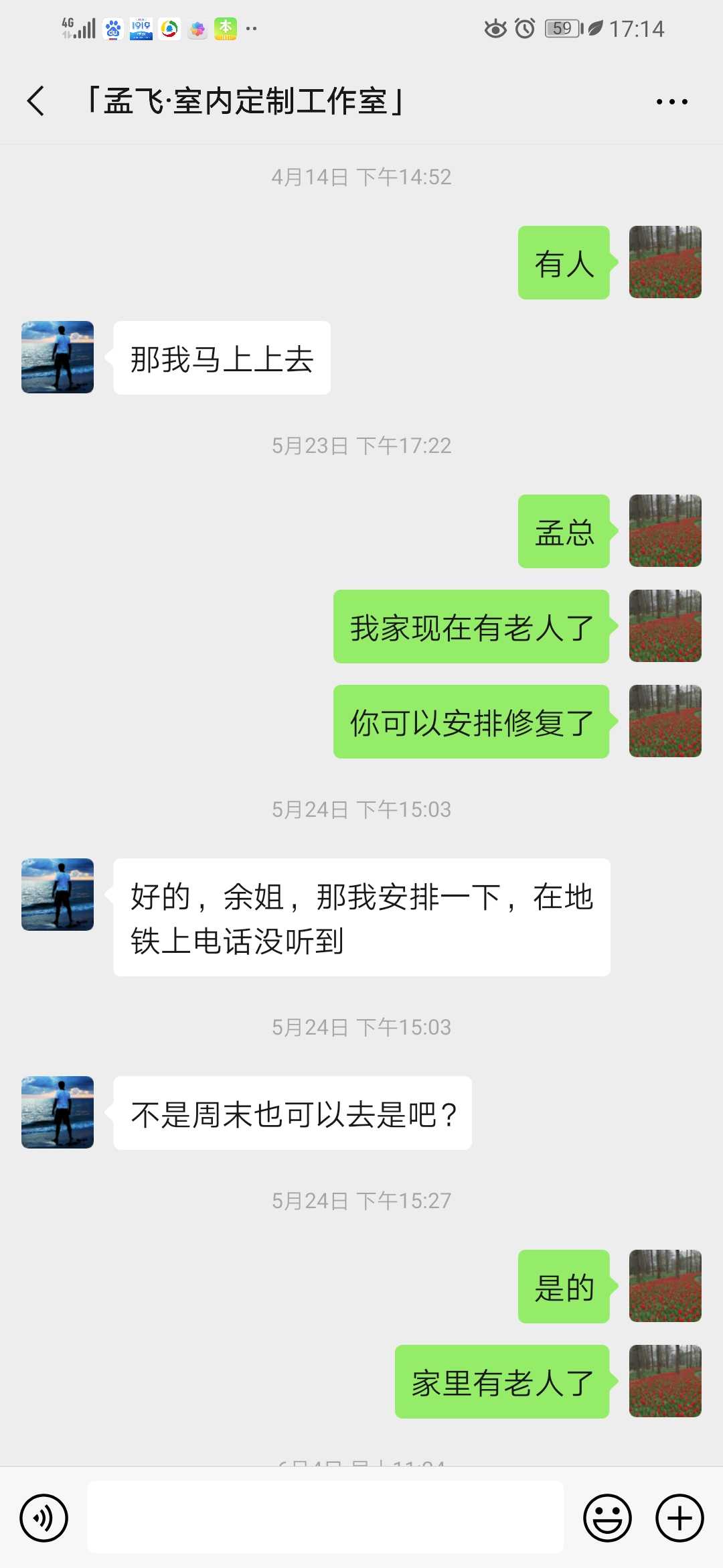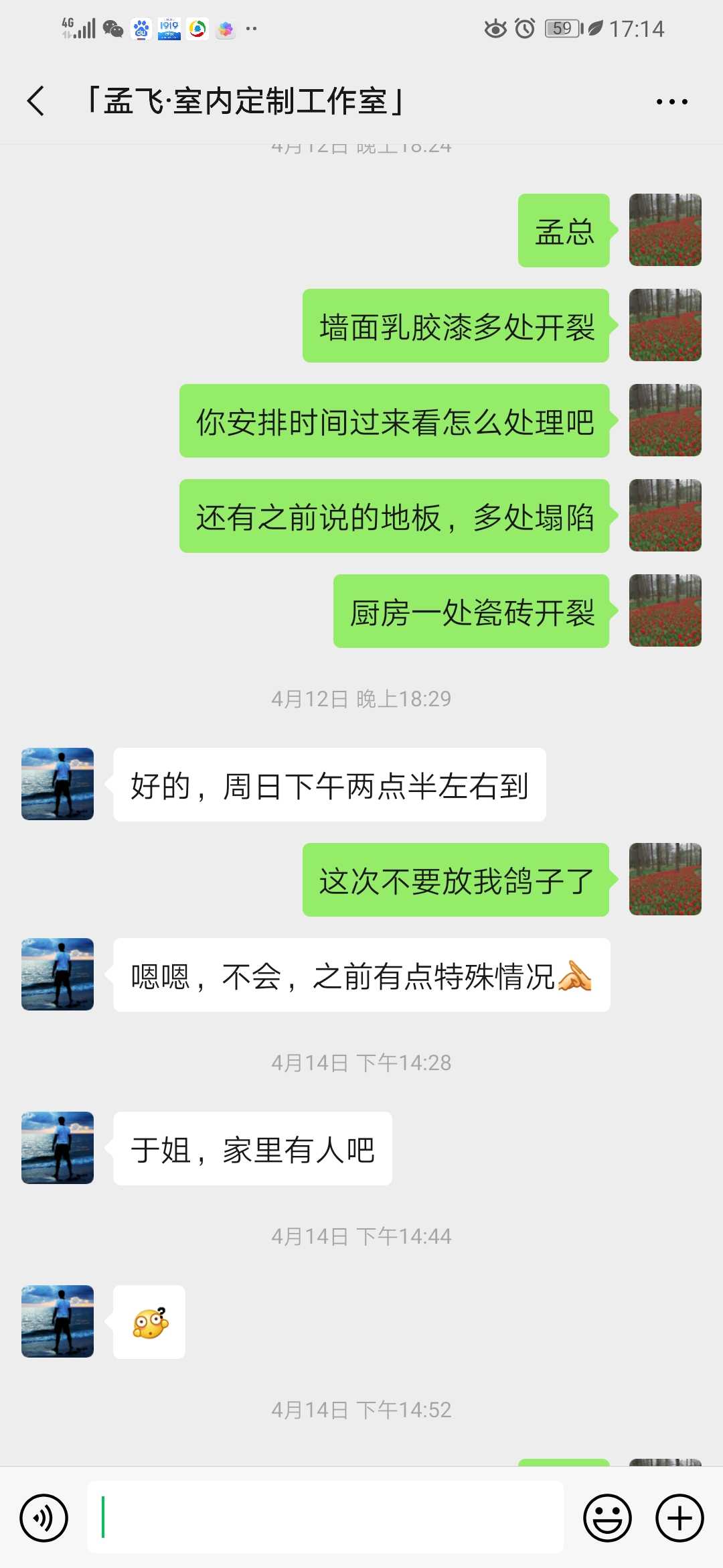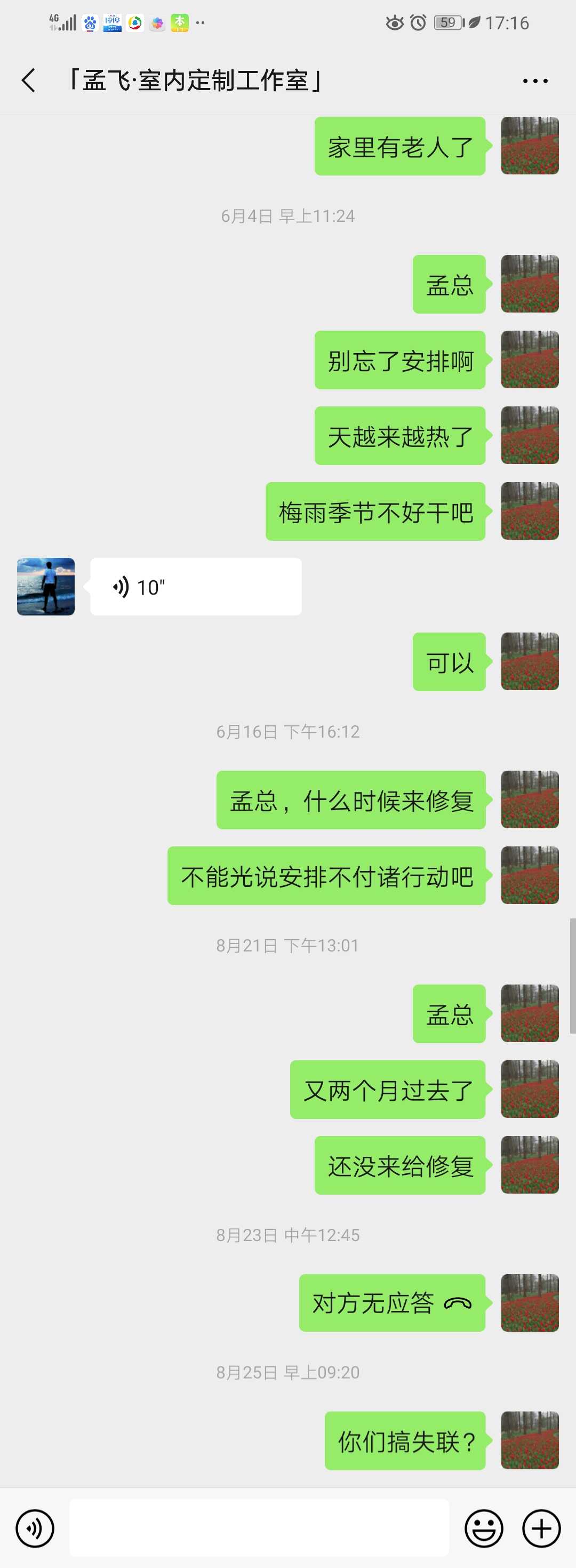 2019年4月份开始就反馈乳胶漆墙面多处开裂,紫诣品装饰负责人孟飞来看后答应安排人来修复。到了预定的时间,没有工人来,打电话问才说工人有事来不了了,安排到下一个时间,又到了预定时间还是没人来,再打电话问紫诣品装饰孟飞说以为工人来过了。就这样折腾了几次都没能上门来修复。到了8月份,打电话不接,微信也不回。