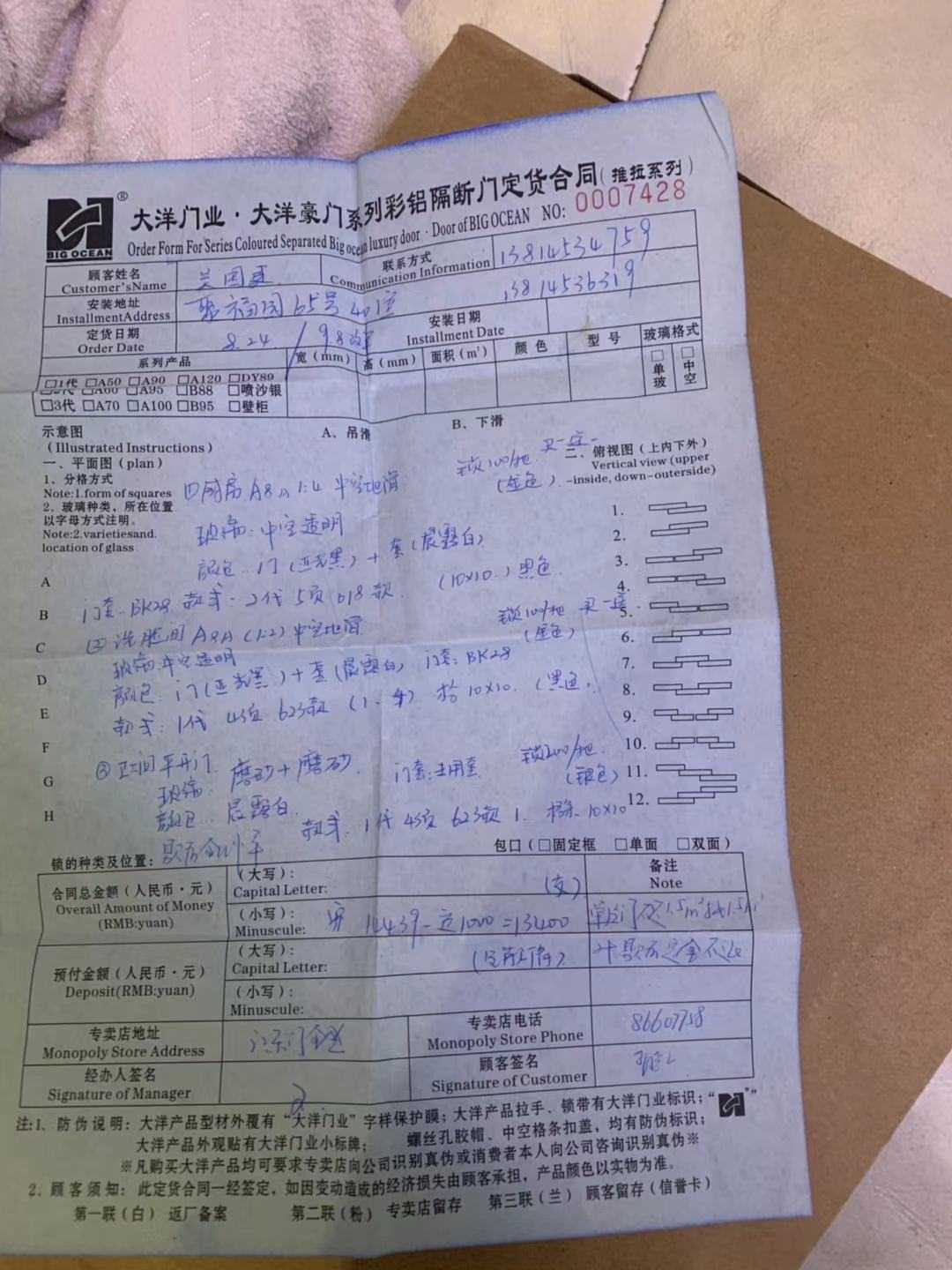 2019年8月在展会预定了南京建邺区金盛国际家居的大洋门业,之后测量师傅上门测量,9月去门店交钱下订单,当时销售承诺尺寸没有问题(手机有语音保存),10月底送货安装时安装师傅发现门套尺寸有问题,我们要求厂家安排重新测量,厂家表示测量师傅跟安装师傅第二天无法到场,中间一个月家人外出,12月2日厂家答应测量师傅跟安装师傅同时上门,可还是只有安装师傅前来(小区监控可以提供),安装师傅表示门无法安装,家人很生气,后来测量师傅过来,过来后就强词夺理,跟家人吵架,我先森过去安抚老人,一个房间的两个移门,一个需要切掉地板才能安装,一个需要加块地板才能安装,明显测量误差,并且其中一个门套无法包住瓷砖,测量误差更加想而易见,测量师说跟他没有关系,是我家门太宽,我想问下号称测量师的职责是什么,他在订单之前亲自量过尺寸,现在出现问题却来怪我家的户型,简直无语,还说重新做宽门套需要我们掏钱,原先作废的门套也不退,这是什么霸王理论,后来销售打电话给我们沟通让我们跟测量师一人承担一半,我们拒绝,销售表示12月3日有负责人跟我们联系,但一直没有电话,毫无诚信。恳请政府部门能为我们消费者提供保障,打击不良商家。如果有需要请家装委员会派人亲自上门帮我们勘察现场,谢谢。