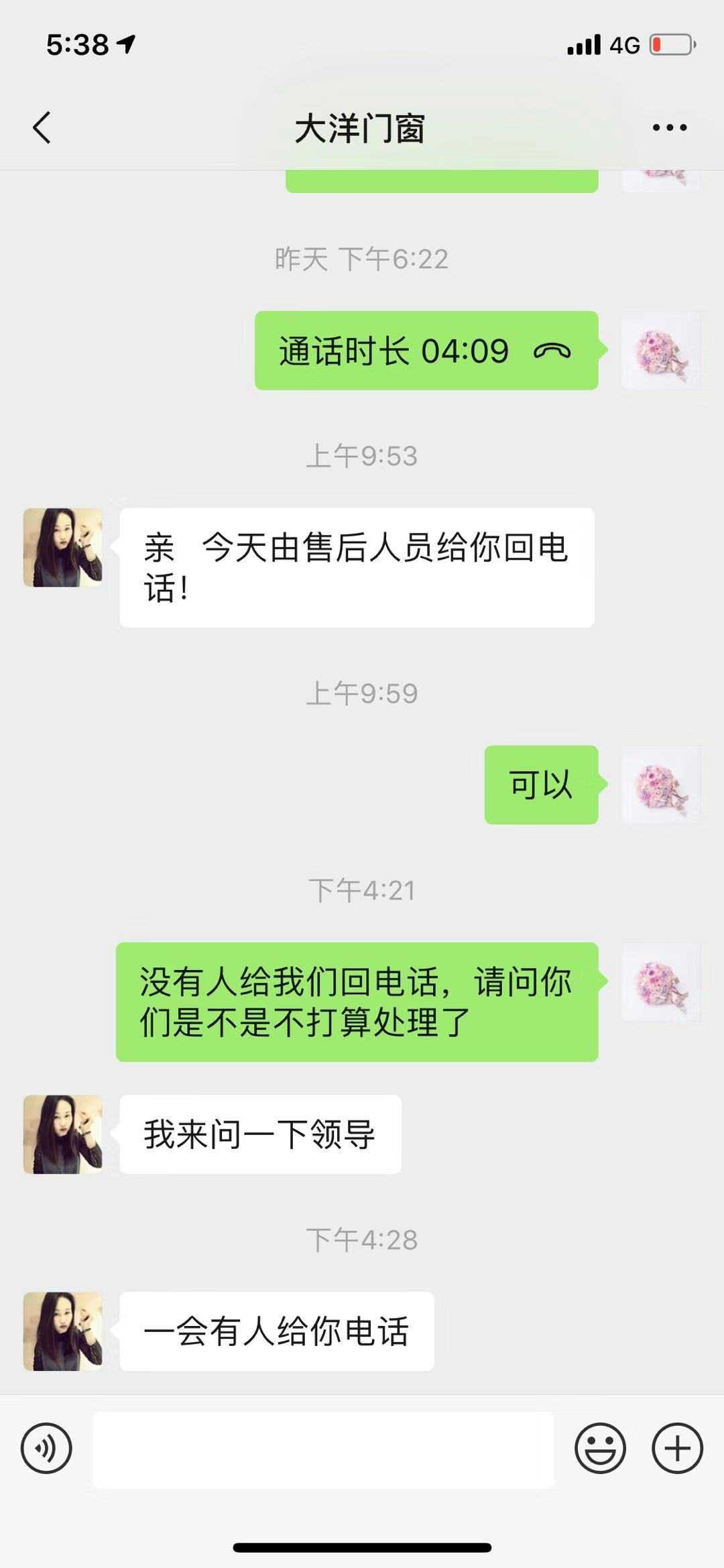大洋门店人员已和业主进行沟通,答应投诉站一定会妥善处理,让我们放心。投诉站持续跟进 | 2019-12-04 |
