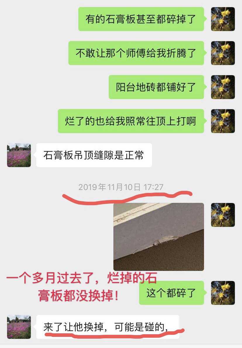 7、装修公司推卸责任,设计师离职(装修公司负责人电话说的是“业主打柜子,肯定要出图纸,图纸经业主沟通、签字确认后,木工才能现场实施,设计师不出图纸,你算什么设计师,所以设计师被他赶走了)所有不合格产品,全部要求客户全款买单