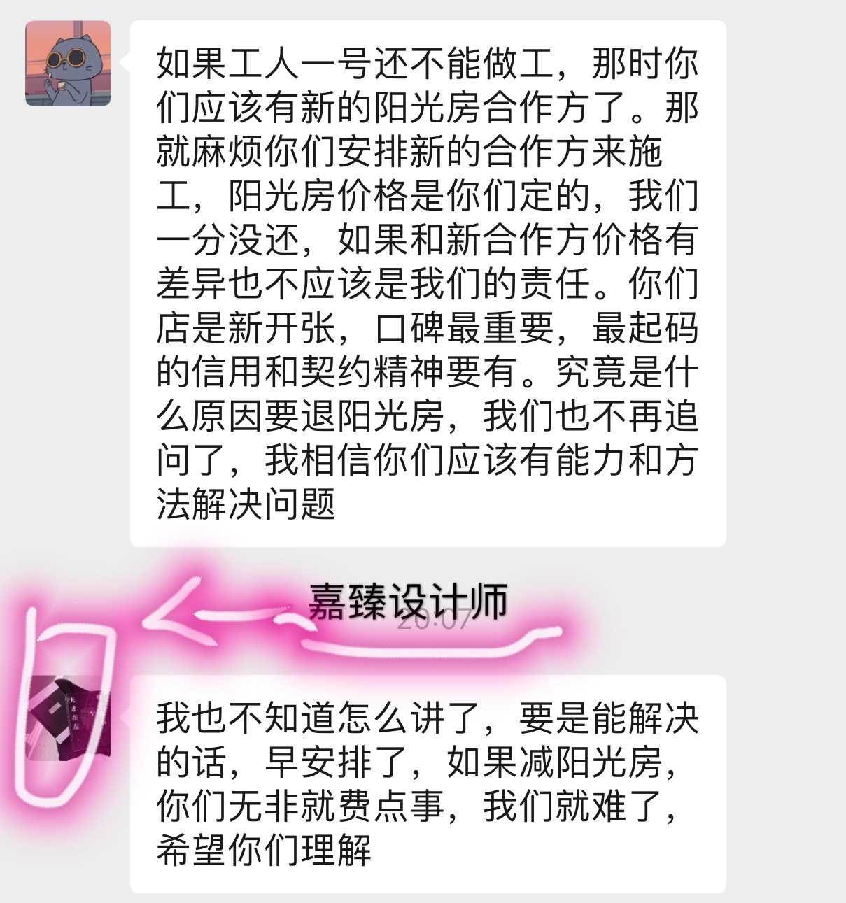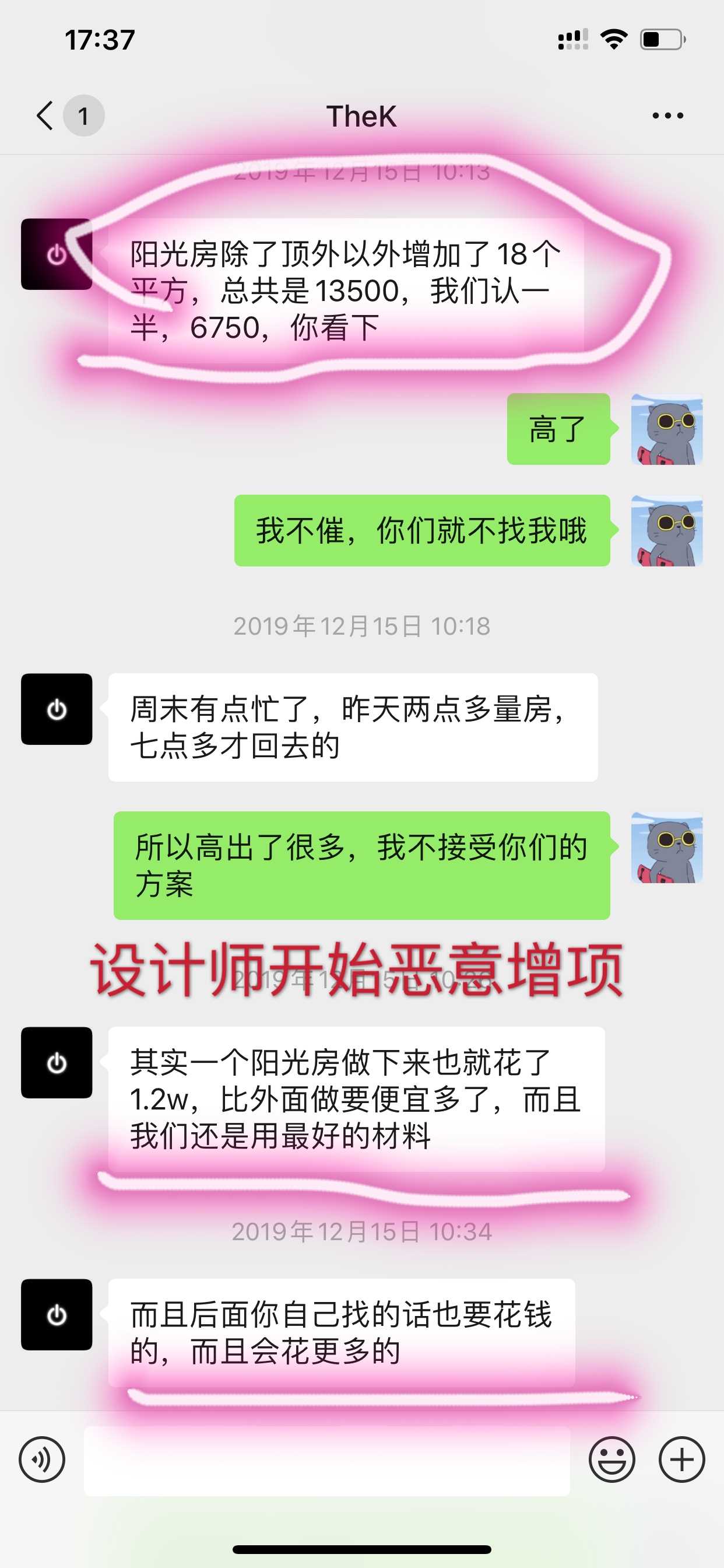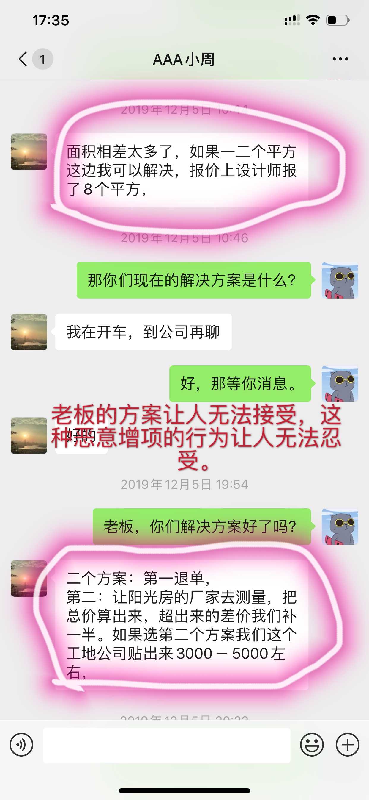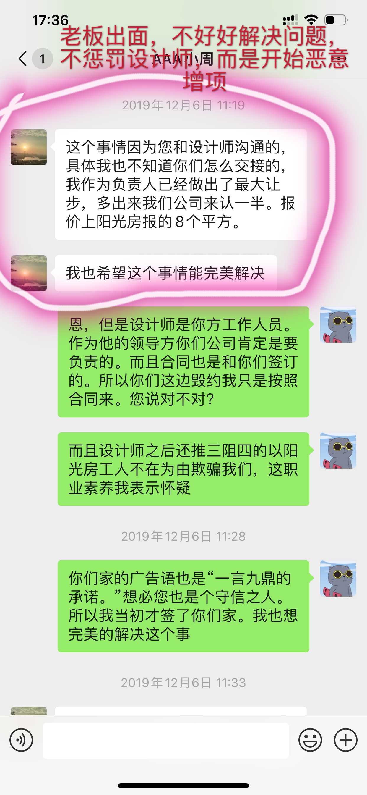 遇到的问题:装修公司工作失误,不愿积极解决问题,反而拖延时间,欺骗消费者企图蒙混过关。同时给出的解决方案不合理:方案一 我退单阳光房项目,他们只做露台项目并且没有任何补偿行为。方案二 设计师少算18平方造成的差价双方各承担一半(核算下来我仍需支付的金额与其他家26平方报价几乎一致)。方案三 直接退全单,但并不遵守合同之中单方面毁约的赔偿条款。也未提及两千元定金的退还。这三种解决方法皆为绑架消费者的霸王条款,我无法接受。