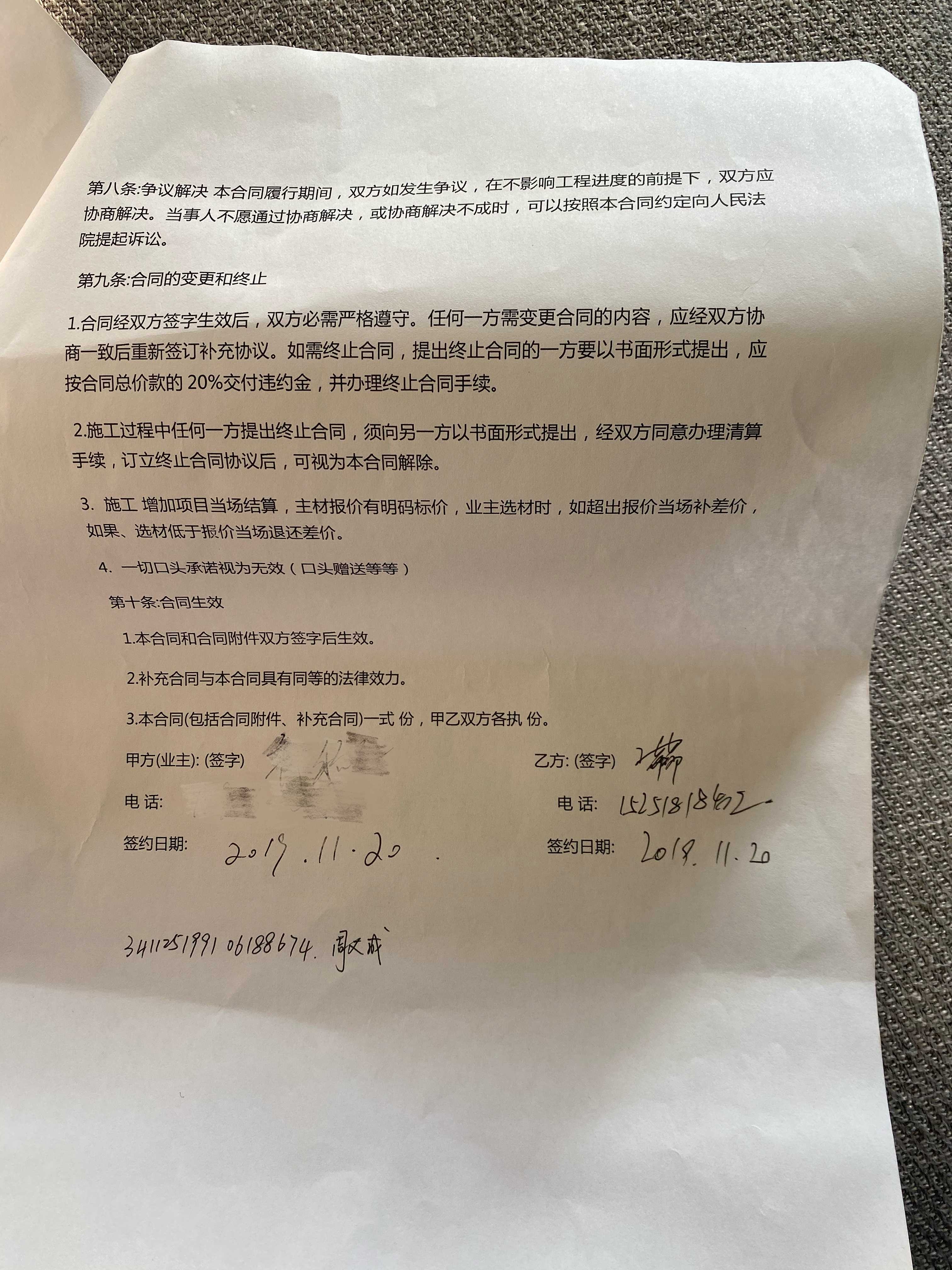 2、因嘉臻装饰的原因导致不能按原合同进行施工,属于单方面毁约,应按照合同约定,由嘉臻装饰一次性赔付工程总款贰万元的百分之二十,即人民币肆仟元整,为违约款进行赔付。