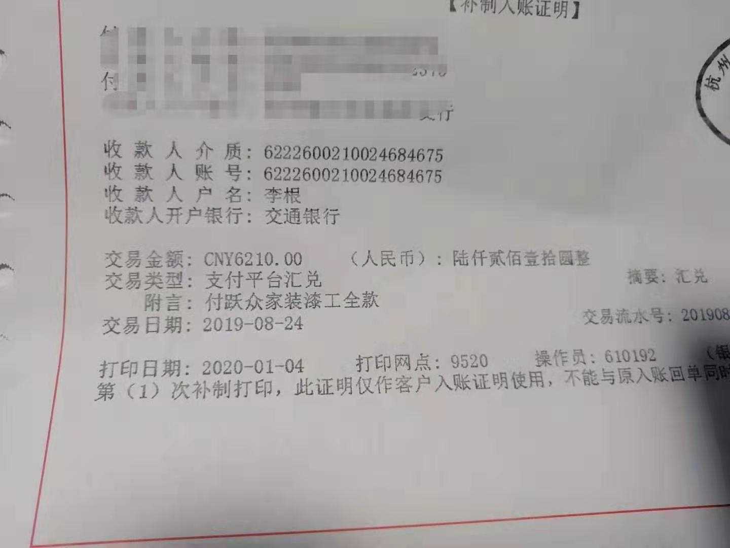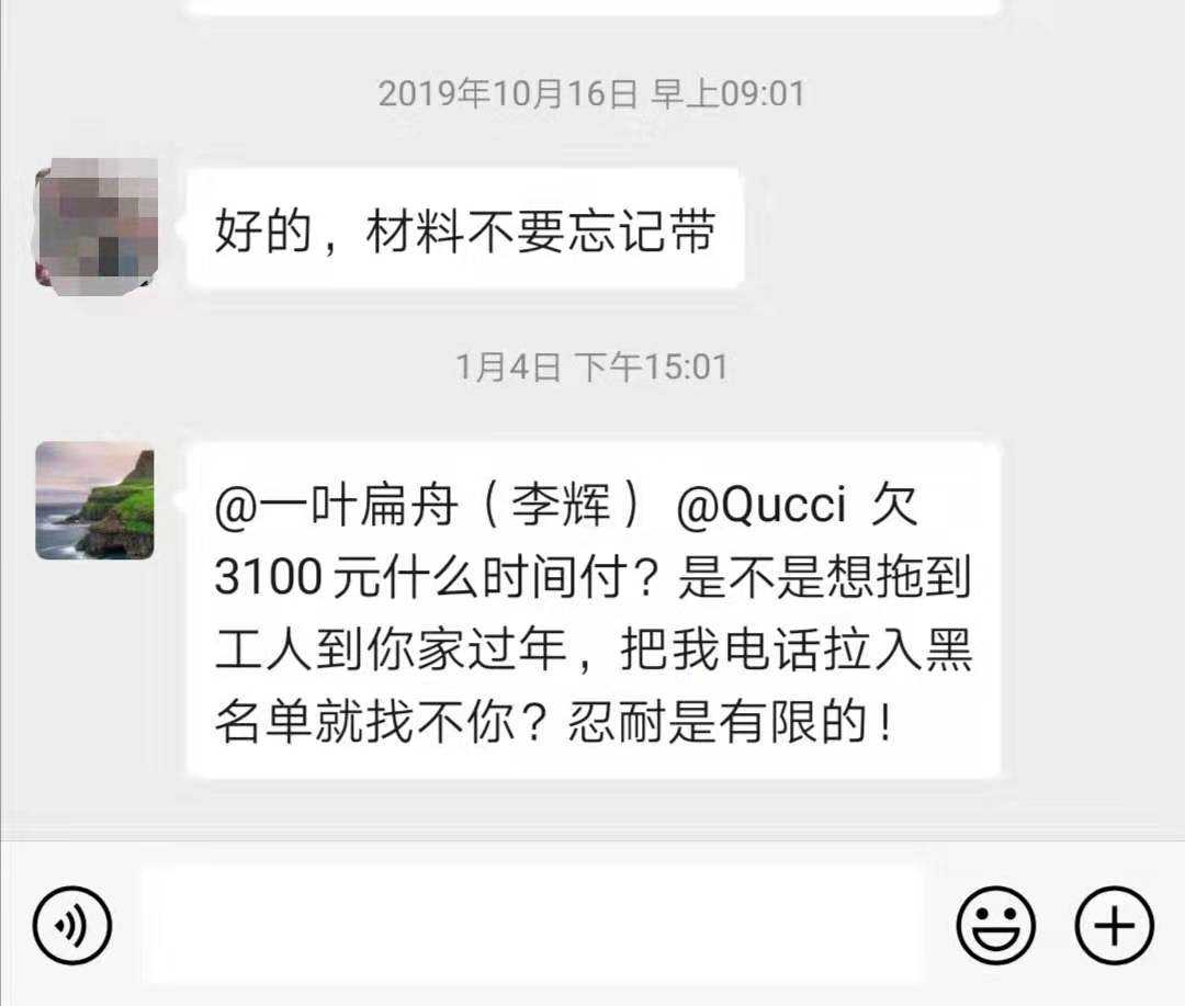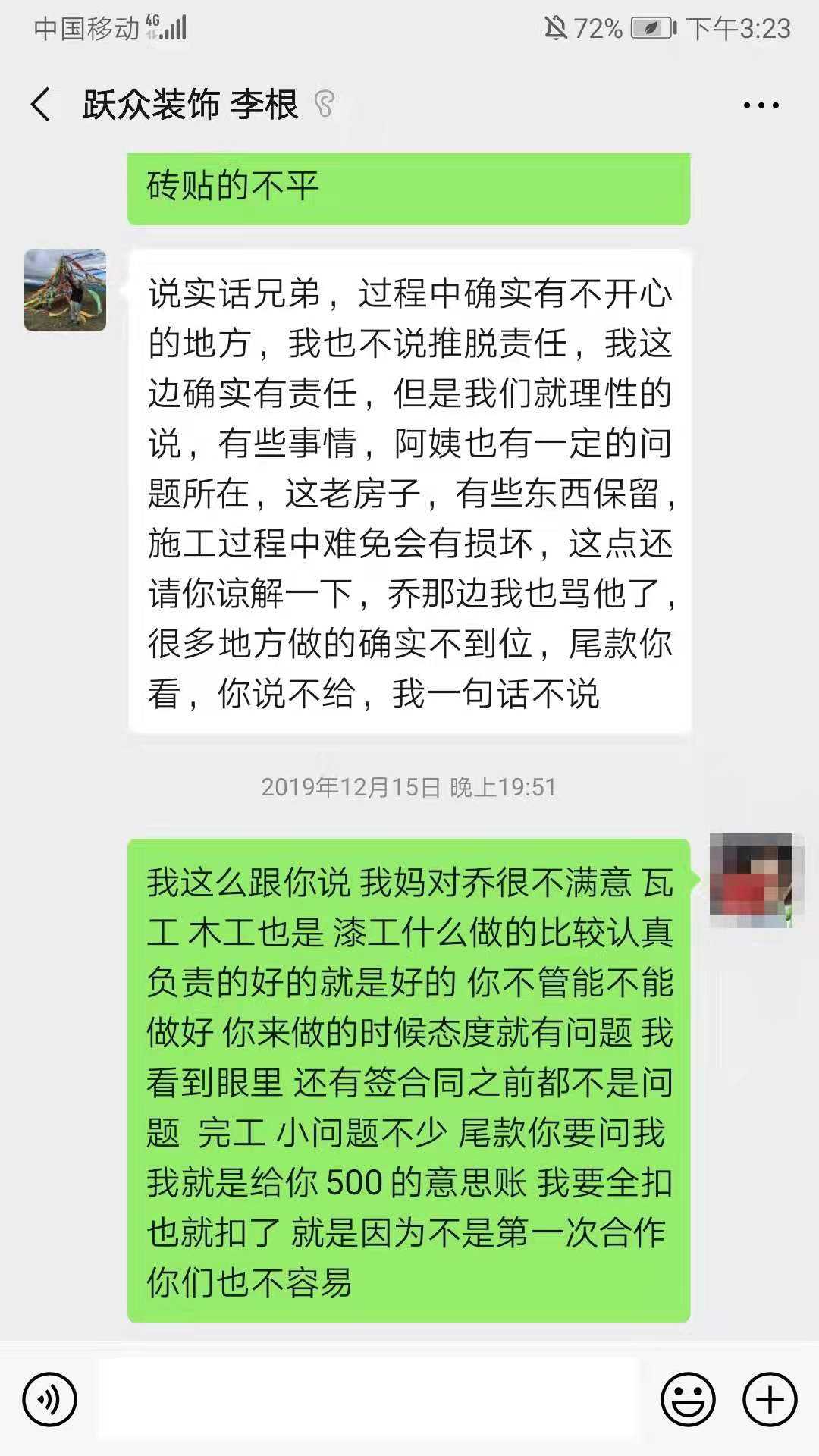 与跃众装饰装修合同在8月26日结束后,至今未按照合同找我签订完工验收单,以及隐蔽工程保修单。2019年12月15日,合同签订方,跃众装饰工程有限公司法人李根与我微信沟通尾款问题,说是尾款即使1分钱不付也没有问题,他们确实存在很多问题。但是却在2020年1月3日下午包工头乔启亚,打电话恐吓我们未付清3100元尾款,以及在2020年1月4日微信继续恐吓,李根否认答应我尾款不付的事实(微信截图均以保留),乔启亚可以代表他们跃众装饰工程有限公司。