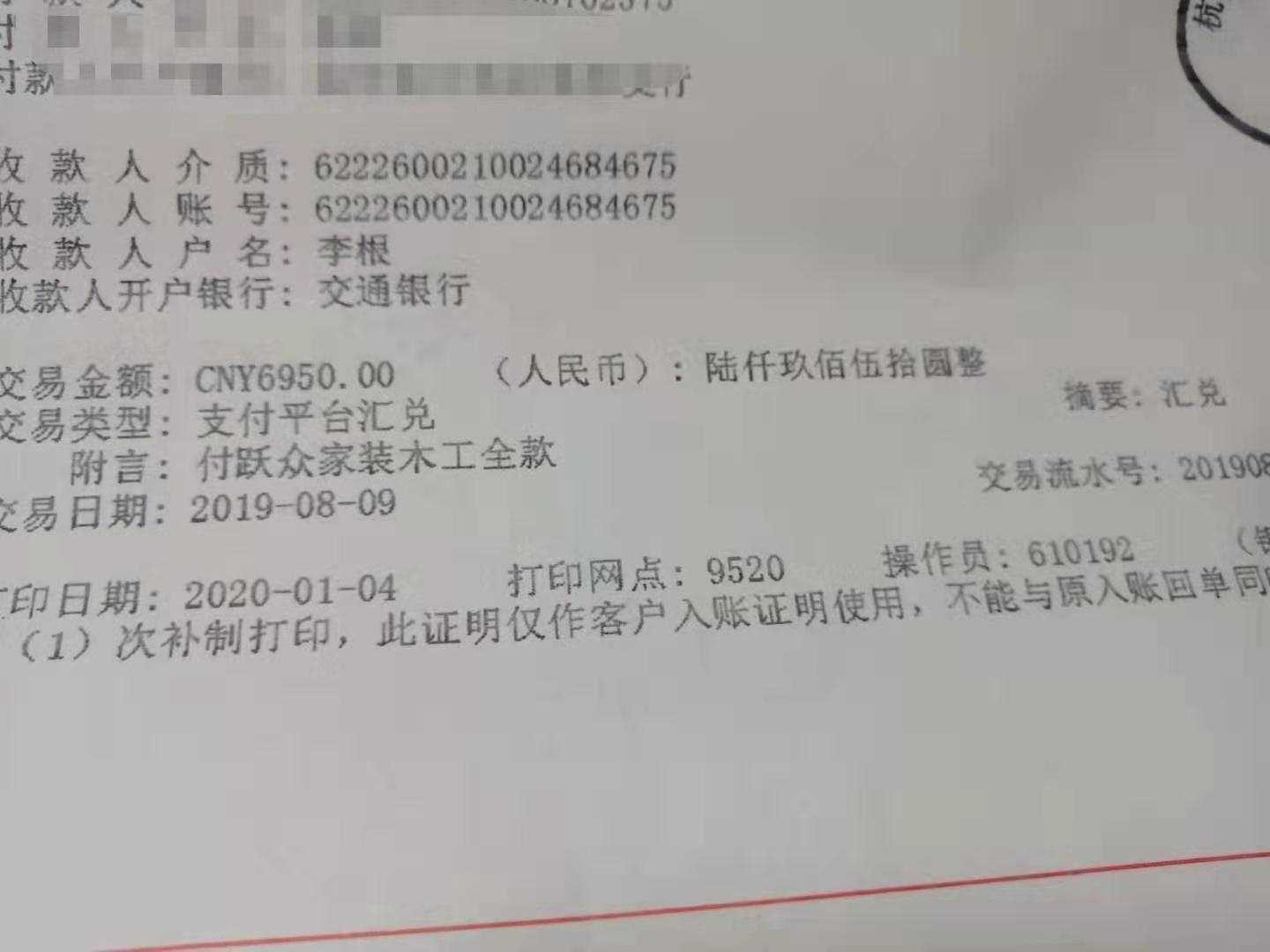 南京跃众装饰工程公司,2019年5月26日与我签订装修合同,竣工日为2019年8月26日。截止到今天我总计付款7次,第一次21700元装修首付款,第二次装修水电全款9300元,第三次水电改造增加款项2400元(在装修公司要求下增加),第四次瓦工工程全款10458元,第五次木工工程全款6950元,第六次漆工工程全款6210元,第七次尾款500元(扣除2600元)。