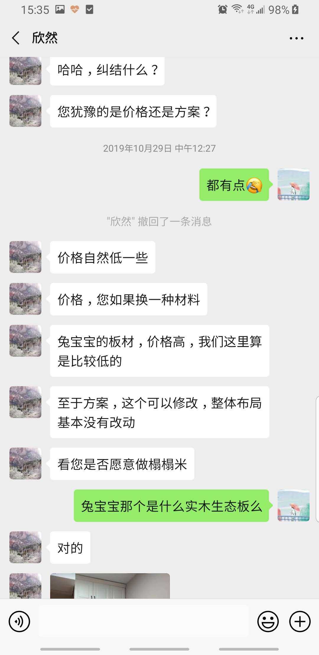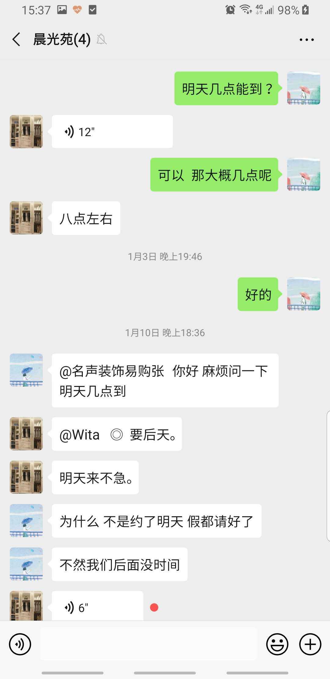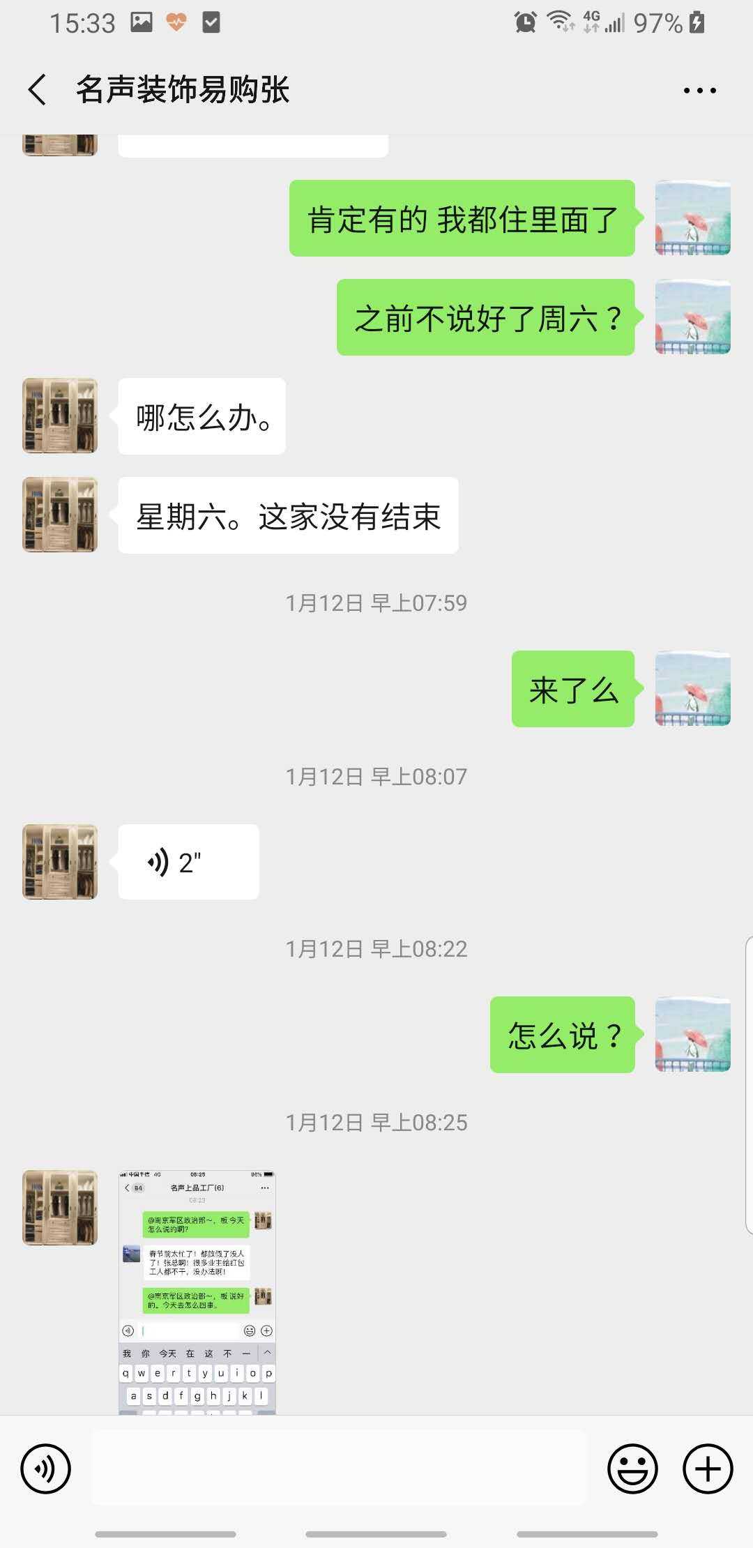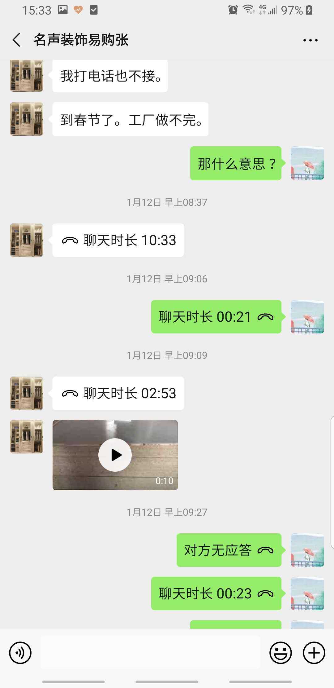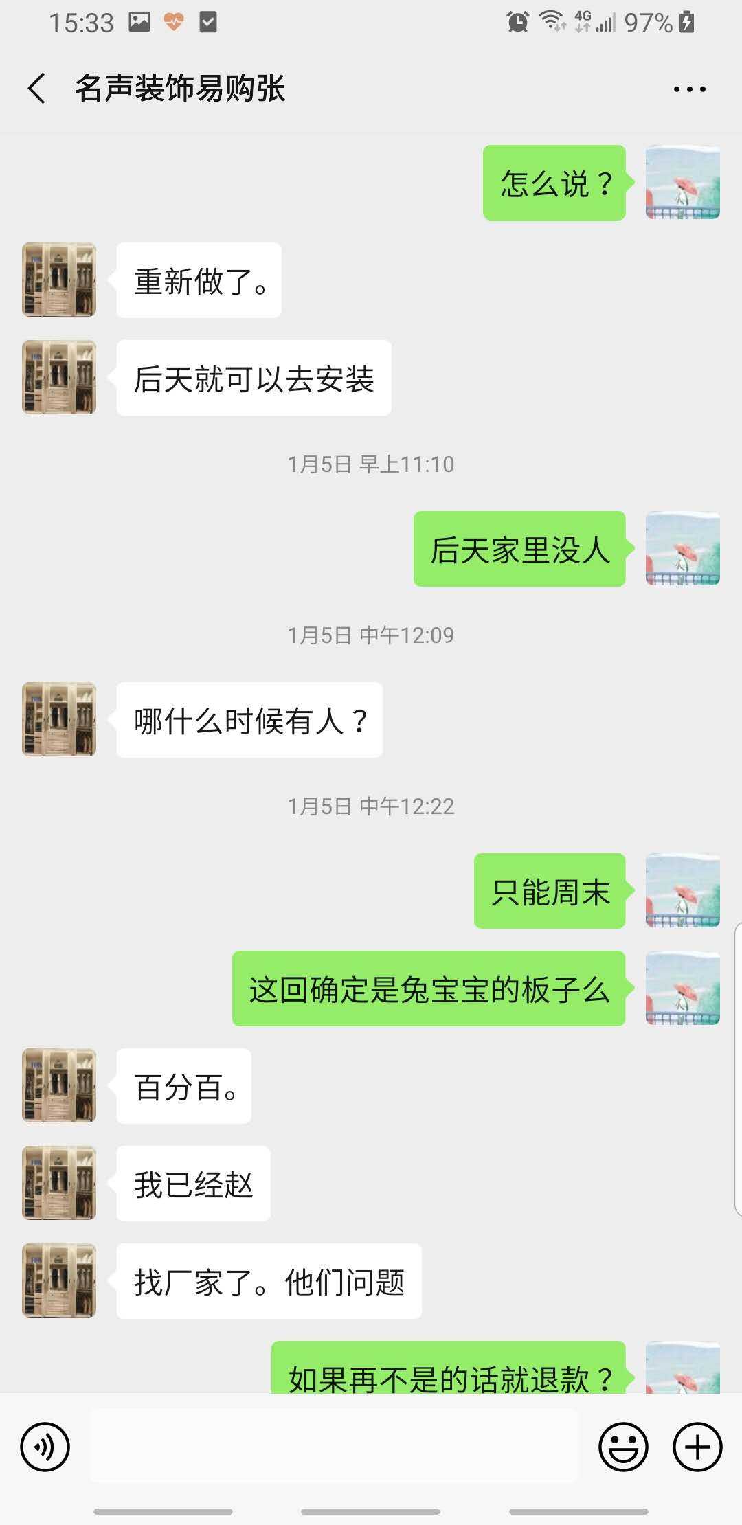 一月四号 上门安装? ?发现板材不对? 不是兔宝宝? ?说拉回厂重新做? 承诺如果再不是兔宝宝板材就退款 承诺下周上门安装