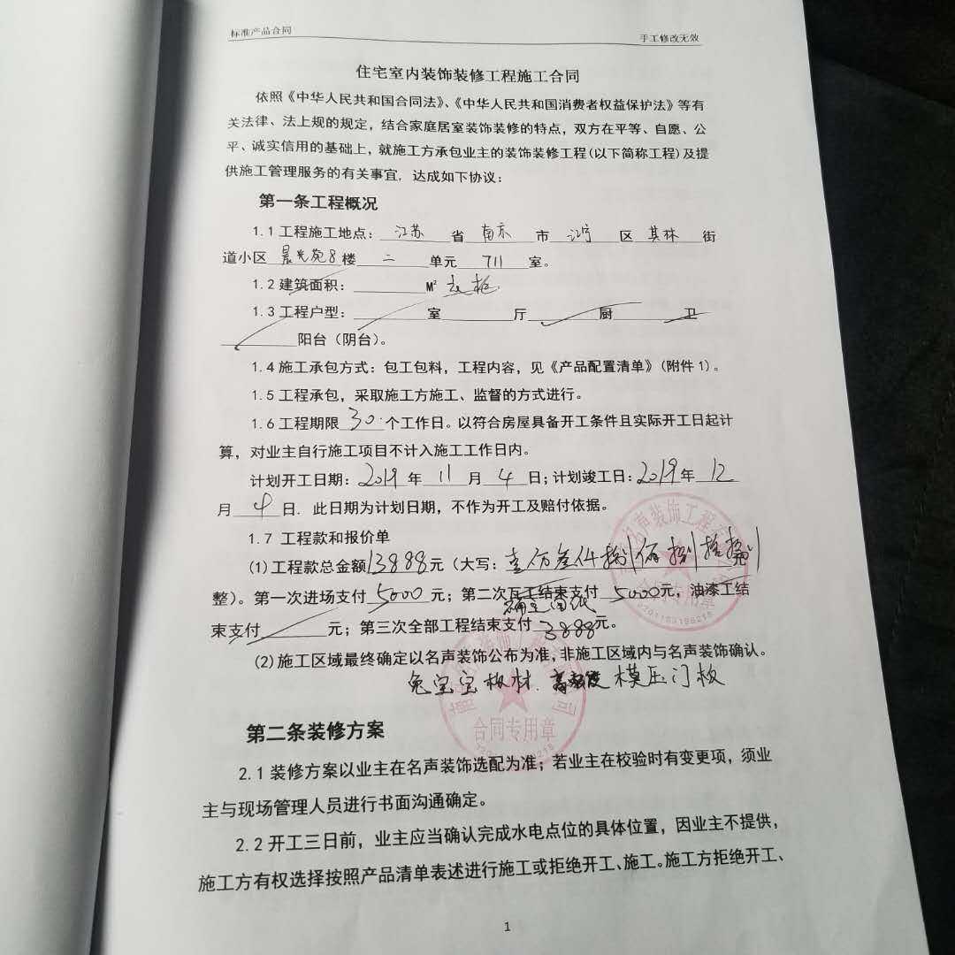 19.11月与南京名声装饰工程有限公司签订合同一个柜子和榻榻米, 并支付了订金和大部分款项共1万元,合同上承诺兔宝宝板材 , 周末安装 ,合同约定12月4日交付 。?