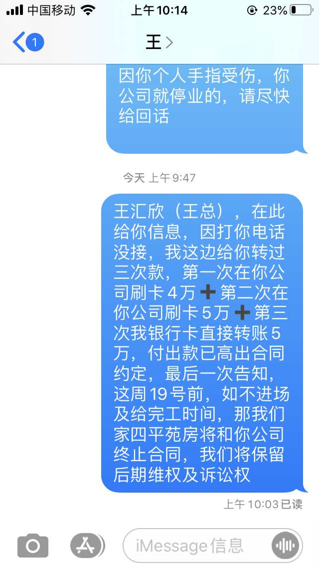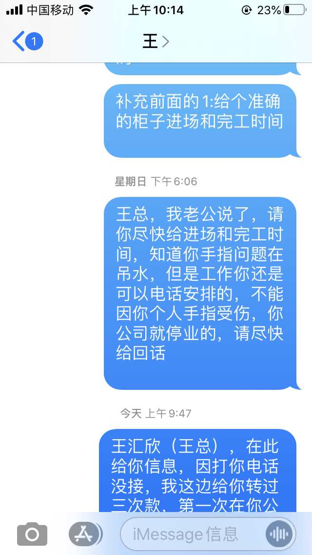 2019年8月和南京圣哲装饰有限公司签订合同,当时明确年前完工,王汇欣电话及到他公司面谈都说可以完工,我们年前就已支付工程款80%,,事实是春节前工程就做了一半,年后因疫情,我们三月开始联系王汇欣本人,他就说明天进场后天进场,圣哲装饰一天天往后拖,他们公司也是大门紧锁,现在联系不是公司发人王汇欣,请贵部门帮忙沟通