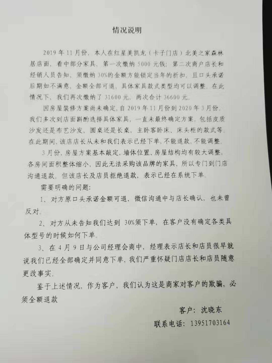 北美之家森林店魏总表示,希望上门测量后再商量。业主已经签订协议,北美之家也已下单,魏总说需要上报处理。投诉站跟进 | 2020-04-21 |