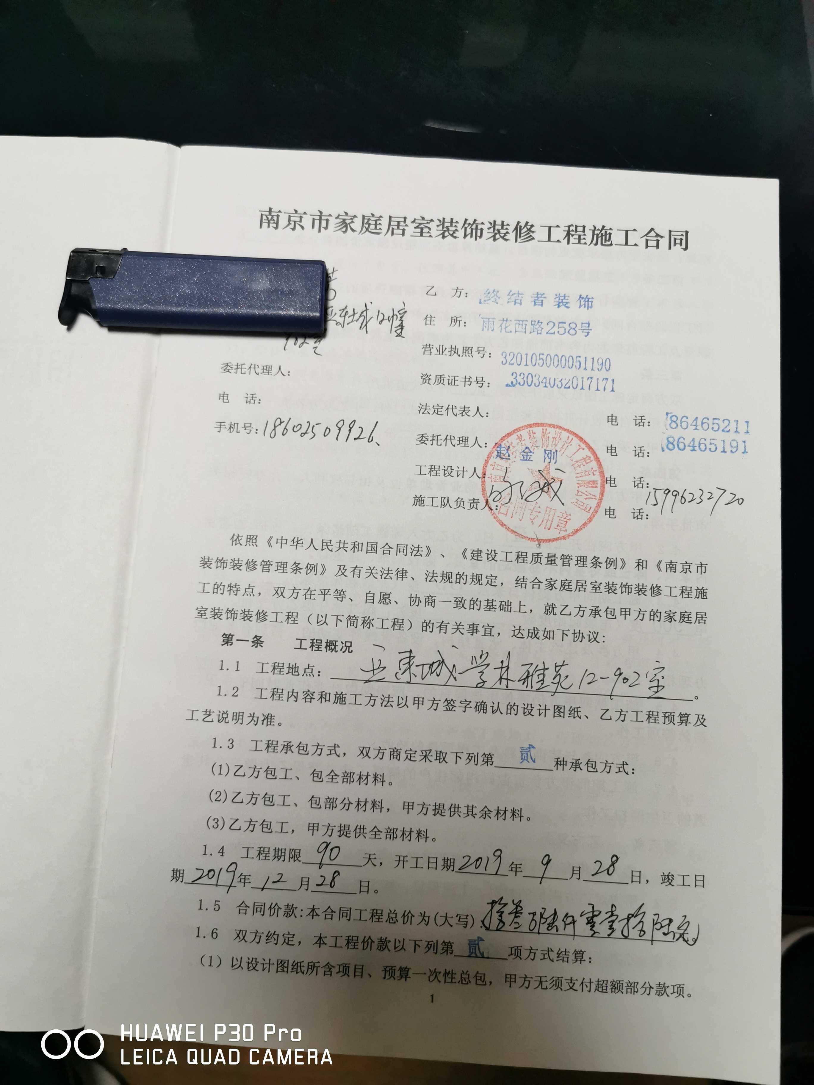 本人于2019年9月28日与终结者装饰签订住房装修合同 ,装修亚东城一处住房,合同期限2019年9月28日至2019年12月28日。现工程完工日期为2020年4月15日。 合同内标注延期赔付50元一天(此处延期赔偿存在霸王条款),但是有个补充协议(字迹不清)当时没仔细看内容是延期800封顶(照片中会有) 另装修过程中,本人发现装修公司未按合同中承诺的美国红橡实木门(说美国红橡是个品牌)进行安装,有欺骗消费者行为(见照片) 要求对终结者装饰做出处罚并对消费者进行一次性赔偿!崔负责人025-86465211,86465191。电话是设计师。