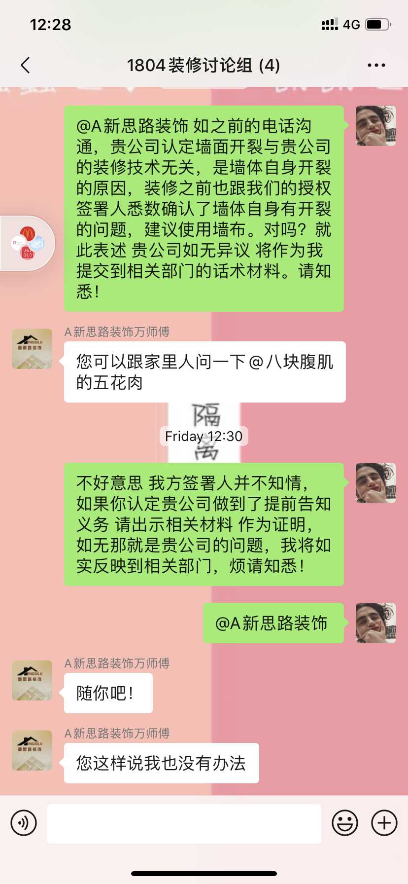 本人的住宅给南京新思路装饰设计工程有限公司装修, 装修不满一年 室内墙面多处开裂!!!于2019年10月向南京新思路装饰设计工程有限公司公司反映,该公司负责人和我爸前去现场沟通,该公司认为是墙体自身开裂的问题,与该公司的装修技术无关,说后期修补也没用还是会开裂,要我们找开发商,因为过了维保期,开放商也不管,但就此问题 我只能找装修公司,因为房子在他手上装的,没有人会希望自己辛苦一辈子买的房子有裂缝,不管用什么办法都要把这墙填平!此后装修公司并无维修意图,又碰上疫情原因一直拖到现在,我认为春暖花开了是时候修补了,于是我微信联系该公司负责人,负责人毫不理会!态度恶劣!直到我打电话给他 他告诉我墙面修补了也没用还是会裂!直到我说我要到有关部门投诉该公司 他的微信才回复到 随便你吧!就此 我非常愤怒!该公司毫无契约精神!欺骗消费者!搞豆腐渣工程!
