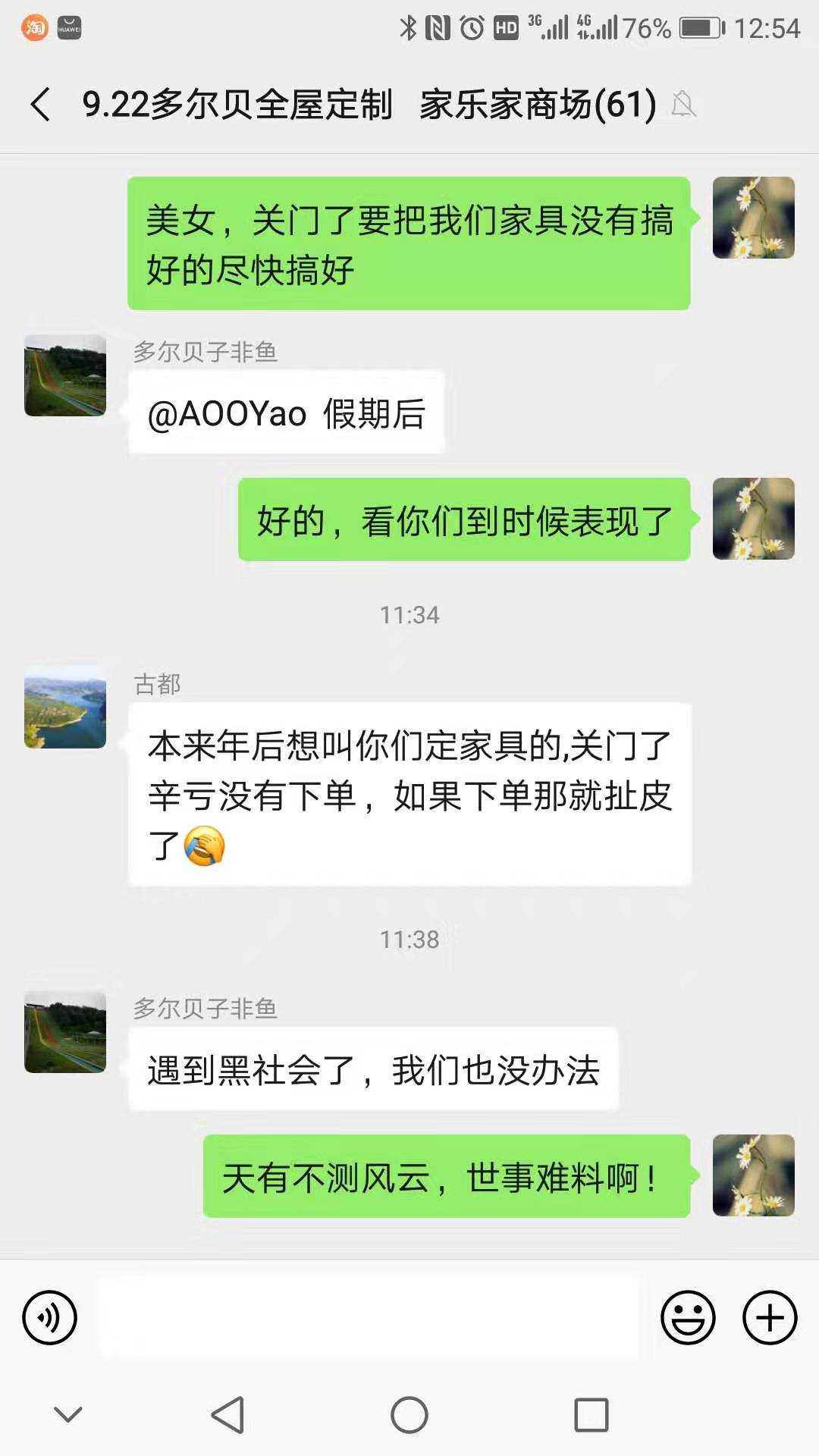 2019.10.3号签单交款23600元定制家具,讲好45个工作日完工,到45个工作日还搞的一塌糊涂,年前就向家乐家商场投诉,说年前完工没有完工,年后疫情没好意思去,3月去再次找到家乐家商场负责人在场多尔贝定制家具承诺4.15号完工,可是多尔贝4.12号就关门倒闭了,商场也不通知我,现在是次卧有一扇门返厂,冰箱柜玻璃门铰链反弹器都没有装,书柜二扇玻璃门没有装,四幅挂画没有到位,吧台柜尺寸不合适,量过尺寸工厂重新做,全部家具没有打胶,我现在要求把上面全部了尾。吧台柜总共7657元要求退款给我,我不相信多尔贝说话了,不讲诚信,一个屁三个谎,如果不能了尾不行把他们搞家具的全部拆走退我23600元,我有他们负责人冯君去年12.29号写的春节后二十个工作日搞不好就退款,下面是交款凭证和他们承诺书聊天记录,还有好多资料传不上去,如果需要联系我,谢谢!