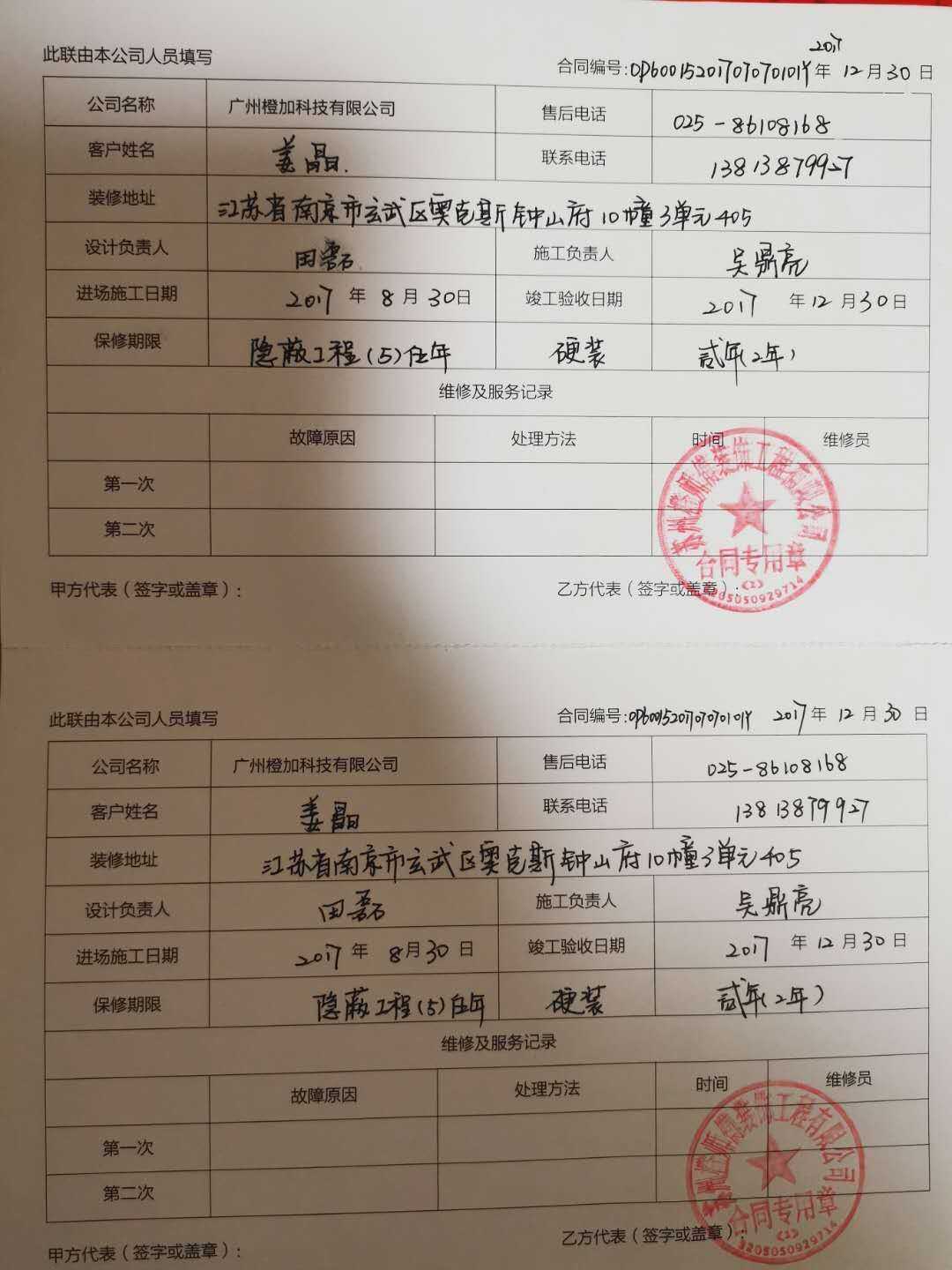 2017年姜晶(甲方)与橙家(乙方)签订合同后装修后,乙方负责装修。一年后2018年8月我们收房入住,入住后就发现客厅和主卧墙皮脱落发霉,地板发黑,甲方找乙方维修。乙方维修后不到半年又发现客厅墙皮脱落、地板发黑。我们再次找乙方维修,被告知因为卫生间没做淋浴房导致卫生间漏水,于是我们自己花钱请原先装修的水电工人做了淋浴房、另做了卫生间美缝。可是维修后不到半年又发现第三次问题:卫生间木门角长蘑菇,儿童房靠卫生间一侧的墙皮、客厅靠洗手台盆一侧的墙体发黑脱皮。客厅和儿童房地板发黑。反复联系乙方维修,乙方南京公司已经倒闭。原先负责人也全部离职。我们投诉乙方广东总公司。对方一再拖延,从年前拖到年后。2020年3月终于派铺地板的师傅上门查看问题,可是无法找到问题原因。一再要求只是更换地板和粉刷墙面,不解决根本问题。有过前两次的教训后我们不同意直接更换地板,乙方就拖延不予解决,我们一再投诉橙家客服后,乙方最终寄来了地板,却不安排师傅上门维修。负责人赵勇13341399018电话打通一直不接。橙家客服4008070055也只登记问题,不主动解决问题。一拖再拖,现我们已经搬离奥克斯钟山府10-3-405,在外租房居住。现不愿意再让苏州橙师傅装饰工程有限公司负责维修,因为由于公司提供的地板和踢脚线市场上无法找到一模一样的,我自己找公司维修。