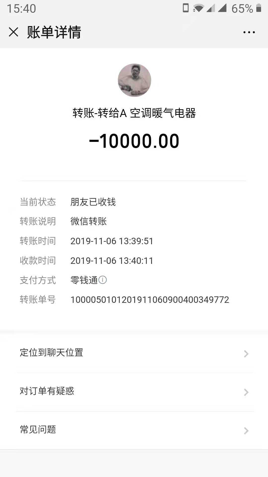 我们于2019年11月6日与南京香亿家冷暖设备有限公司监事宋前辉签订了安装(日立一拖四中央空调140外机2代)销售安装合同。且当日付清货款25000元,之后按照合同约定完成空调内机的安装及管线排布,但所有的后续工作(空调外机,控制面板,调试等)却停止了,并且负责人联系不上。已托南京公安出面协调,但依然无法解决。