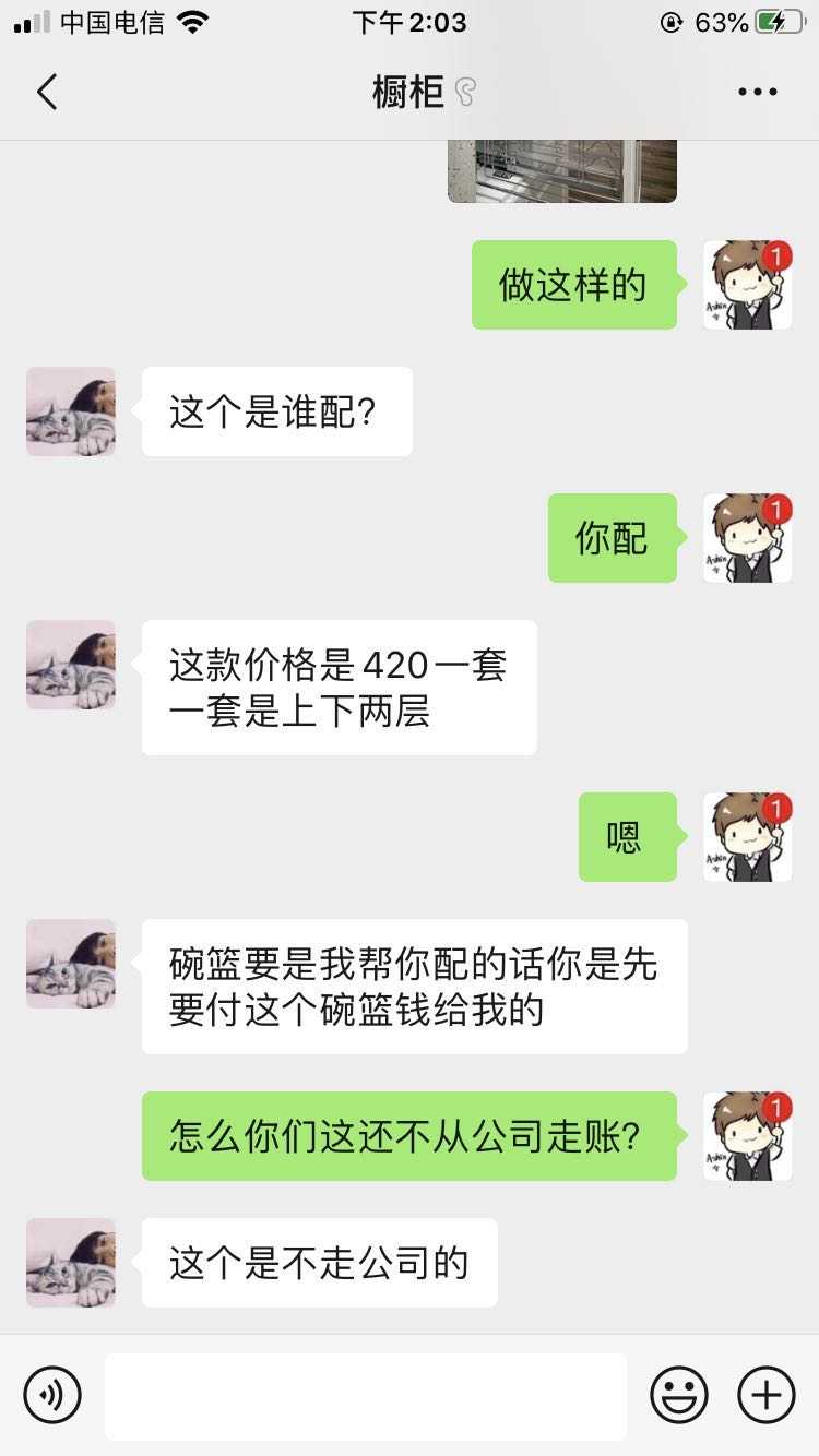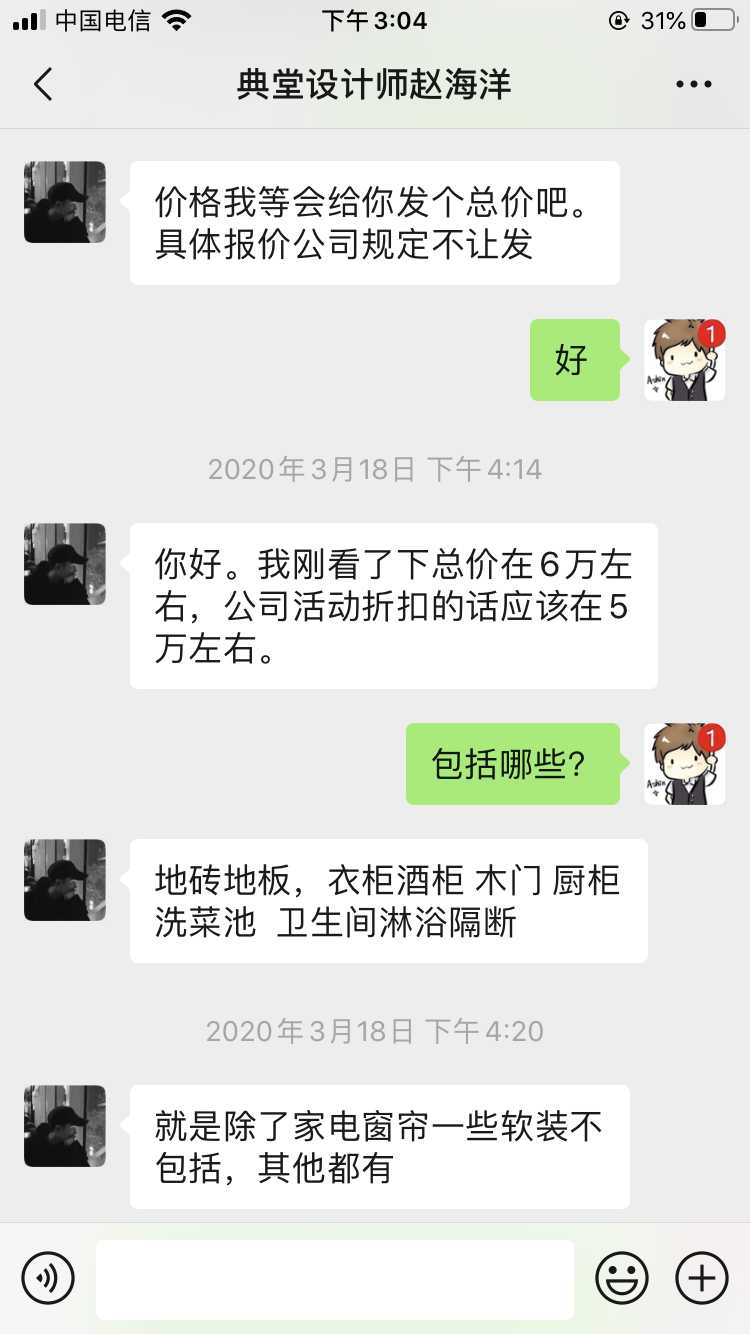 原本还有一个酒柜但装修人员说报价单上也没有 需要我加钱 我拿出与报价师的聊天记录 装修公司推说报价师已离职无法核实
