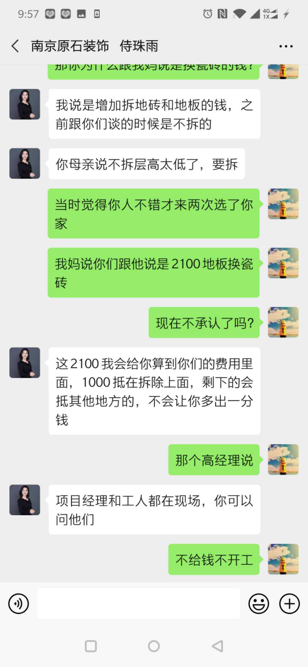 1、南京原石装饰公司拖延我们顾客的工期,4月15日交的钱,5月初我们去拆除做完了,5月底我去看和月初一样什么都没搞,和我们说工人太忙了没有时间来,让我们等等