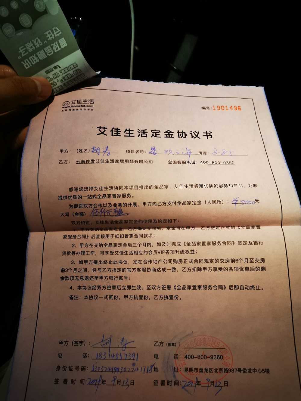 1.本人与艾佳生活于2019年9月13日签署《艾佳生活定金协议书》,刷卡交付定金5000元,根据协议第3条,申请全额退款无果至今。