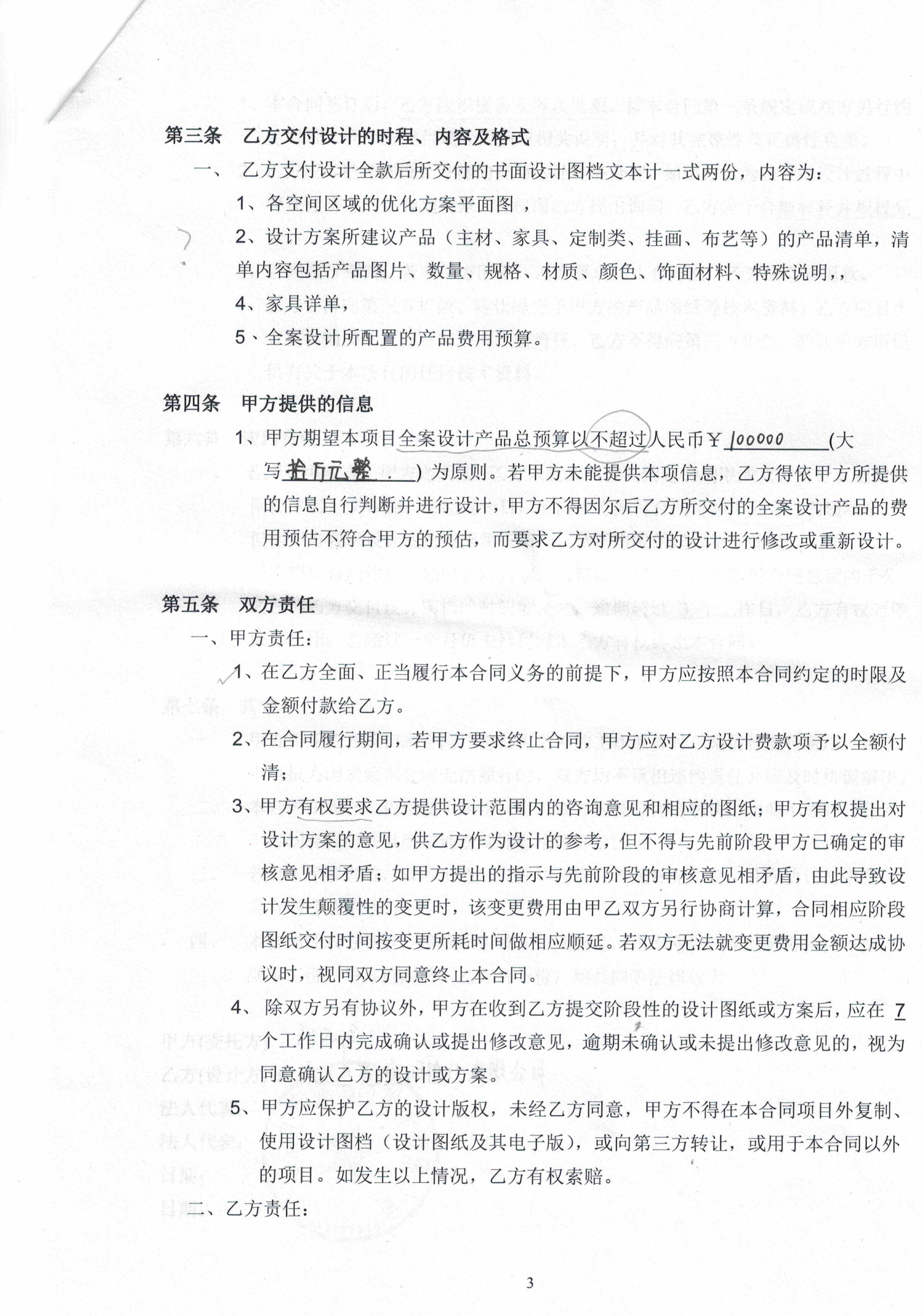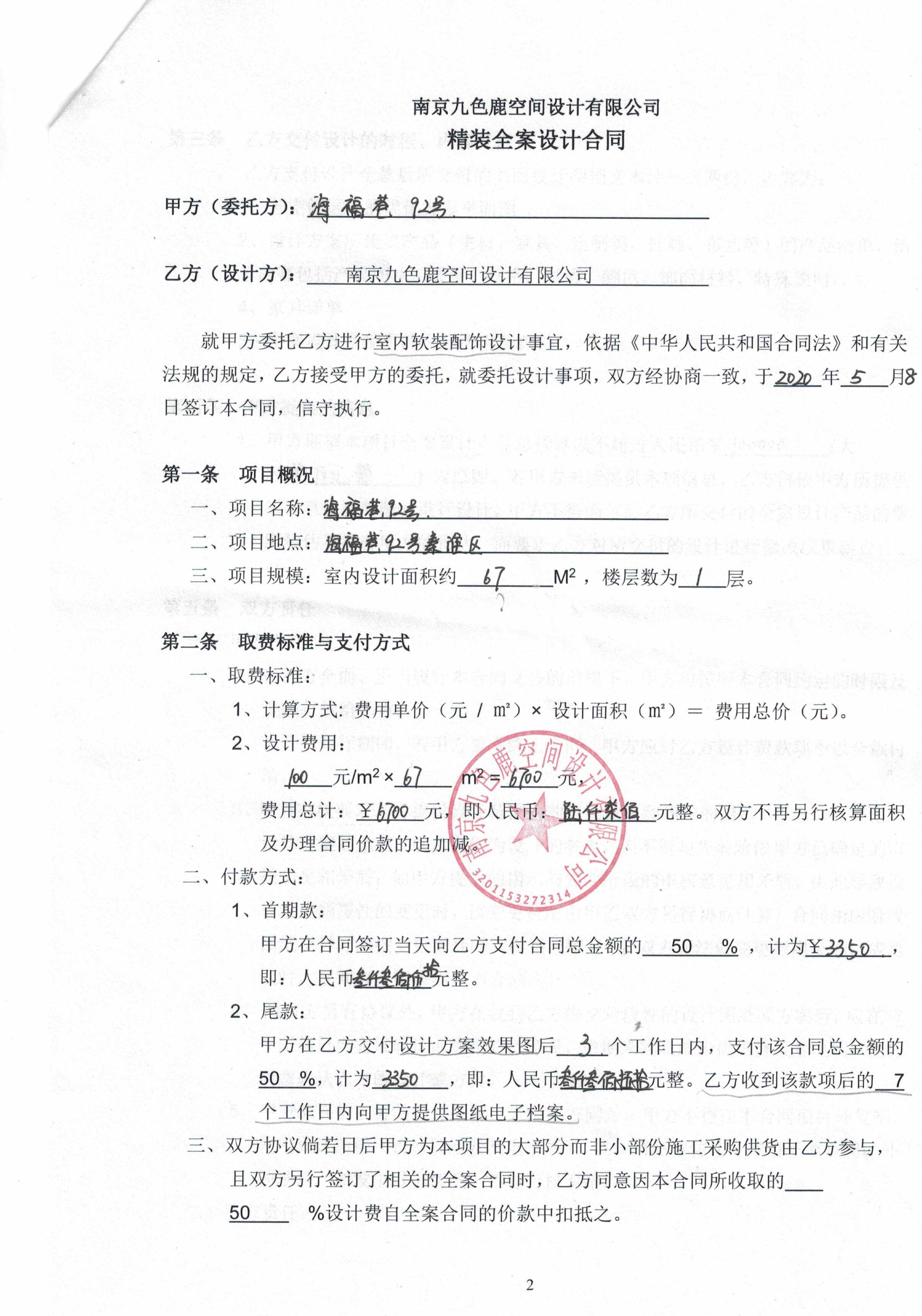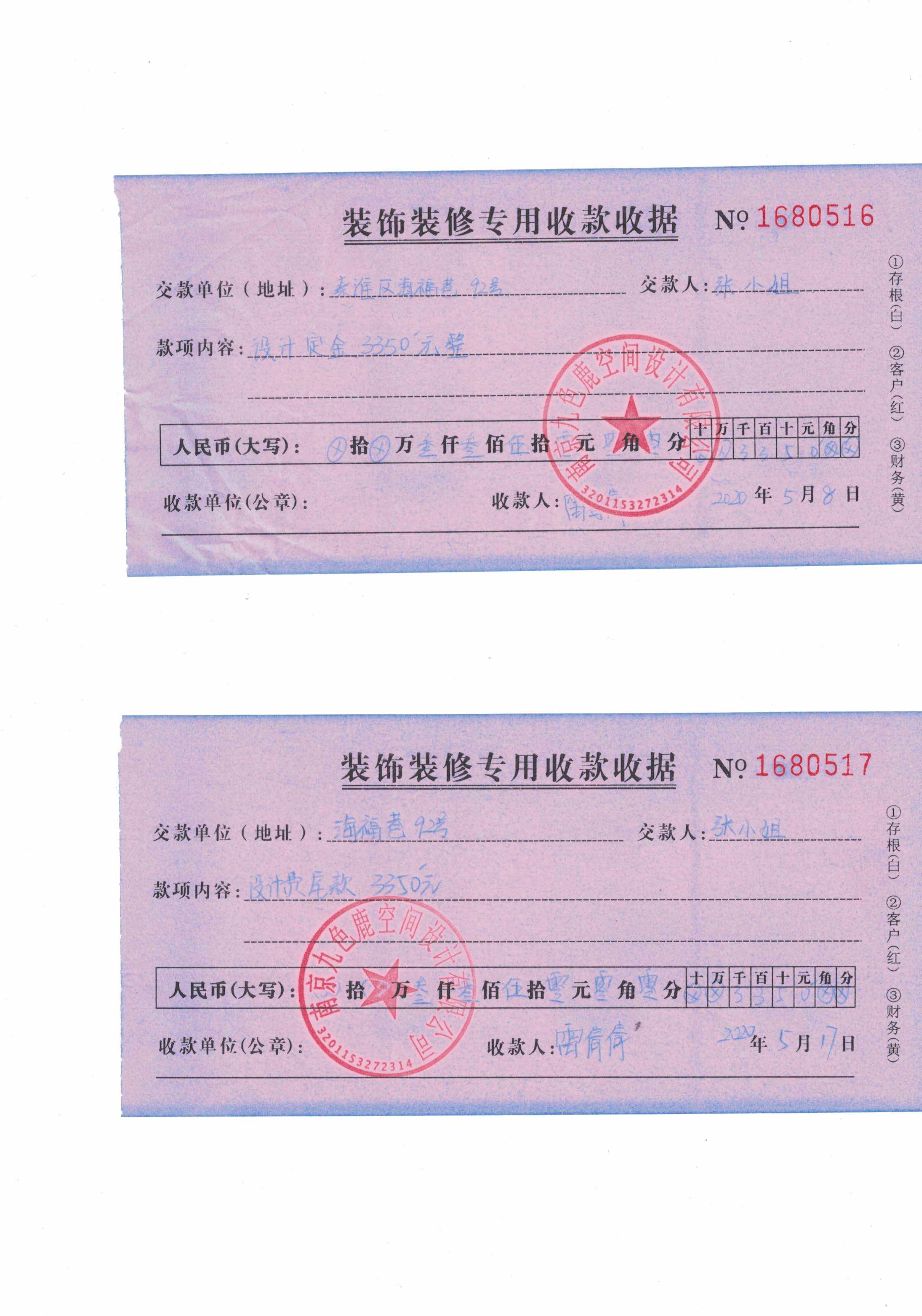 5月8日,洽谈了一段时间后,设计师表示需要签个设计合同,签订当天需要缴纳50%的设计款(设计费按100元/㎡计算,面积按建筑面积算,其实我家房子建筑面积都达不到60平,但设计公司说还要除以一个容积率,因此最终按67㎡来交的设计费),合计6700元。给我设计方案后,我要缴纳50%尾款,但如果找他们公司施工,50%尾款会补贴到工程报价中。我思考后觉得符合我的预算,因此直接签了合同,付了钱。合同中写明,我的装修预算是10万元。