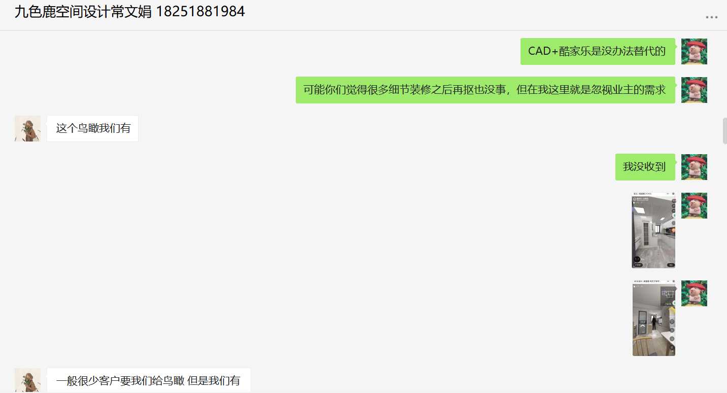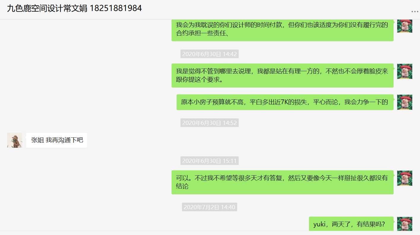 但常文娟几番辩驳后,说要跟设计师沟通一下,然后就不再理睬我了。我跟九色鹿设计师沟通后,发现常文娟根本就没有与服务我的设计师沟通过。她现在拒绝接听我电话,拒不回复我微信,也不让设计师告诉我她们公司搬家后的地址,就想用拖来解决问题。
