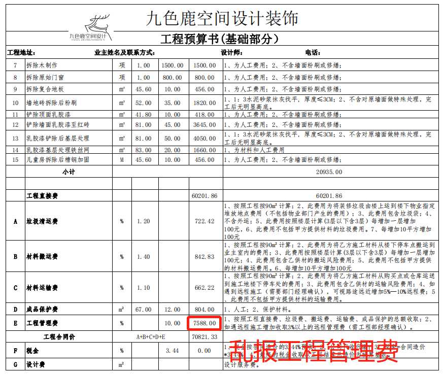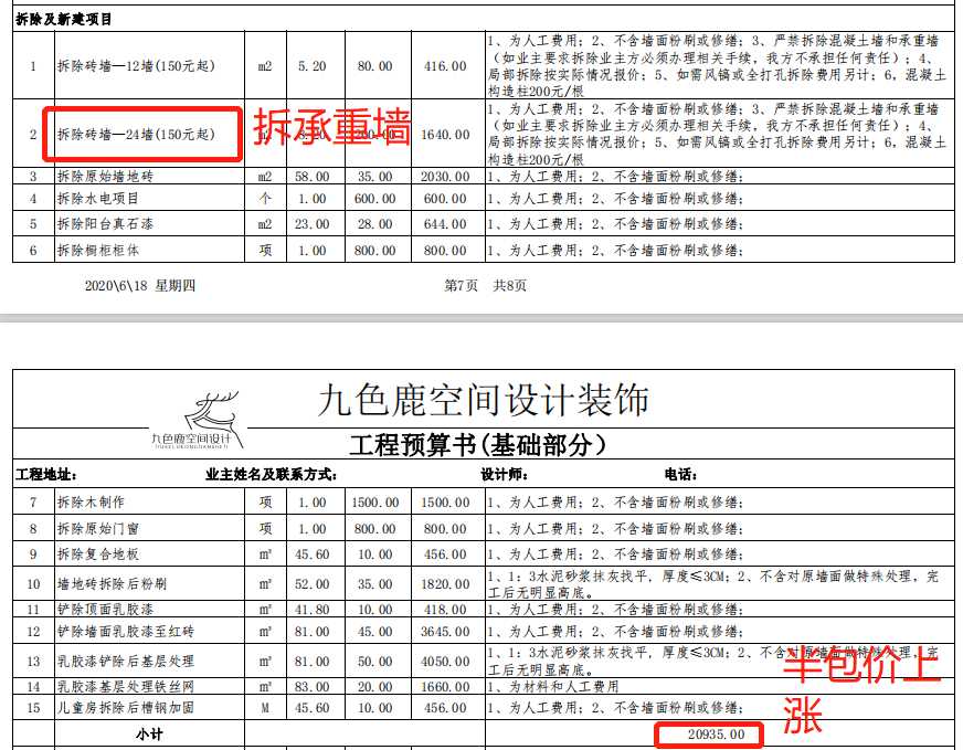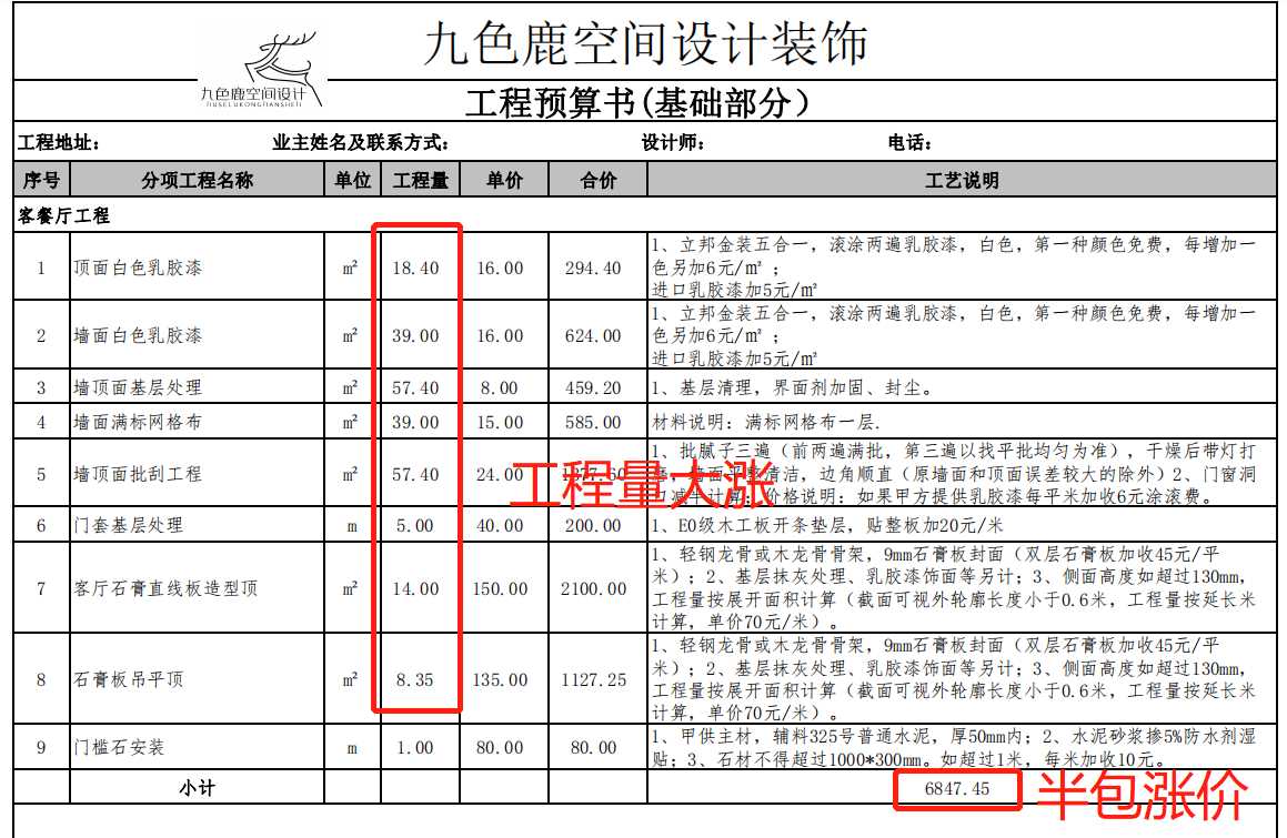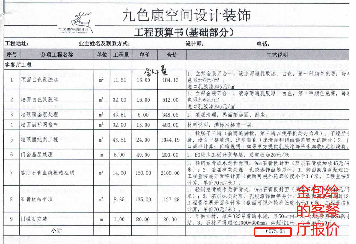 后来的3件事让我彻底的放弃了九色鹿公司,1:对方一直强推的套餐报价中,开关面板是西蒙E3系列,我要求升级到无边框更好看的E6,对方说要加钱680元(但E6只比E3单价高几块钱,680元的加价难道我的60平的房子里要装100来个开关插座吗?),由此可见报价极不诚恳;2:我否决掉全包,要求走半包后,半包价从第一次给过来的59887直接涨到70821,其中大量的工程量变多,这是拿我当傻子来宰;3:九色鹿派工人上门砸了几面墙后,表示墙体都是红砖,都可以砸掉。但后来上门量房的几个装修公司设计师都表示,多层红砖结构的老房子,全屋的墙都有承重作用,尤其是24墙不能动。由此可见,九色鹿公司的工程队压根就不专业,这样的装修公司怎么能合作呢?