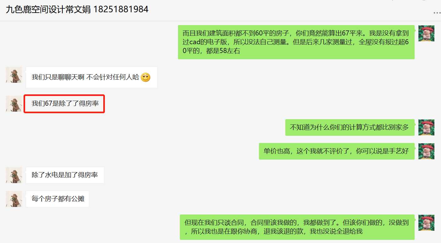端午节后,我与九色鹿负责人常文娟通电话,跟她协商,表示我会跟其他装修公司合作,就不再麻烦她们的设计师了。反正合同里写明的该给我的方案、产品清单都没给我,我也不需要她们的设计师全程指导我的房子施工了,设计费是不是该退一部分给我。