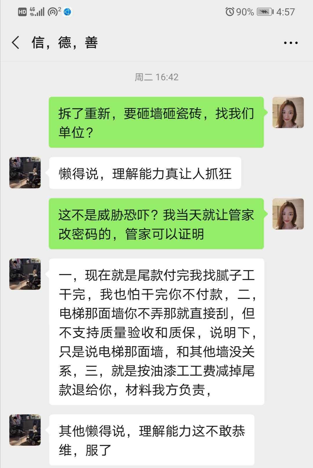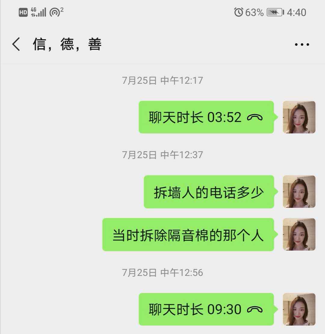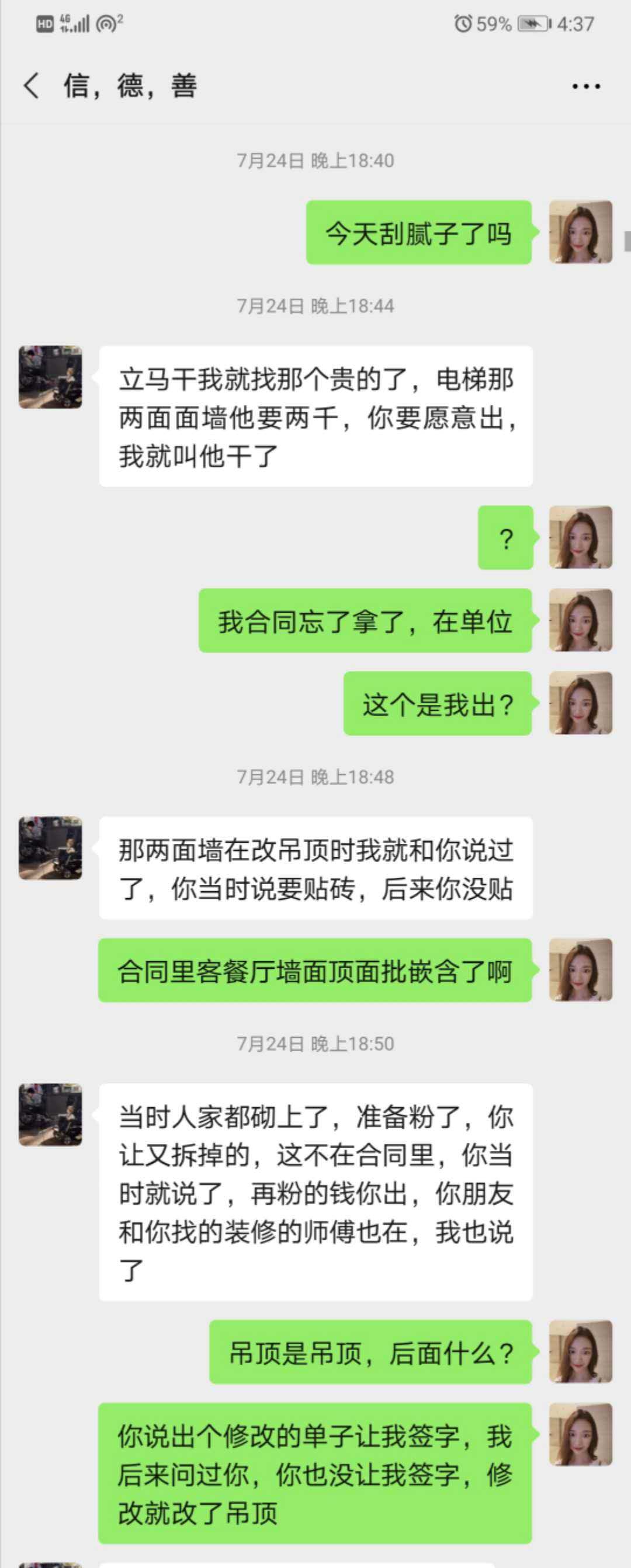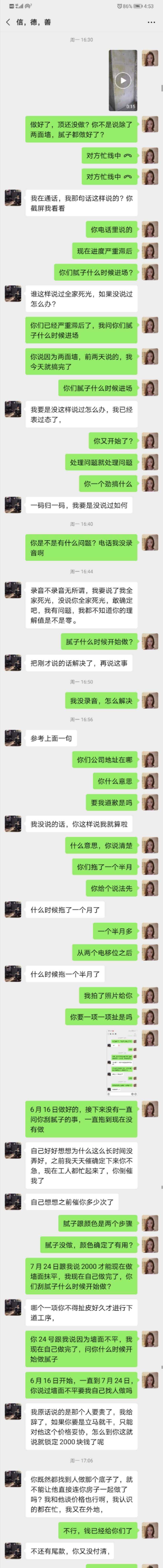 从6月16日开始,装修公司工头先是说找不到人干;一直到7月24日突然说是因为图纸上不需要拆除隔音棉,但是他们的人拆错了,又砌上了,我到那边一看砌得很难看还不如干脆拆了,所以他们就拆了,但是拆掉之后露出的原始墙面不平(当时没有按合同出任何修改单让我签字),所以工头说现在需要我加2000元找人做墙面处理。7月25日微信电话里,工头说除了拆了电梯 隔音棉的两面墙,其他都挂过腻子了,由于微信电话无录音功能,所以后面工头不承认。7月27日,我不想接受工头提出多加2000元进行墙面处理的提议,觉得是乱收费,于是就自己找人磨平了墙面并在7月27日发视频给工头。