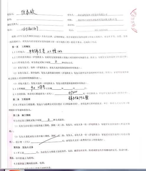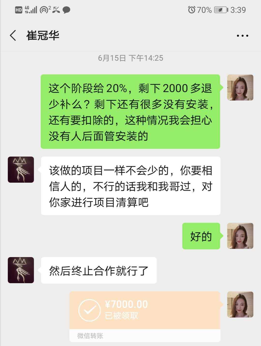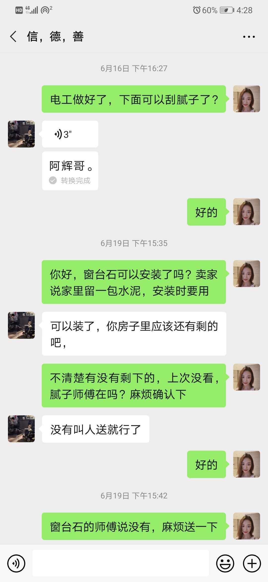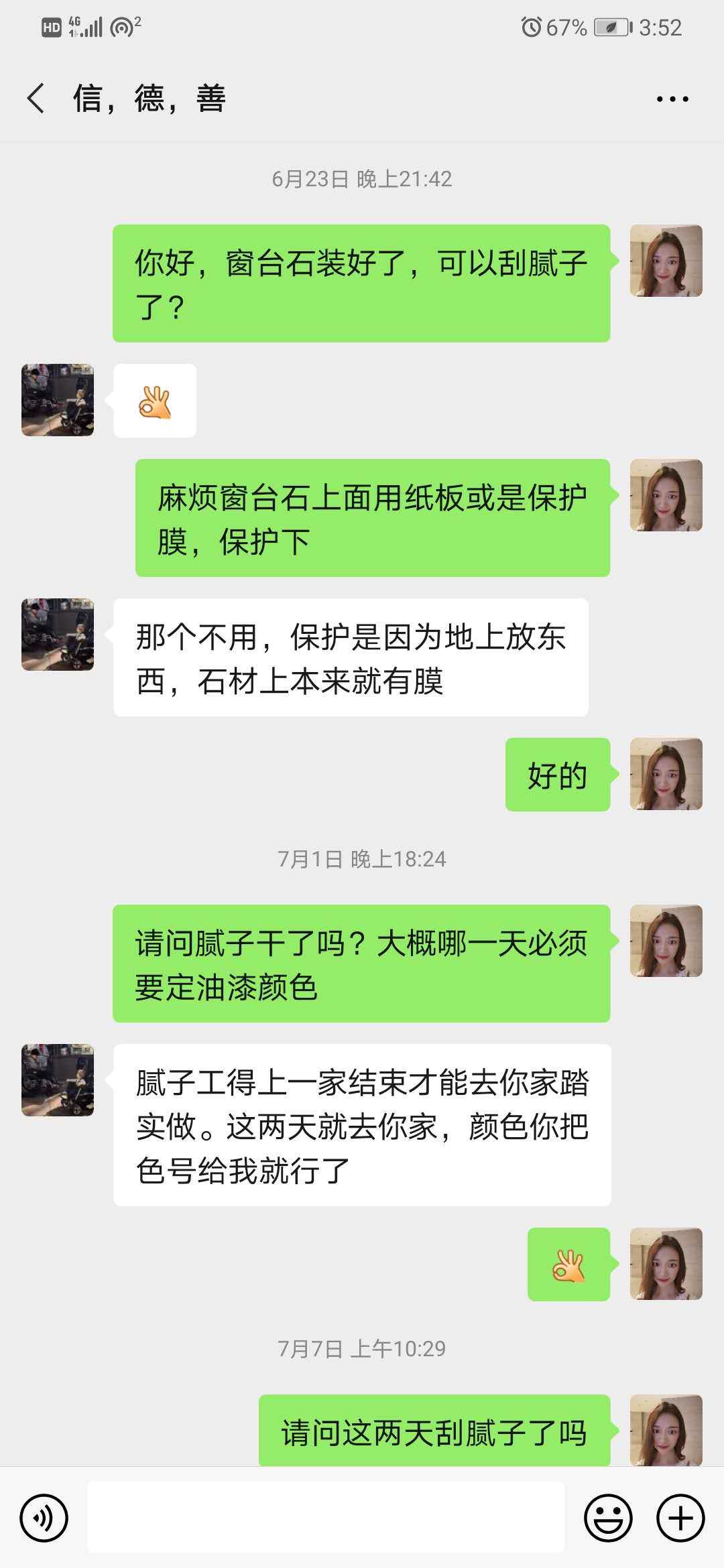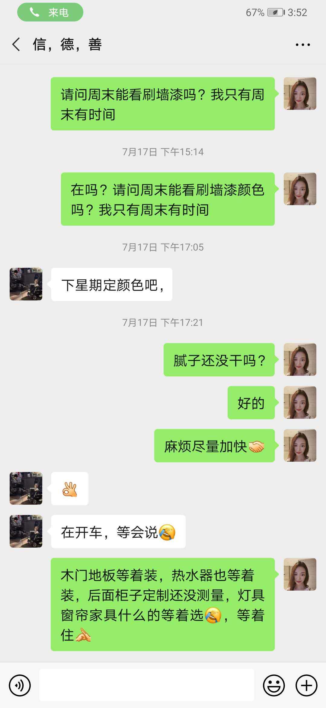 从6月16日开始,装修公司工头先是说找不到人干;一直到7月24日突然说是因为图纸上不需要拆除隔音棉,但是他们的人拆错了,又砌上了,我到那边一看砌得很难看还不如干脆拆了,所以他们就拆了,但是拆掉之后露出的原始墙面不平(当时没有按合同出任何修改单让我签字),所以工头说现在需要我加2000元找人做墙面处理。7月25日微信电话里,工头说除了拆了电梯 隔音棉的两面墙,其他都挂过腻子了,由于微信电话无录音功能,所以后面工头不承认。7月27日,我不想接受工头提出多加2000元进行墙面处理的提议,觉得是乱收费,于是就自己找人磨平了墙面并在7月27日发视频给工头。