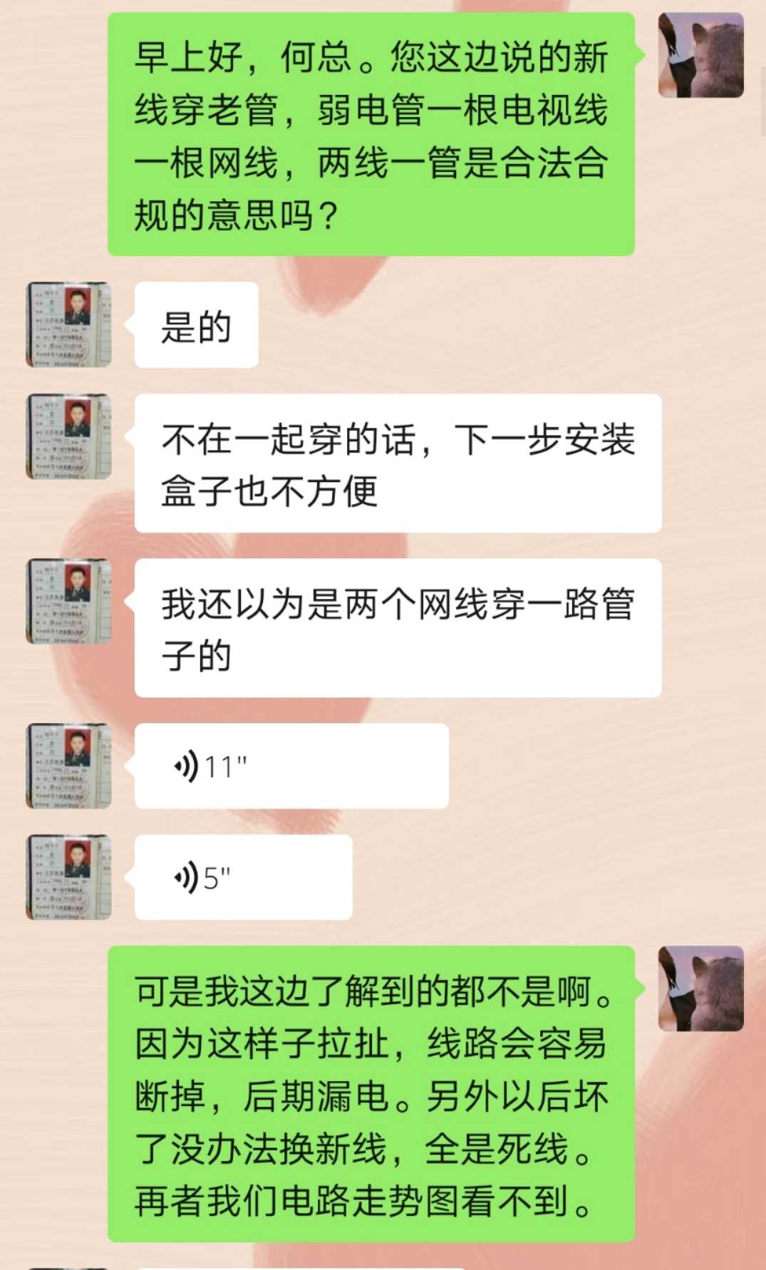 7.20-10.19全包合同,二手毛坯,合同约定水电全改,实际施工大量使用原线路,强弱电都没有重新开槽布线管铺线,弱电管一根线管硬塞两根线,厨房电路直接走地,造成大量安全隐患。施工没有监理,我自己找的第三方监理提出问题拒不改正。 1.电线拉扯断裂,破皮,漏电;2后期维修管线只能砸墙,砸地;3无法提供电路施工图纸,家里电路走向个人不了解,墙面无法有任何改动,连钉子都不可以打。