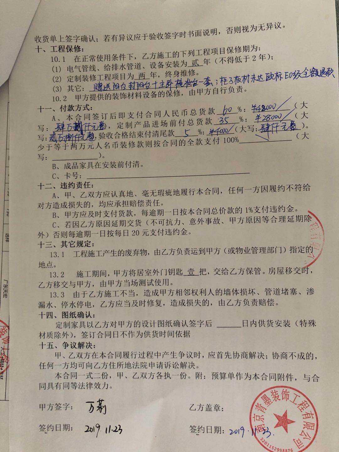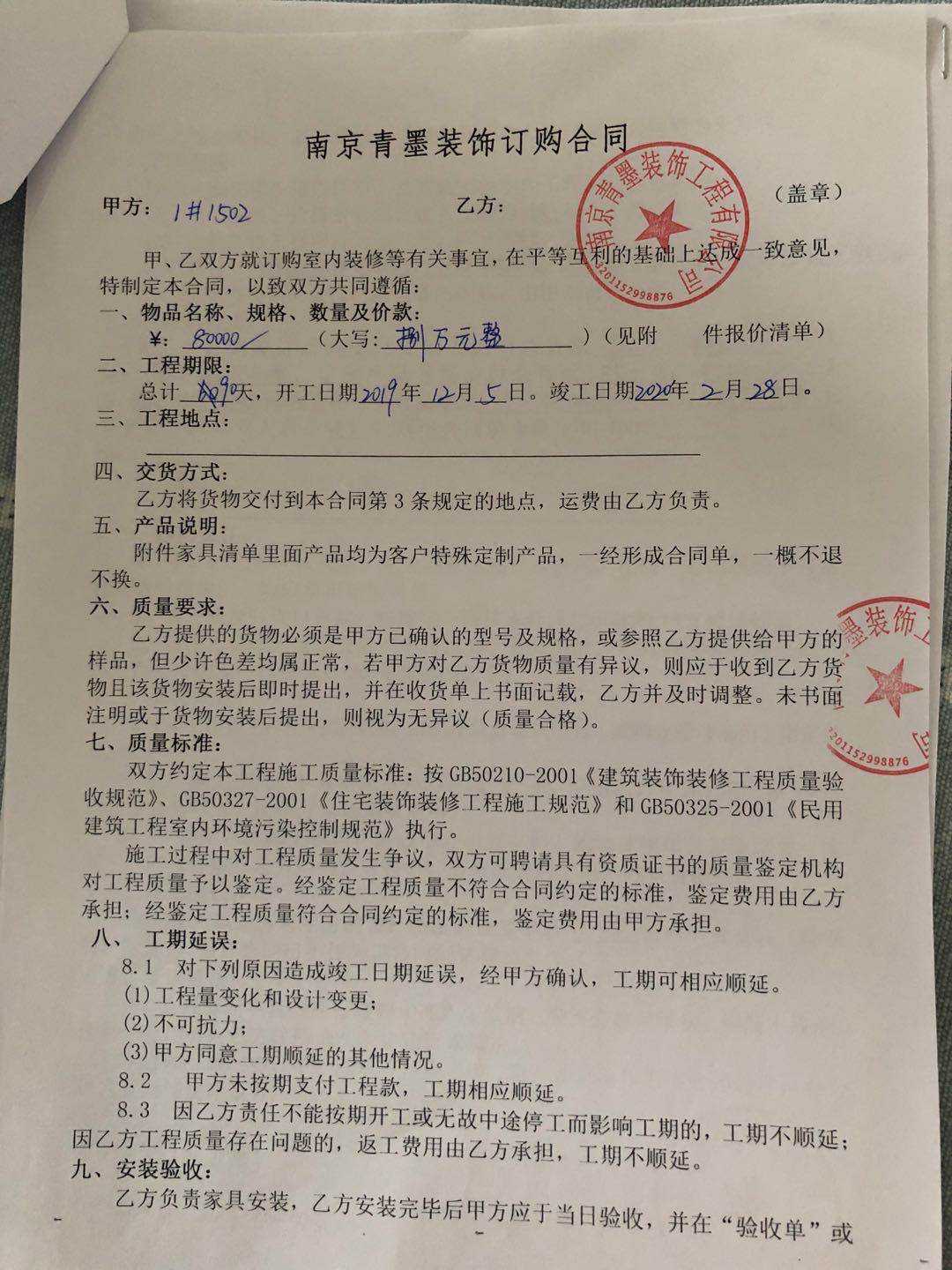 2019年11月23日月在南京青墨装饰工程有限公司签订了装饰订购合同,合同中明确表明开工日期2019年12月5日,竣工截止日期2020年2月28日。