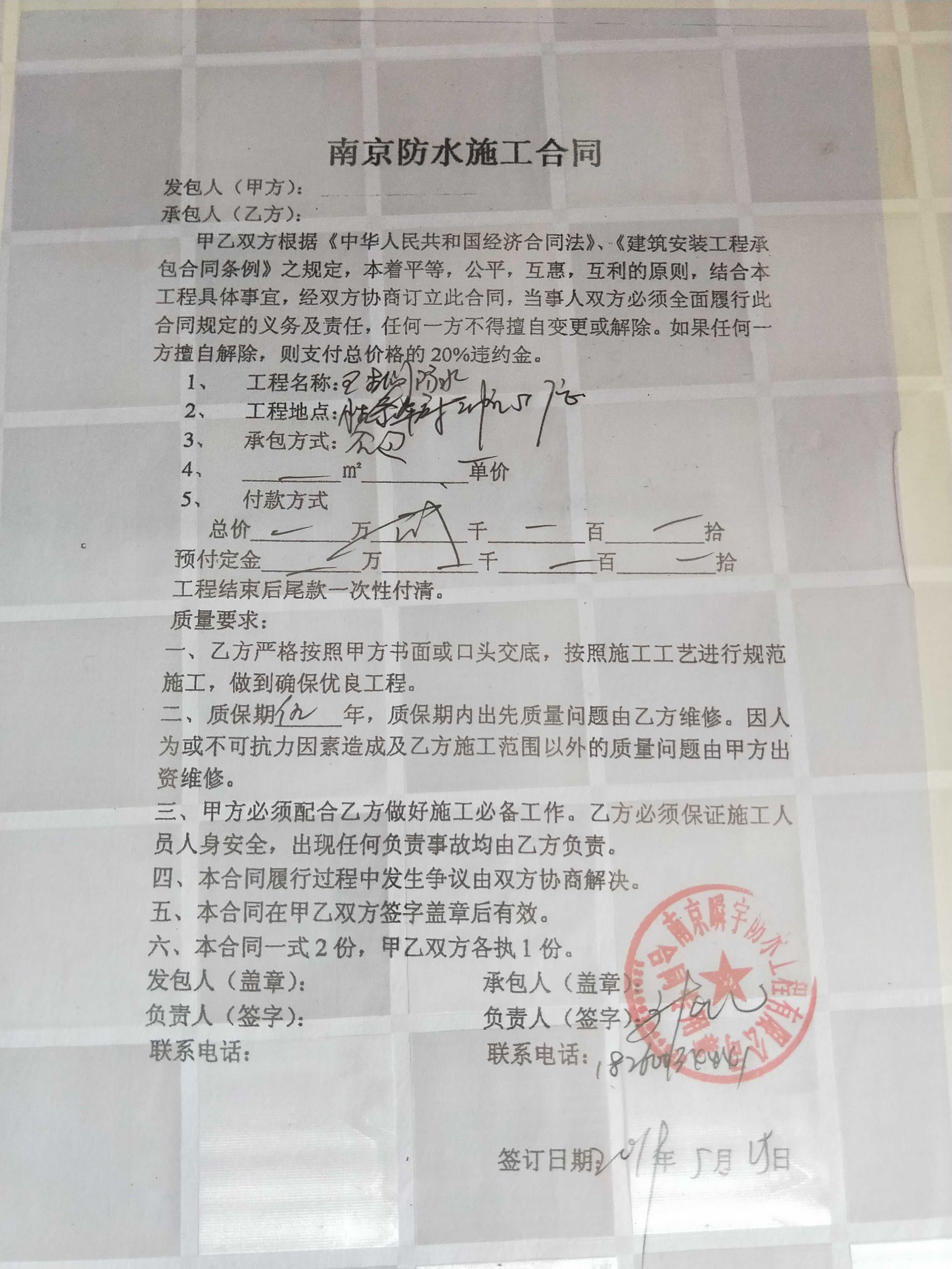| 投诉类型 | 施工质量 | 投诉人 | 徐** | 被投诉单位 | 南京舜宇防水工程有限公司 |