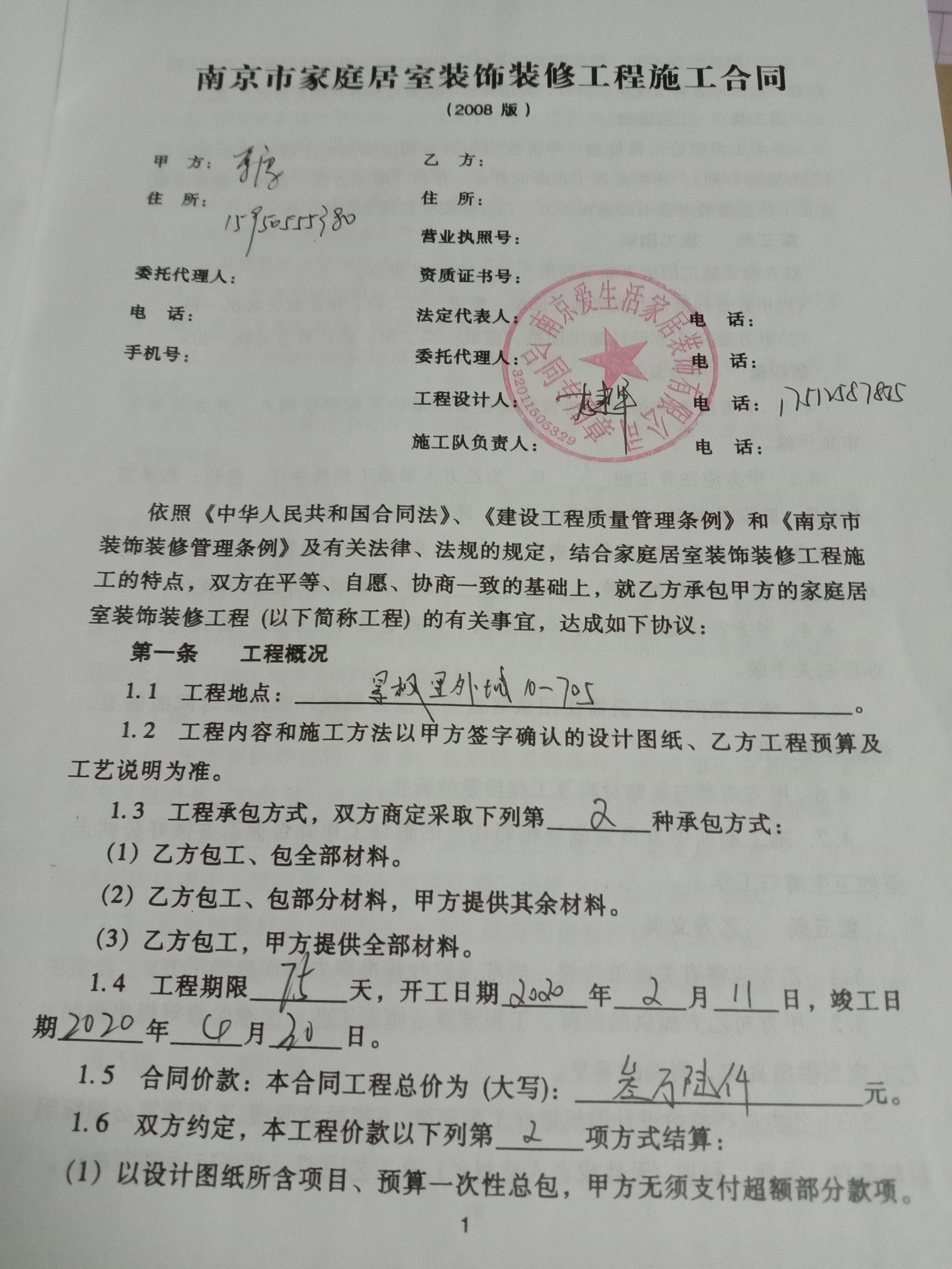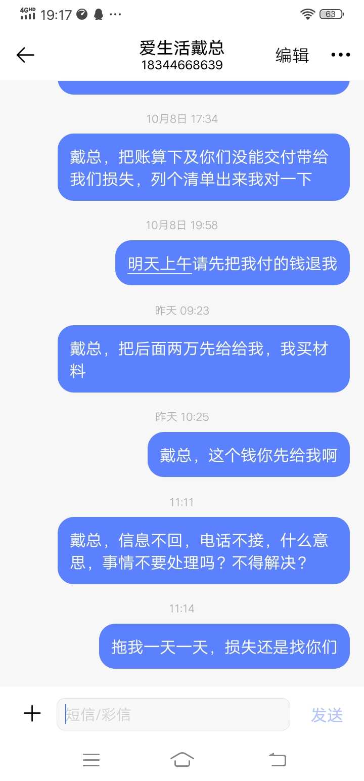 江宁区天印大道1369号天印慧谷景胜爱生活装饰。2020年4月动工到现在只施工到贴砖合同工期75天,其中水泥,沙,粘合剂,胶,自己买的,合同包材料,卫生间客厅瓷砖自购,截止到今天10月10日迟迟不能完工,沟通催没效果,加签订销售合同2020年8月,可签订销售合同柜子,家居,到9月30日一月到期还是没有交出任何东西,通电话退款不让做后,到现在爱生活戴总不接电话,不回信息信息,近半年装修家里水电,防水,贴砖。水电项目经理收一万元,电到现在还留尾,吊顶不能全封,要求退款,一个多月没回应。爱生活说不退,费用直接用板材抵扣。