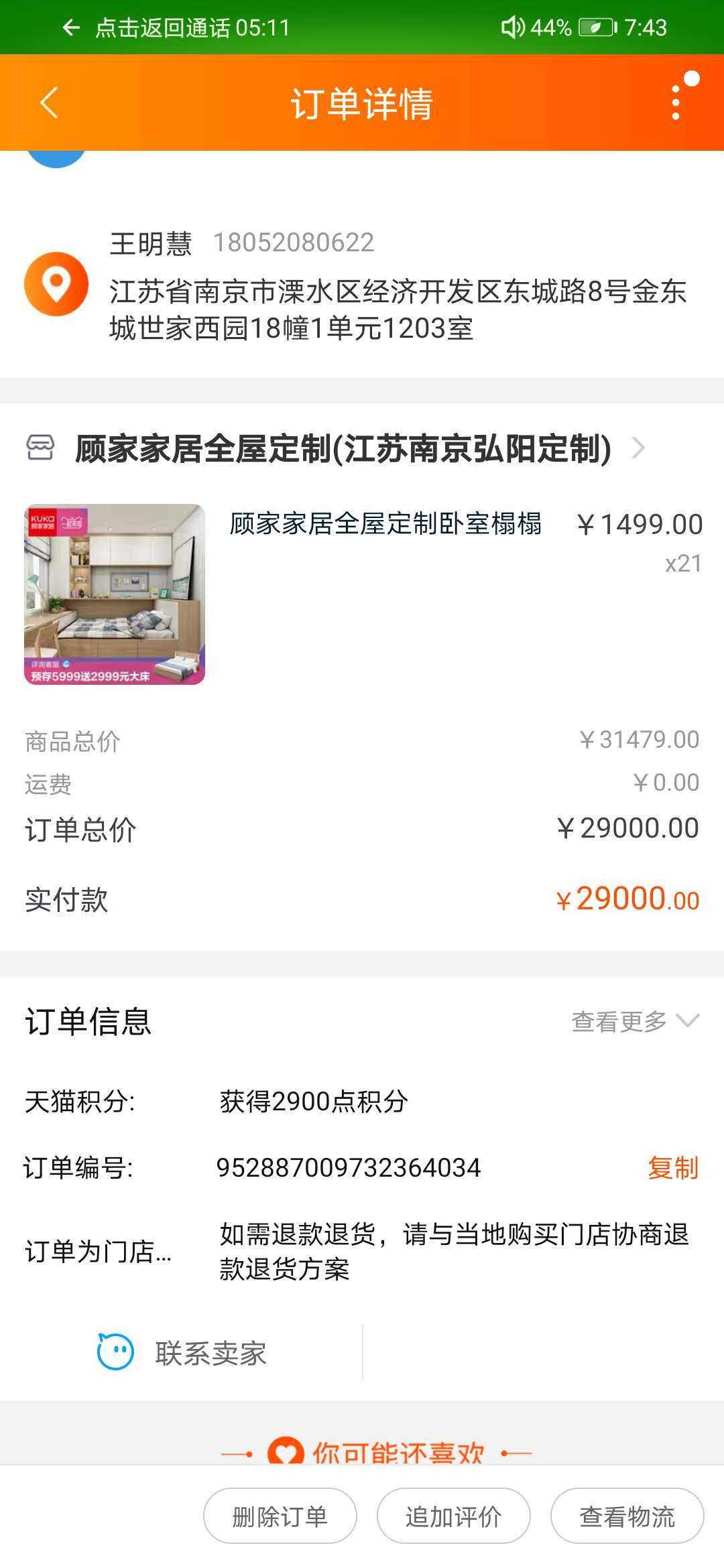 但作为普通老百姓,凭着自身并不多的合约意识,李强还是要求通过线上平台付款,以便留有订单痕迹。弘阳店同意后,李强在淘宝平台的顾家家居全屋定制旗舰店根据李易的指导,选择某个产品付了30000元【订单号952887009732364034和952895042746364034,下单淘宝账号wangminghui8406,订单收货人:王明慧(18052080622),指定了弘阳店定制】。另加此前在门店支付的1000元意向金,共计31000元。