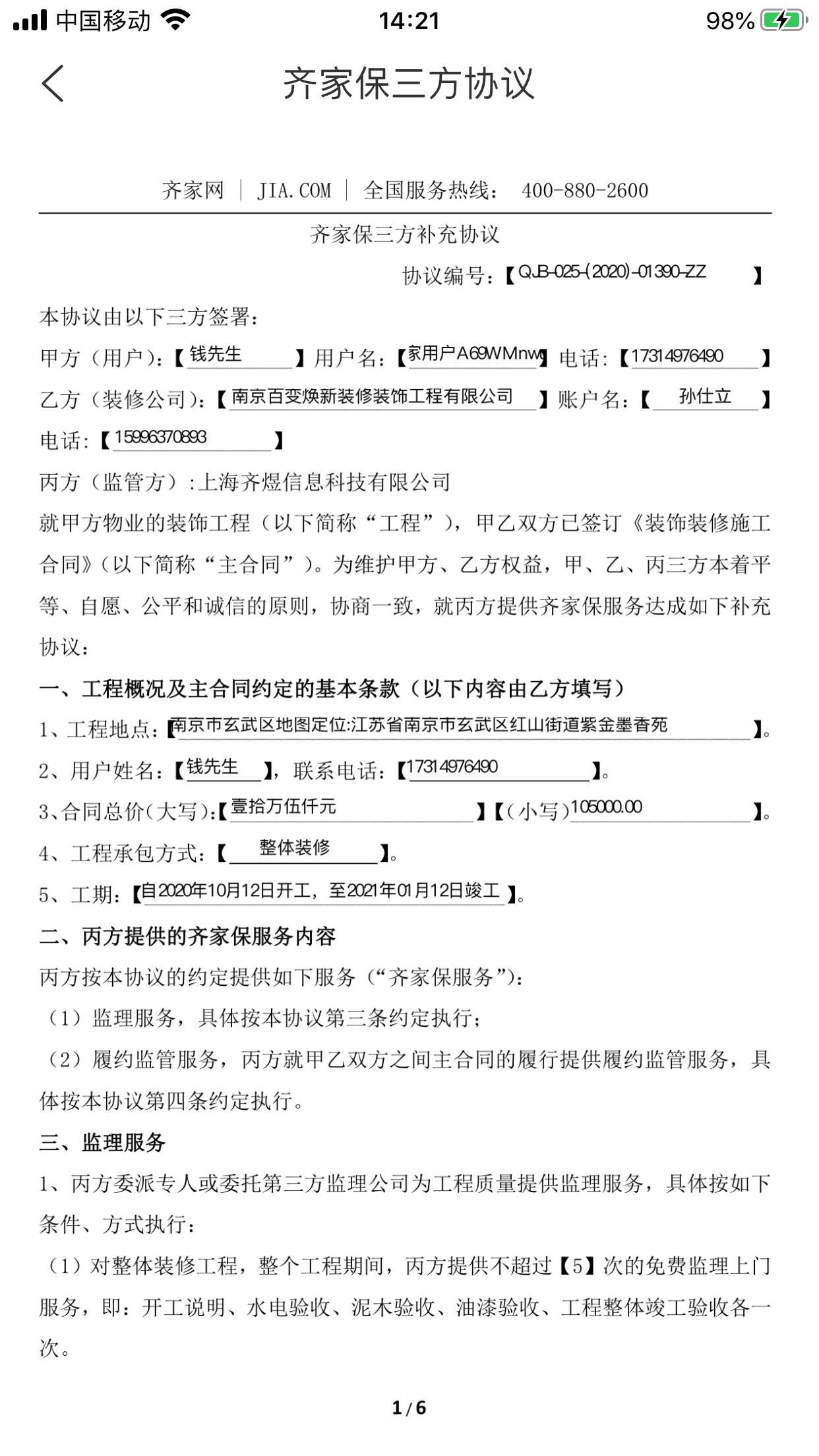| 投诉日期 | 2020-10-20 | 联系地址 | 紫金墨香苑3栋1**** | 项目负责人 | 周** |
