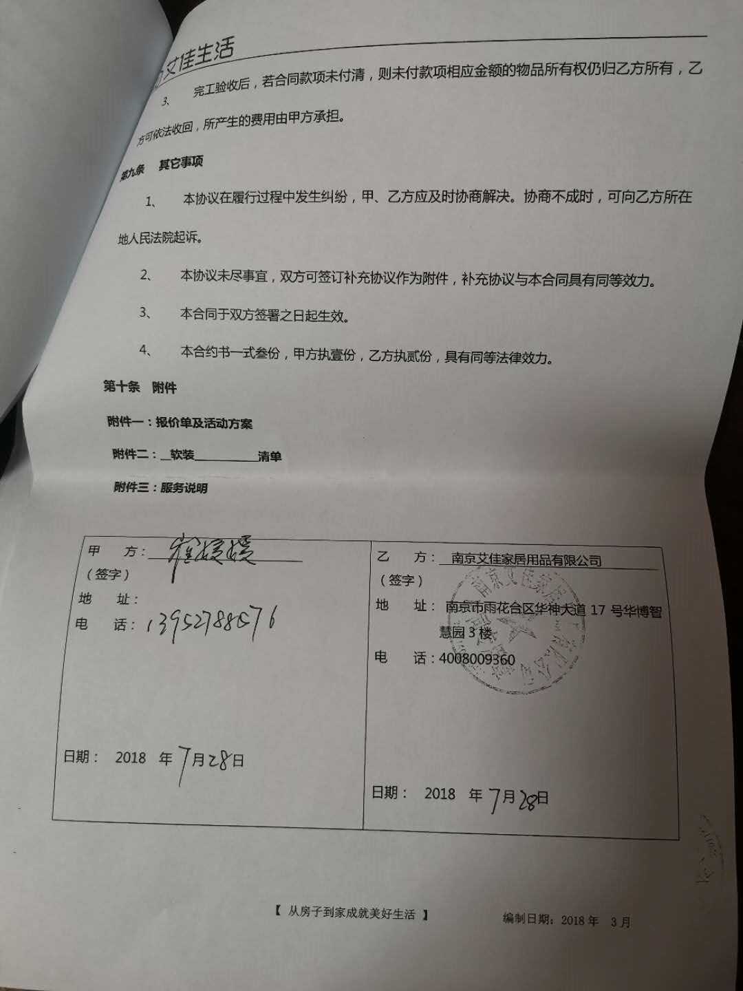 2018年7月本人与艾佳公司签订置家服务合同,全款支付装修款。2020年3月份开始,多次与艾佳公司沟通装修事宜,因他们提供的方案、服务不能满足我们的要求,经与线上小艾客服、线下联系人郭经理多次沟通协调,同意全额退款,要求我把所有材料全部寄回,<st1:chsdate year="2020" month="7" day="10" islunardate="False" isrocdate="False" w:st="on">7月10日</st1:chsdate>,对方确认收到材料,并开始走退款流程。郭经理原本承诺8月底退款,后一直以各种理由推脱,到今天已超过三个月,依然没有退款。自9月下旬开始,郭经理电话(15195891458)已无法拨通,线下联系出现盲区,拨打公司电话(02586498500)推脱要等四个月。