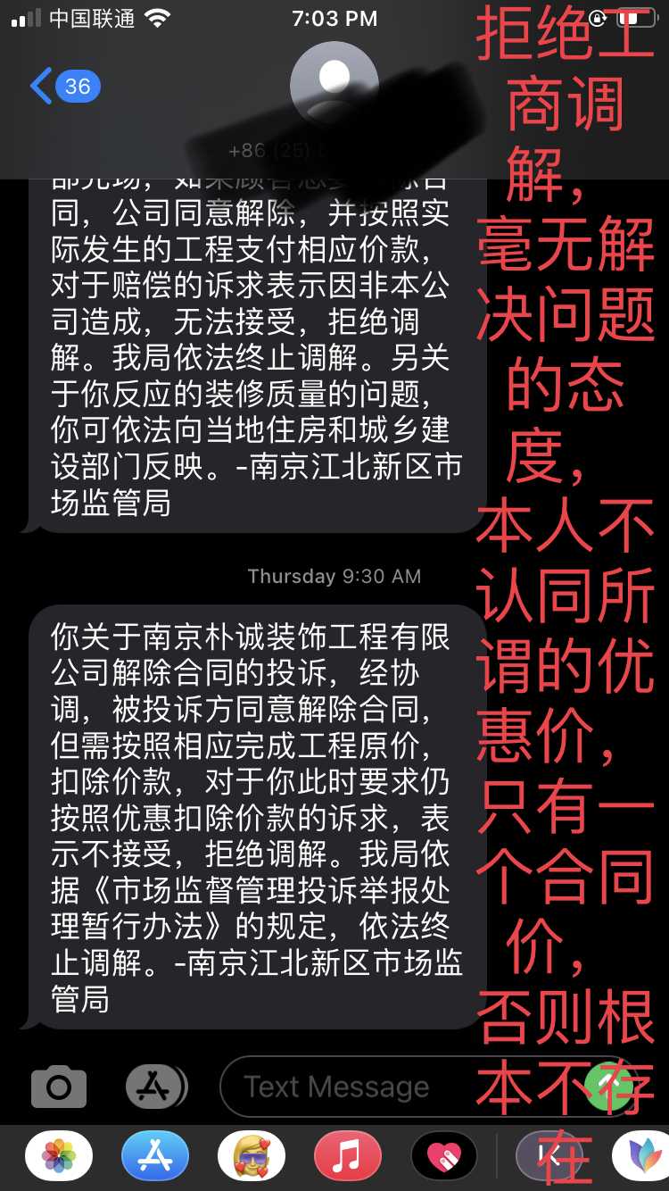 本人于2020年6月6日与南京朴诚装饰工程有限公司(以下简称乙方)签订装修合同,约定工期为3个月,并于2020年6月16日正式开工,在装修过程中本人发现乙方在施工过程中存在多处不合理及不符合国家标准或行业规范的地方,前期本人一直体谅、忍让,只希望乙方能保质保量完工,直到瓦工结束验收时,发现施工质量惨不忍睹且存在恶意赠项,才忍无可忍提出解除合同,乙方同意解除合同,但在计算已完成工程的价格时恶意按报价计算,不认同合同价(报价为64000,合同价为58501)且服务态度差,包括但不限于不回信息、拒绝工商调解。鉴于以上原因,本人诉求如下: