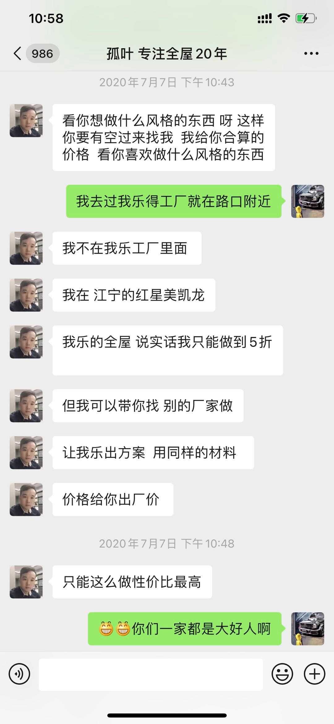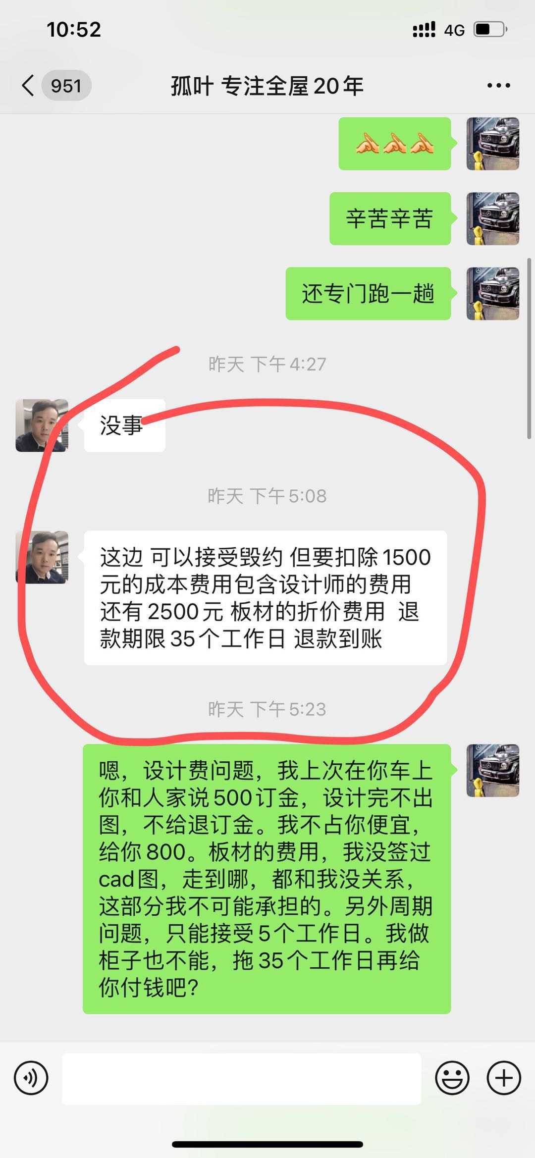 本人与6.27日接触乐邦尼全屋定制销售员,卞青蓬,(当时他的微信名字还是我乐全屋定制)起初由他可以给我做我乐全屋定制5折的噱头,将我带去我乐位于江宁的工厂参观,并选中一款全屋系列。然后承诺由我乐的设计师对我的房屋进行设计,并且所有材料都采用我乐的。后期与我签订了装修定制单(用的是我乐的订货单)9.30谈妥价格之后,签订合同,合同为乐邦尼全屋定制,当时也产生疑问销售以不能签订我乐的合同,我乐会追究他的责任,(此人是新小区的邻居,出于对邻居的信任交付了全款29204元)。从销售认识我开始至今,我从未与我的设计师有正面的沟通,每次有变化都是销售员卞青莲进行转达。在十月中旬,我改变想法想对家里进行一系列改造,造成客厅的入户柜有高度差,销售说要量完尺寸复尺后才能进行制作。但是我多次强调要求,先做屋内其他柜子散味,都被板子不是一批的会有色差理由拒绝。从10.25日开始我询问衣帽间的平面图,每天都已设计师很忙为理由来搪塞我,10.28日才进行回复。我由于实在受不了一次又一次的,欺骗和拖延,在11.7日提出要求退款,并明确表示愿意出一部分的设计费用,但是商家故意刁难,不给退钱,接口板子材料已经买回来了,要求扣除2500的材料费用,而且退款周期高达35个工作日。本人于11.10日进入乐邦尼全屋定制 江宁红星美凯龙店,寻求老板解释,老板以不知道事情,销售员不属于他们为借口不处理,后来回家后发现销售发来的聊天记录里面有截图证明了,设计师销售老板共同参与了我家全屋的设计,老板故意刁难,客户不予退款。希望能寻求帮助并追回款项