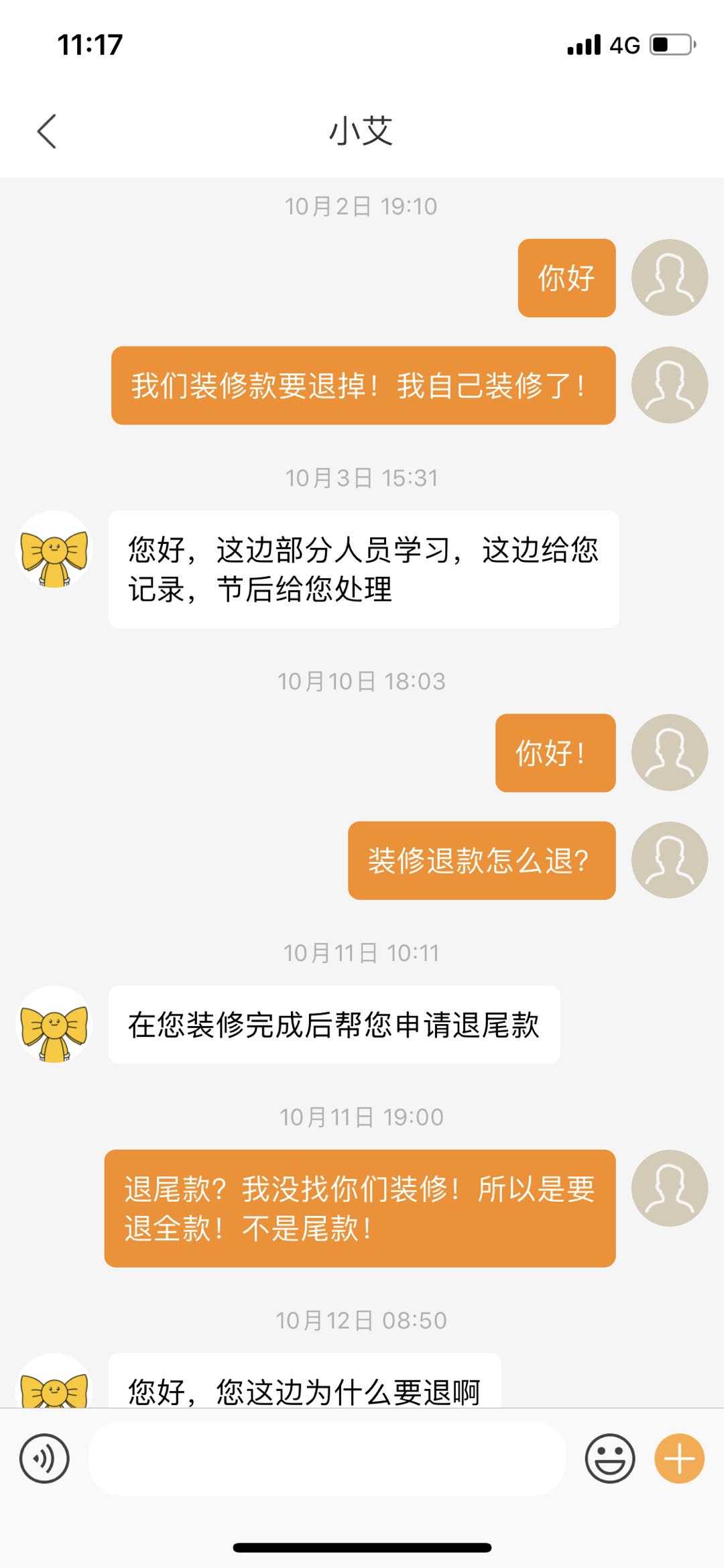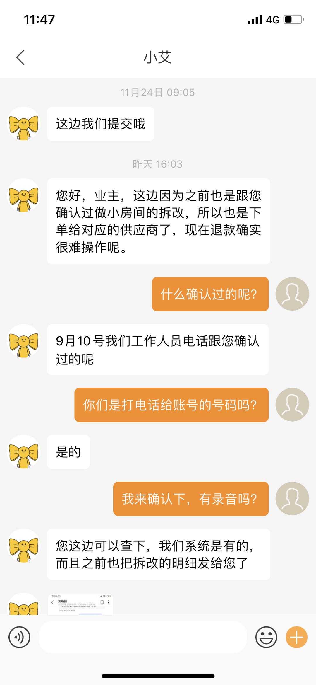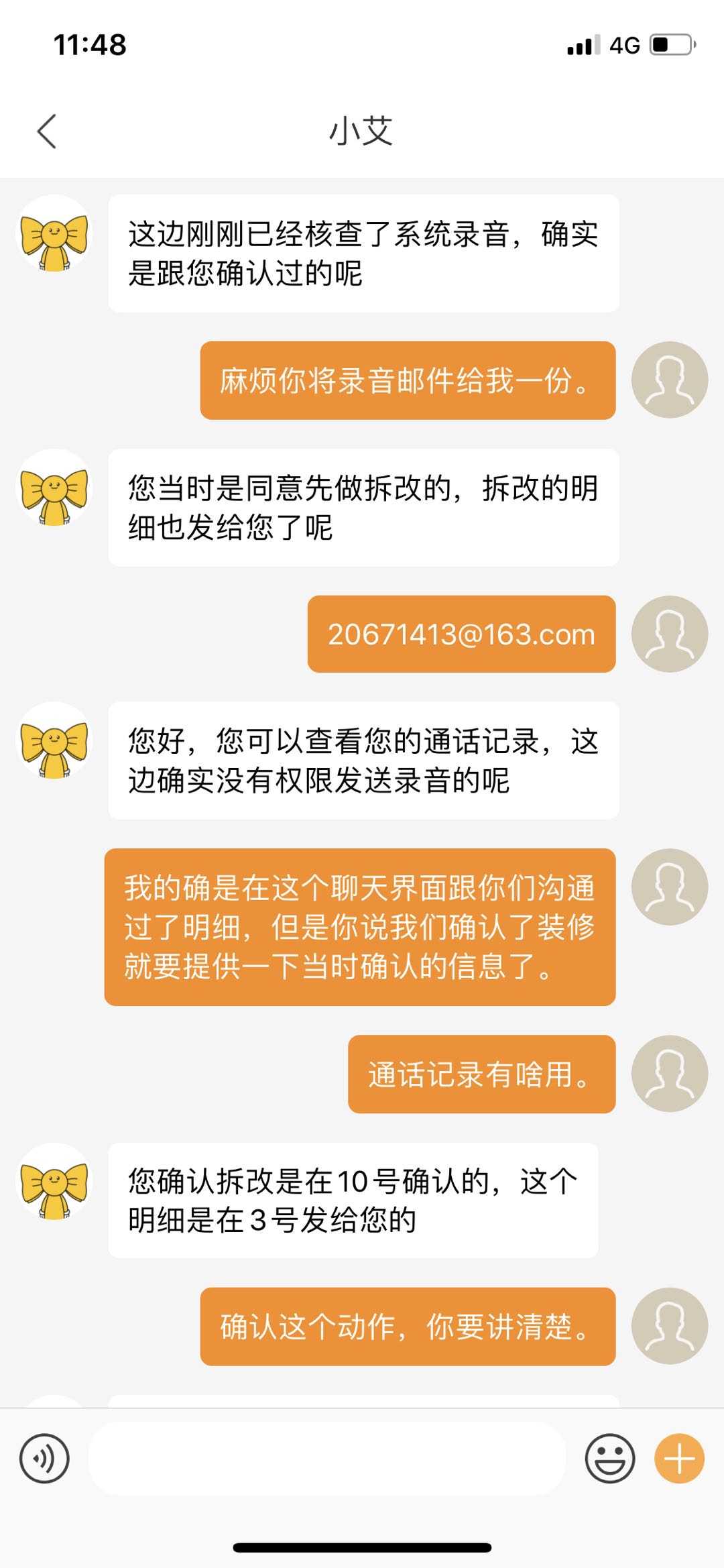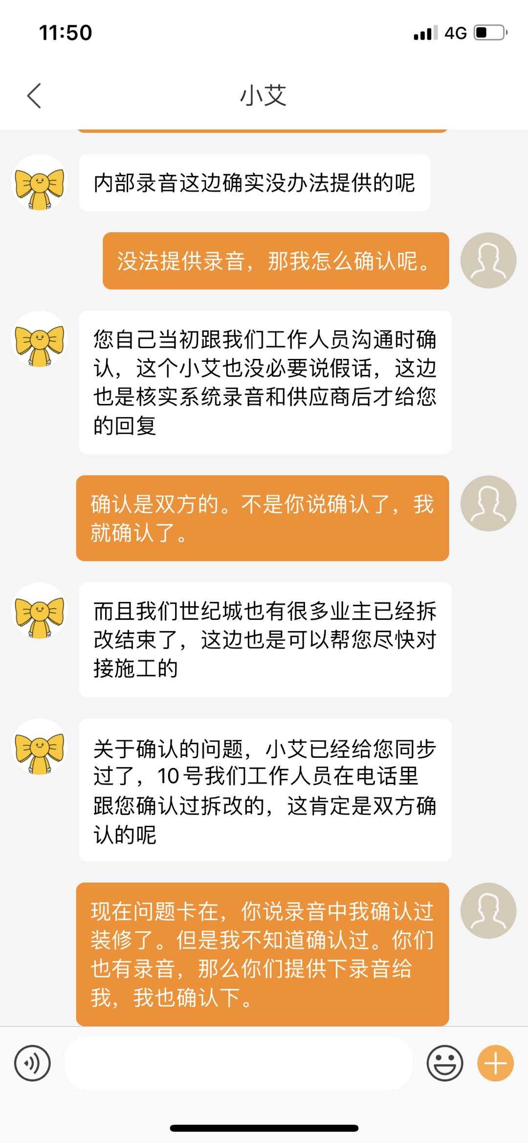 艾佳声称:有录音,确认过要艾佳装修了。不会说假话,app沟通全程有监控。但是录音是不会提供的。