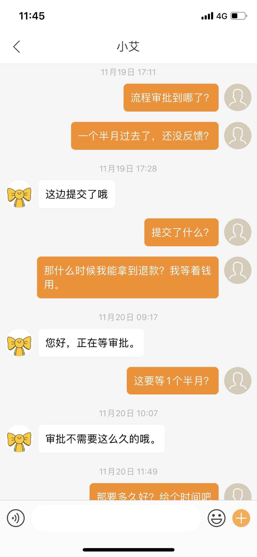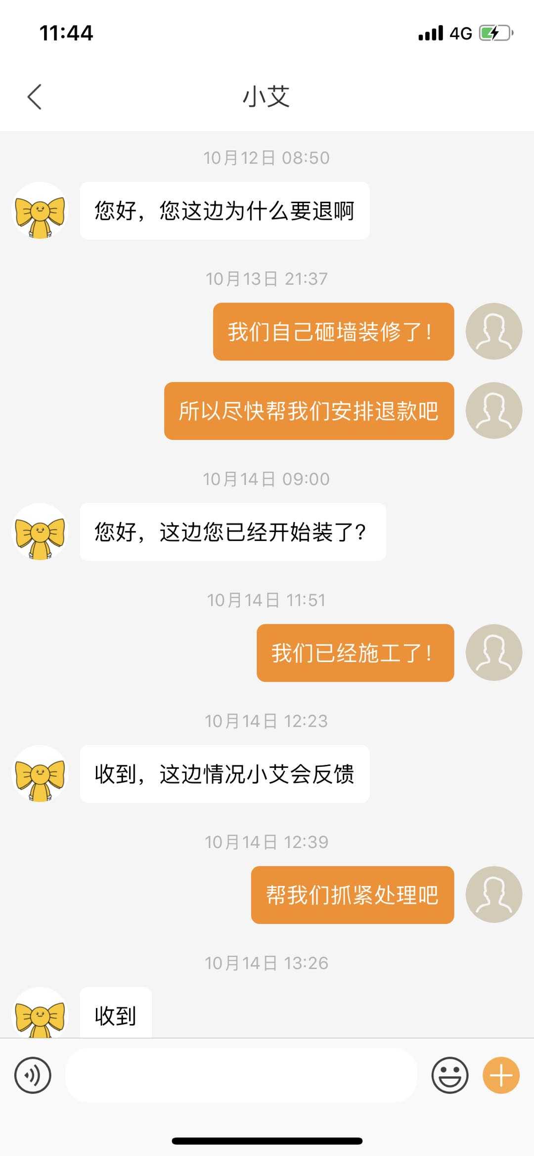 我是江苏苏州昆山市中南世纪城39幢2604业主,17年购房时交给艾佳19400小房间和阳台改装费用。2020年9月交房后,在app中咨询改装细节,和加改项目信息,并未达成装修意向。查看小区其他艾佳装修进度和装修质量,觉得堪忧,于10月2号在提出退款,然后艾佳app内回复在确认,审核。直到11月25号,app突然通知因为确认过装修,材料采购已经下单给供应商了。然后问题就出现扯皮了。