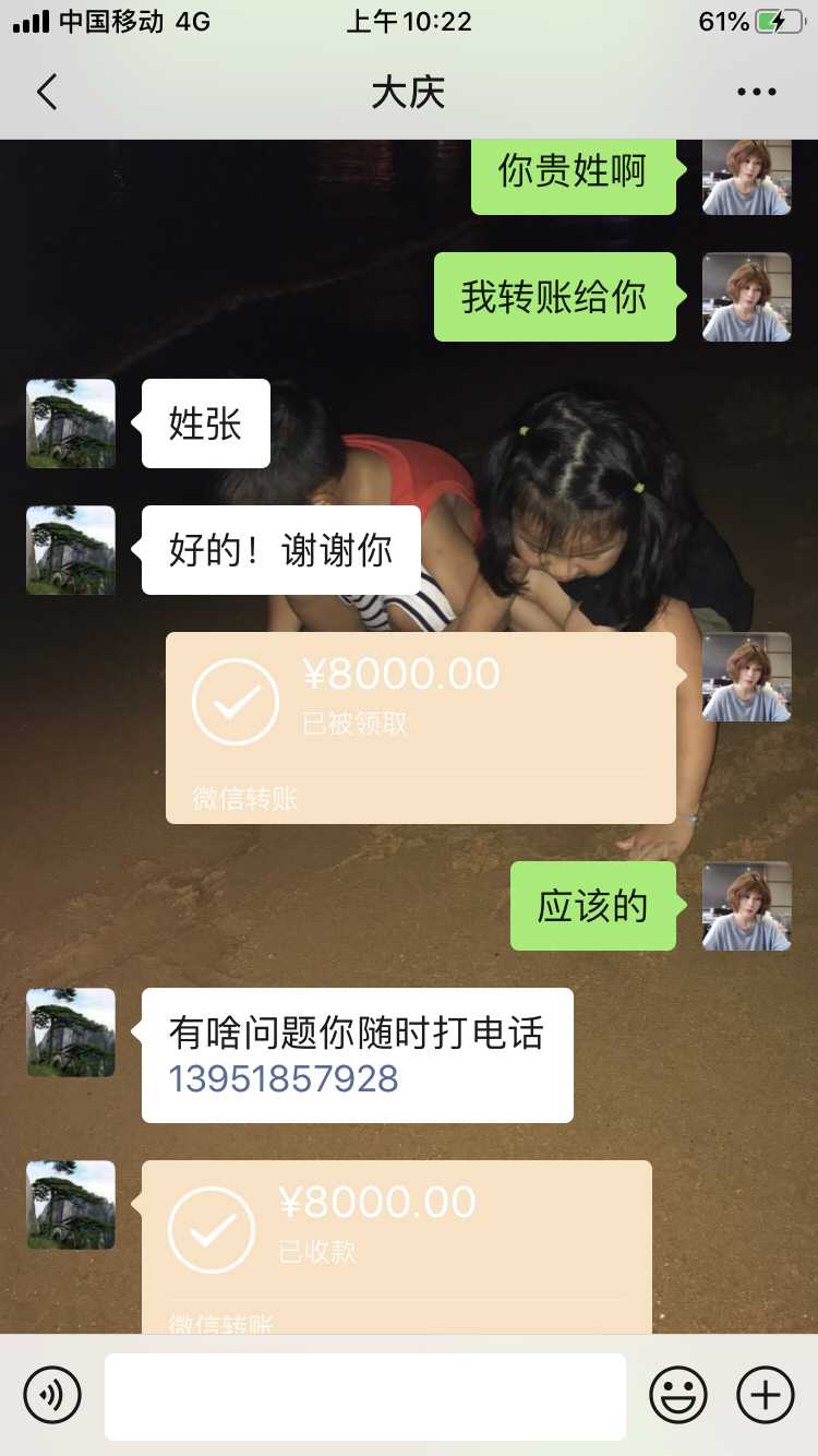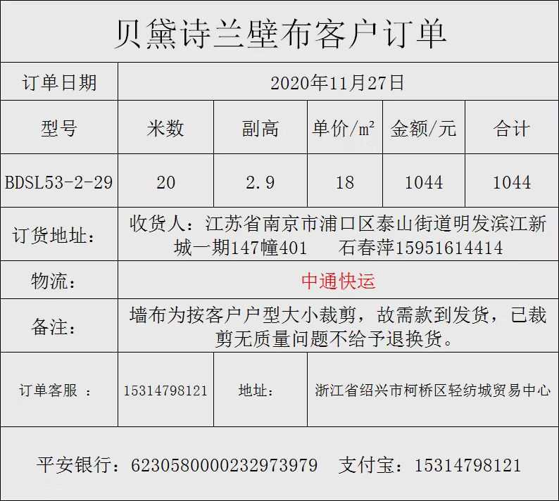南京市浦口江北新区明发滨江新城一期147-***装修过程中,买贝黛诗兰壁布墙布及施工人为同一个人,贴上后质量极其恶劣,联系后对方表示马上来处理,前后微信转账9000块,后再就一个多月时间一直联系不上。对方姓名:张凤冠(TEL:13951857928)身份证:320321197308011510