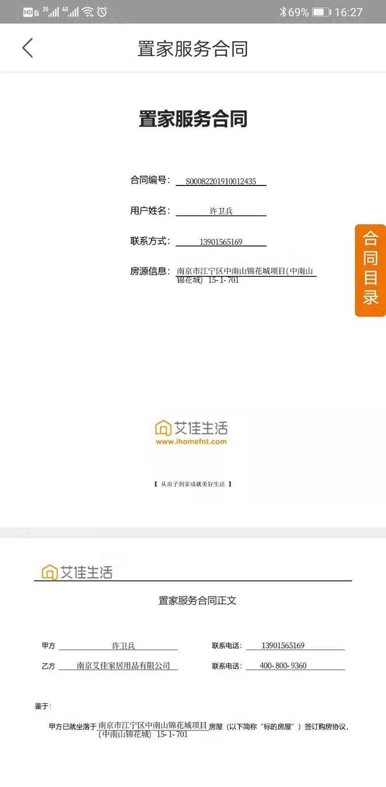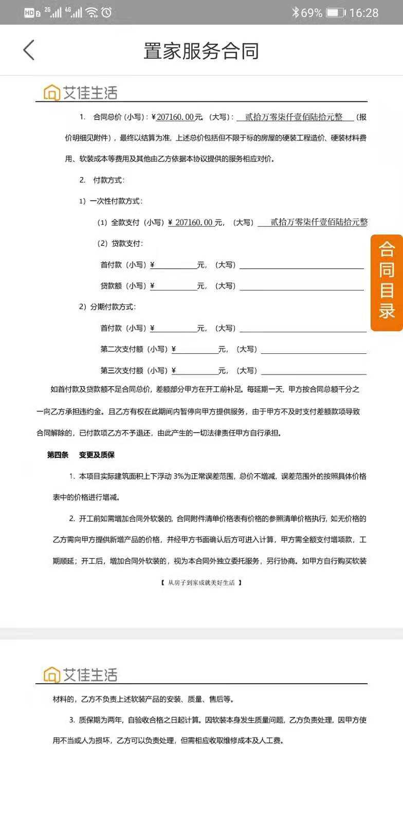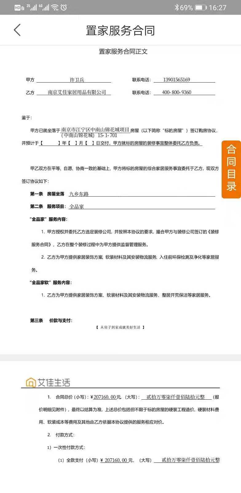 我是2016年在南京市江宁区中南山锦花城购置一套住宅,并在与中南山锦花城销售处签订购房销售合同后支付购房款时,设立在中南山锦花城销售处里的南京艾佳生活体验区的艾佳生活工作人员,向我介绍南京艾佳生活这个企业的实力和能力,并明确中南山锦花城的样板房也是由该公司承建。当时我认为该公司是可以的,同时还有房产销售人员陪同,当时就签订了诚意合同,并支付了18万元的预付款,经双方协商,按20万元抵装饰款,装饰时间另行商定,装饰时间为63天。