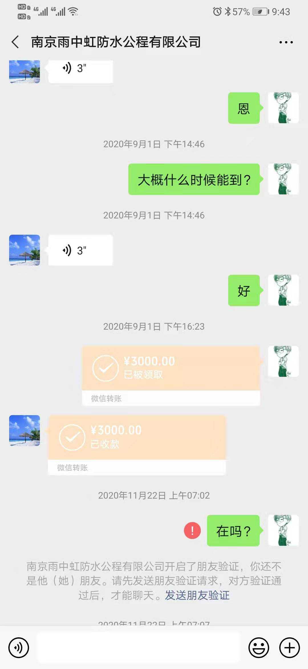 本人家住南京市六合区龙津广场c区12栋1单元1801室。家中书房两个窗户下面渗水。2020年9月1日,通过网络找到一家名叫南京雨中虹防水工程有限公司,然后电话要求上门来做防水。该公司王师傅来我家做了两个窗户台下面的防水,并承诺不会再渗水,如果有问题打电话找他。事后我和他互加微信,并微信支付给他3000元钱。我和他没有签合同。之后经过几次下雨,我发现还是渗水,打电话联系他,他不接电话,微信他拉黑了我,我感觉上当受骗了。这之后我打了12345等有关部门。有关部门打电话给他,他装傻说不清楚,挂电话。通过调查该公司只有营业执照没有防水的行业证书。而且可能只有他一个人,与他网站说的很不相符。我希望315对该公司查询和处理。