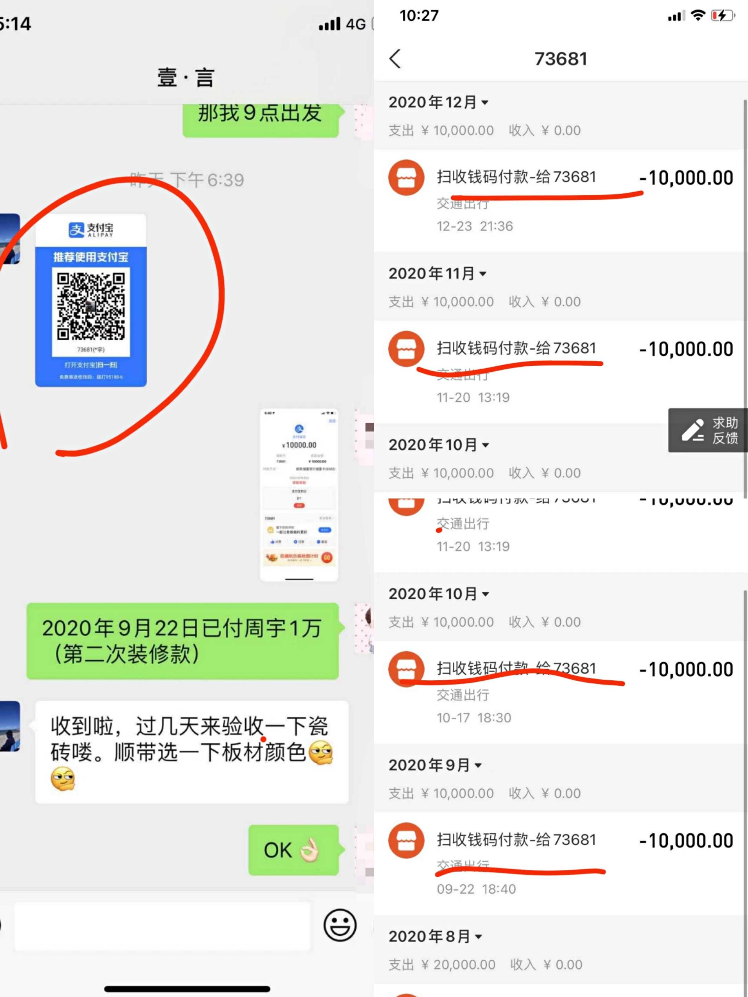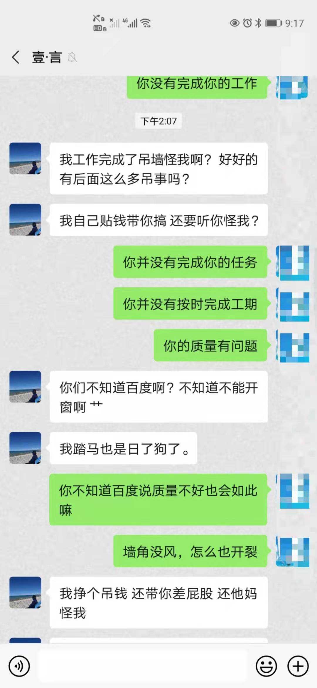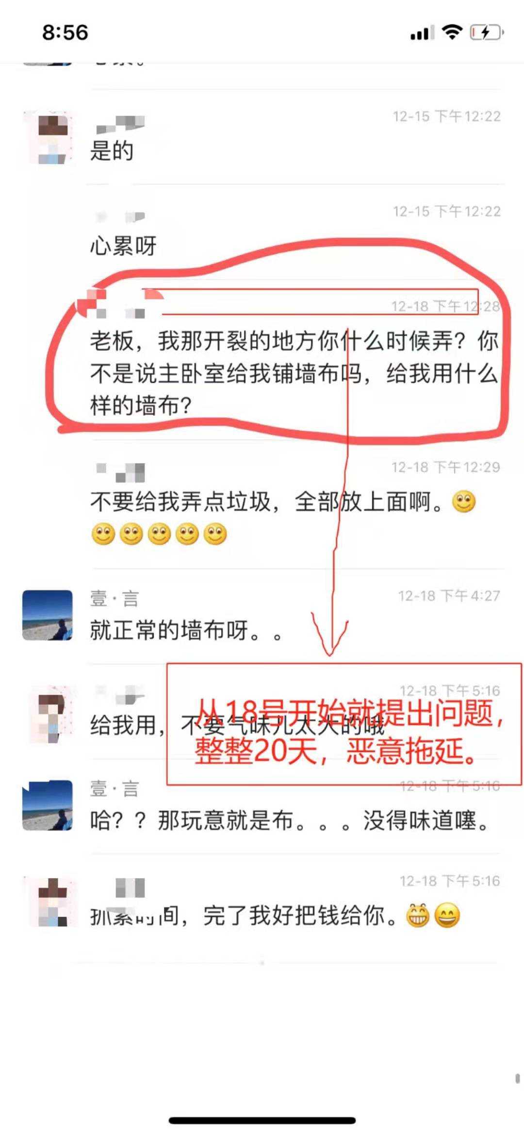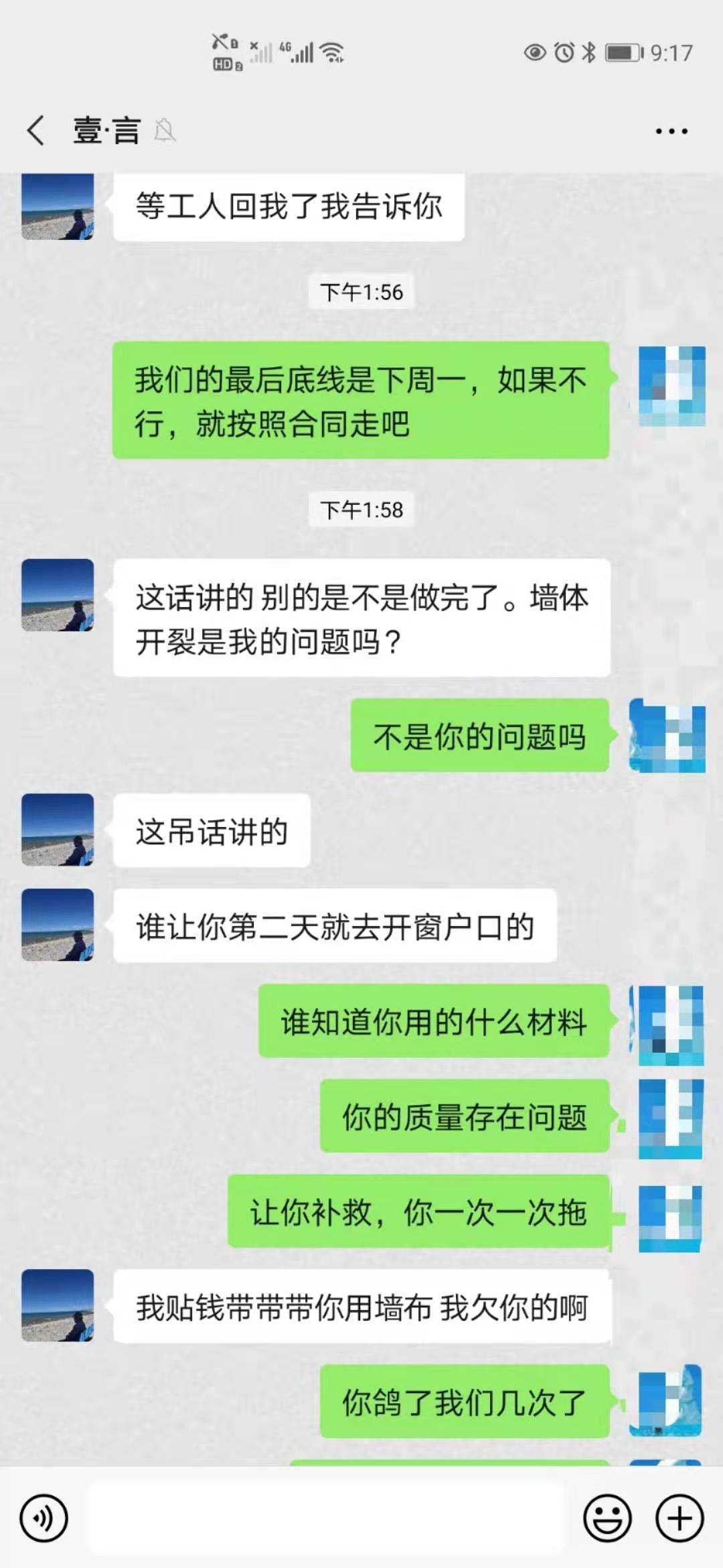 1.对方于2020年11月23日完成施工,我方于2020年12月15日搬入,起先发现墙体轻微开裂,要求对方补救。对方在2020年12月18日承诺合理期限内贴墙布方式补救;至2020年12月30日,数次催促,一直没进行补救措施,态度由敷衍变为不理睬,不回复;最后一次宽限期为2021年1月1日前补救,直至2021年1月8日,期间不理睬,不回复,今天彻底拉黑我方微信,并且表明彻底不再履行合同约定的12个月保修服务及交付标的物质量存在严重瑕疵的补救责任。