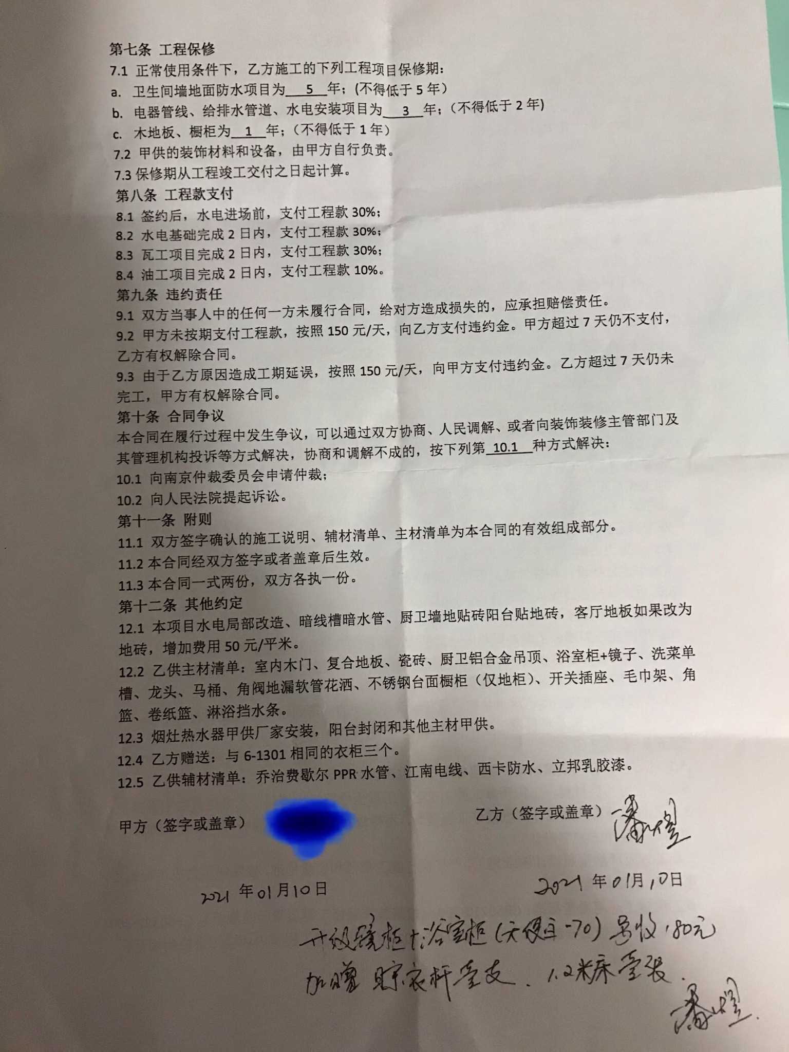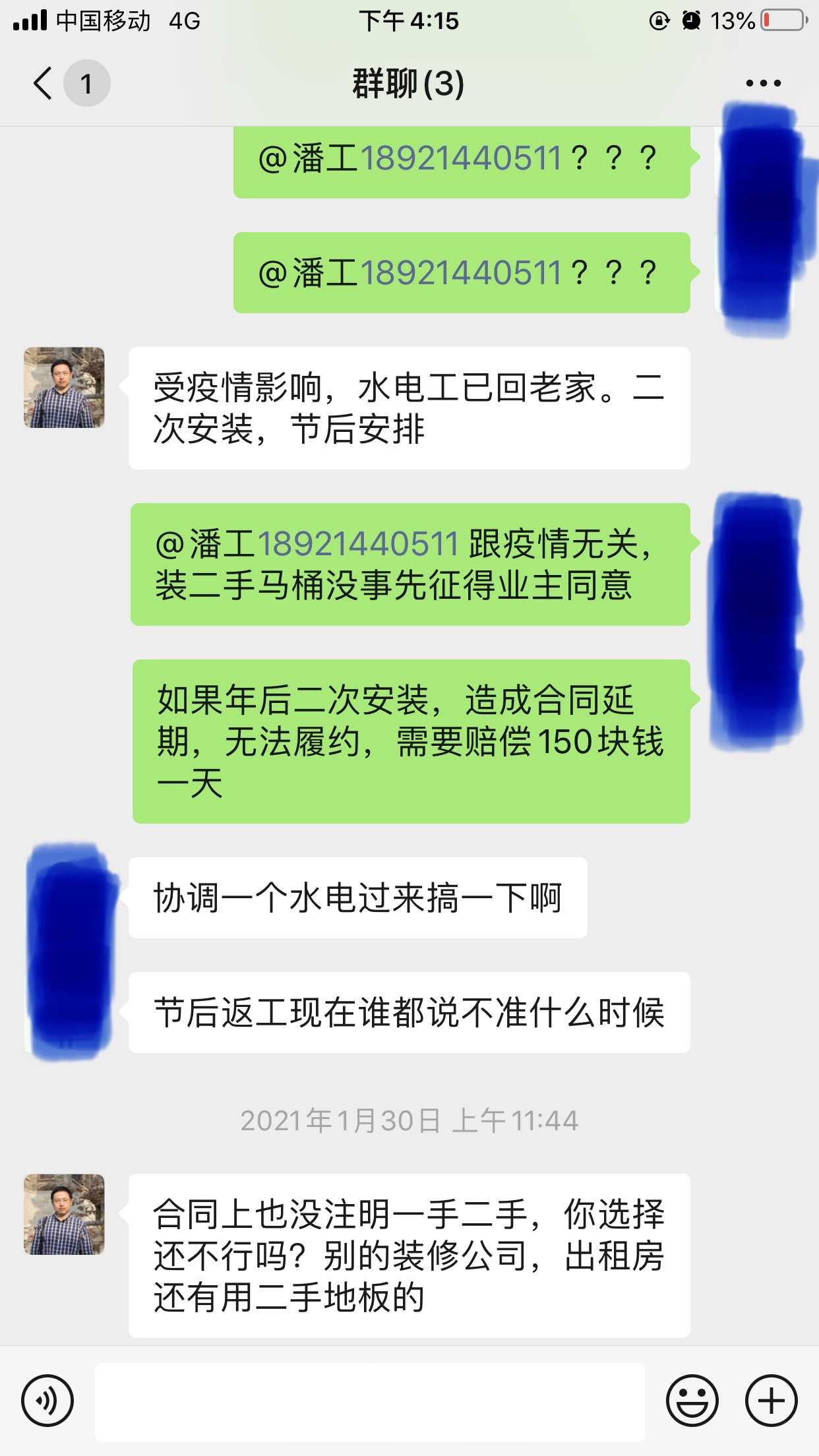 与装修公司负责人沟通事情的经过,回复这件事不要投诉站管,管不了。我们只会按合同办理,不支付费用不干活(合同条款注明是油工结束2天之后支付10%尾款)。消费者要求施工结束验收合格再支付,装修公司不同意。消费者另一个诉求二手马桶的问题。装修公司负责人居然回复合同中也没注明不能用二手马桶。。。。。。。 消费者是与个人签订合同,无法保护自己的利益,投诉站年后再次沟通,如无法协调,建议消费者走司法途径维权。 | 2021-02-04 |