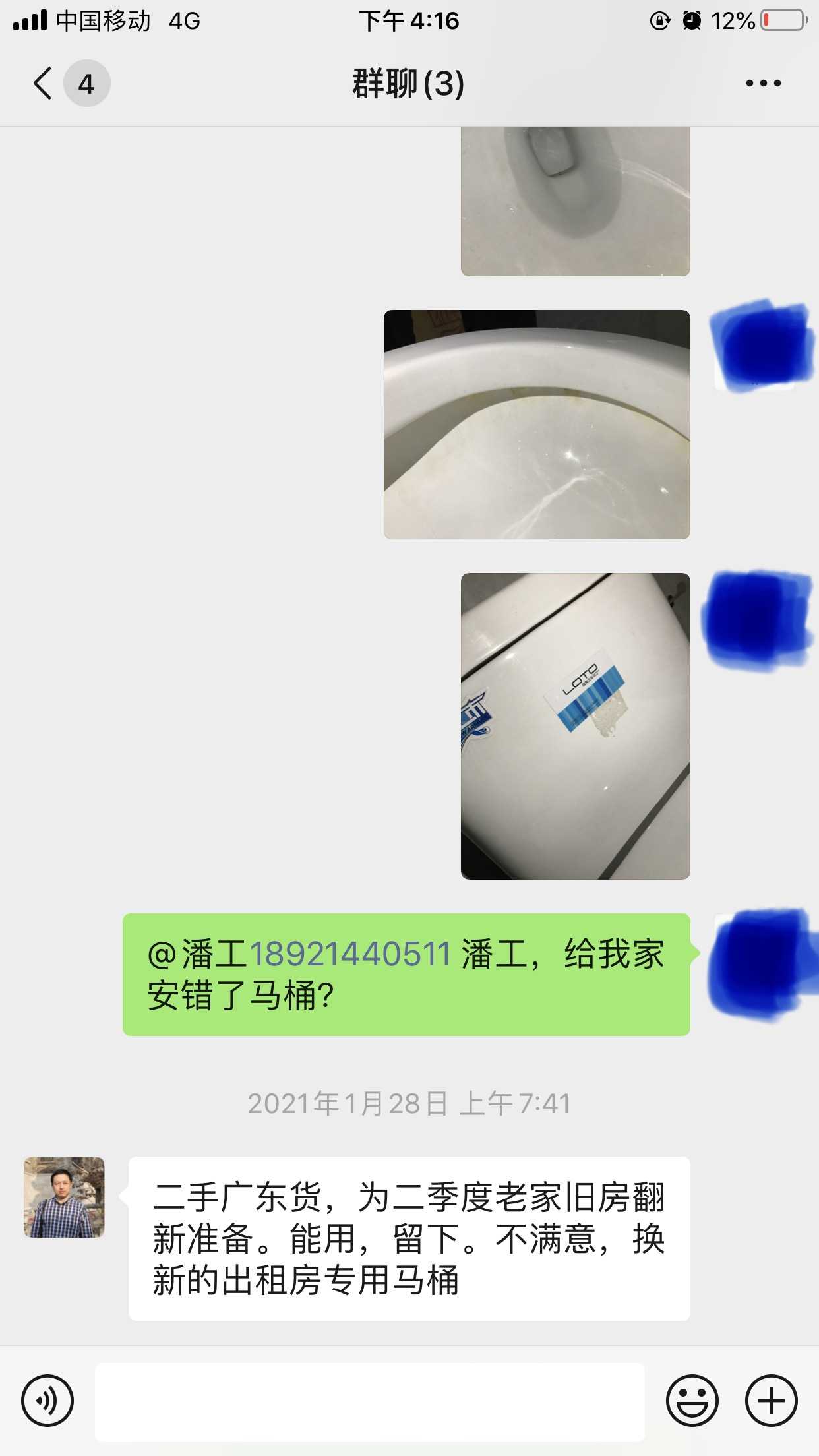 2、未与业主沟通情况下,私自安装二手马桶,以次充好,业主发现后,各种理由推诿不更换新的马桶;