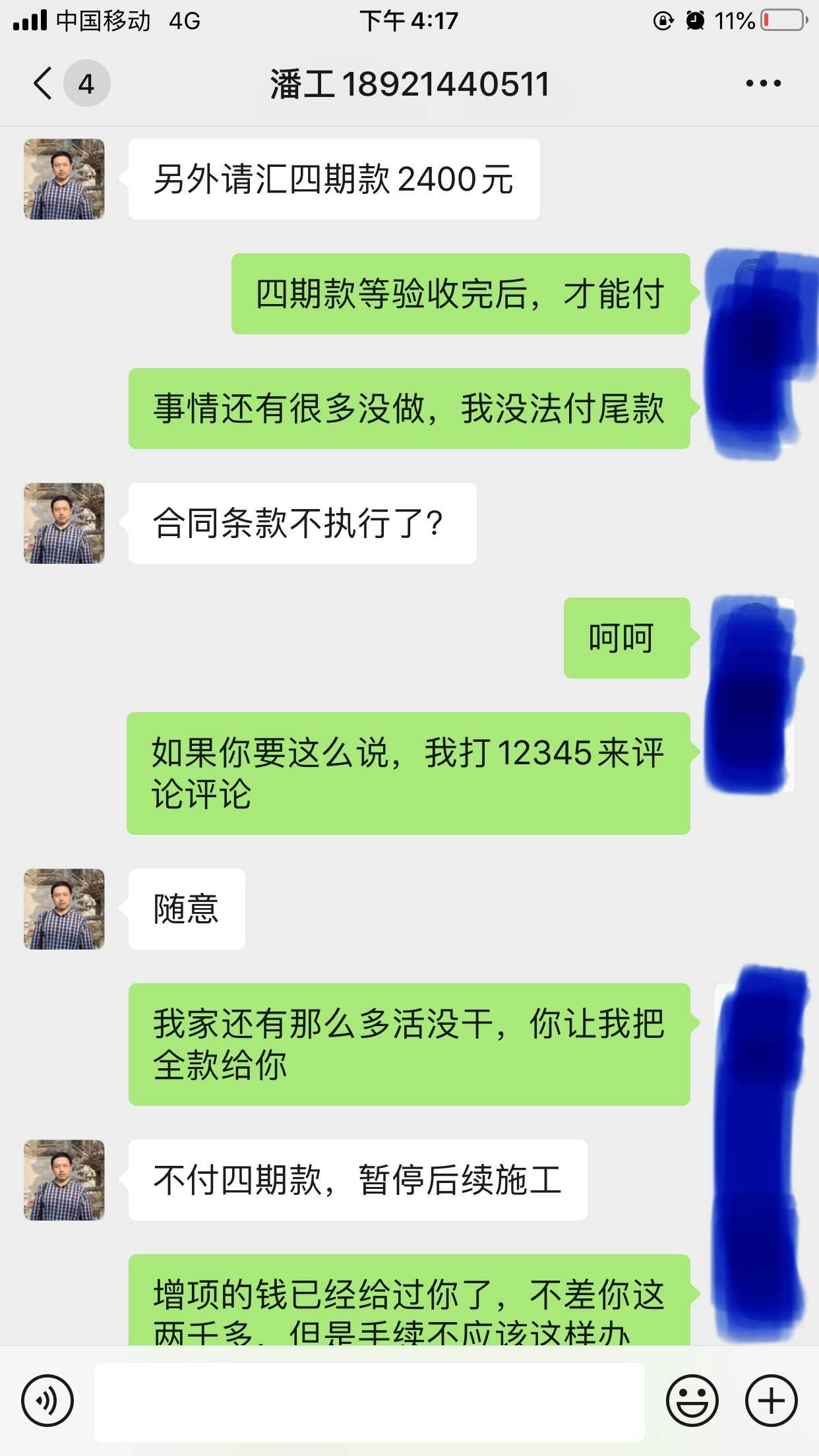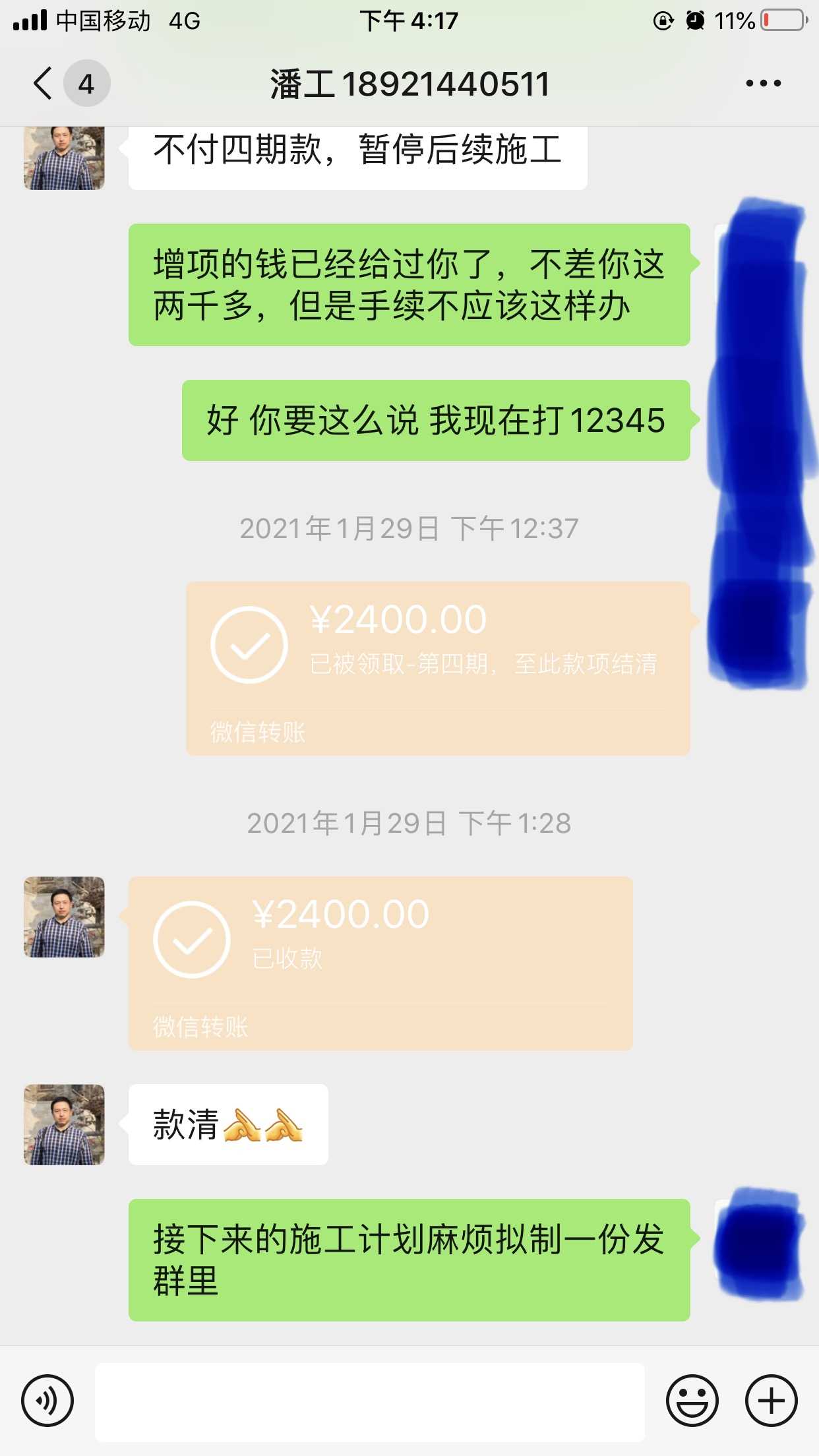 3、收完全款后,施工基本停滞,多次打电话不接,发微信很少回,难以联系上。|