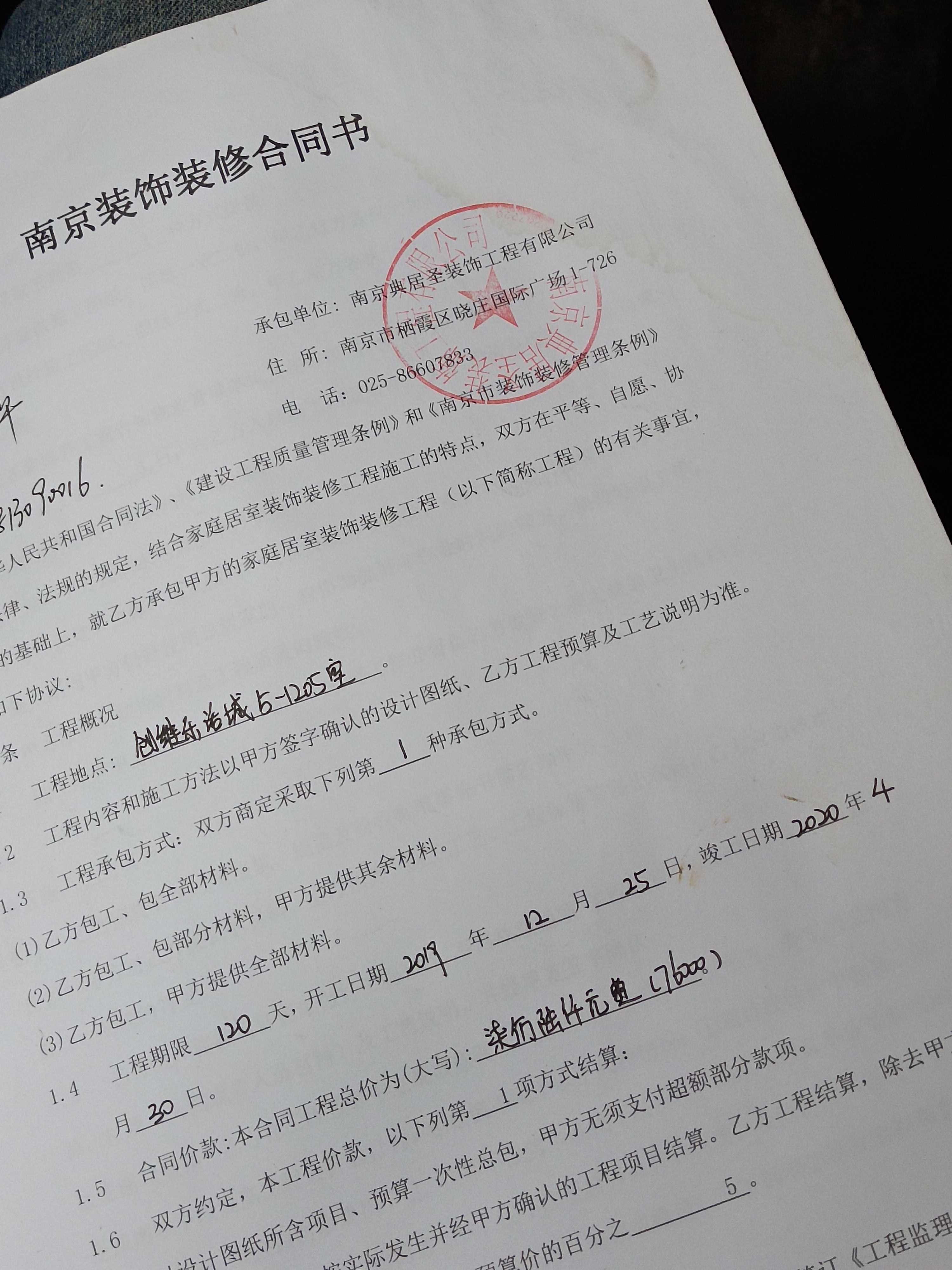 2019年12月份装修,南京典居圣装饰公司全包,前期的货款都支付了,按合同执行只有验收合格之后需要支付费用没有付。