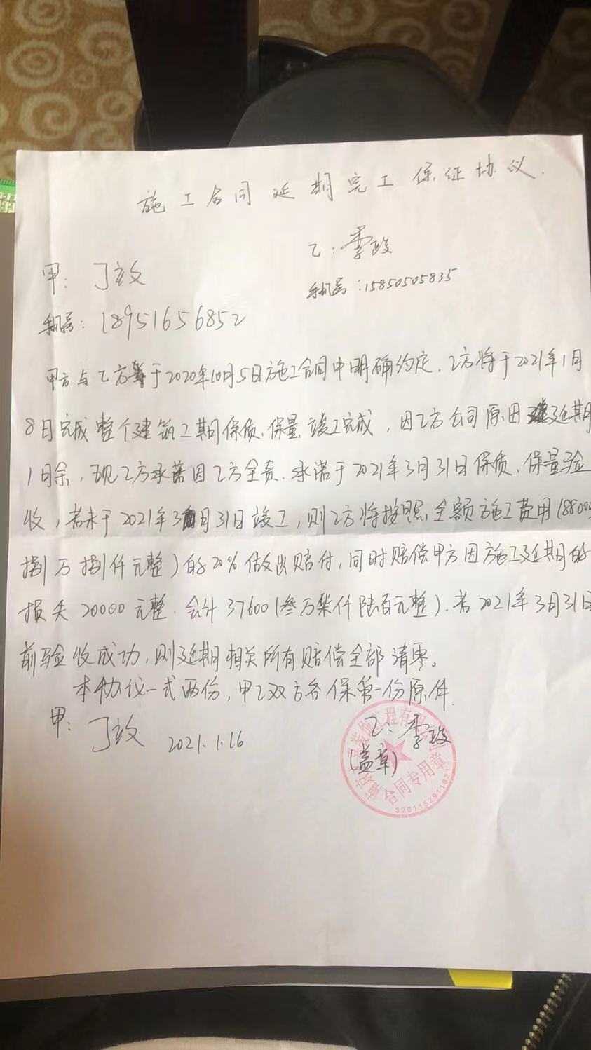 2020年11月至12月期间,文嘉因公司自身经营问题出现一月余的停工状态,我们多次催促,至2021年1月16日还有多项没有进展。2021年1月16日我们与公司法人李政取得联系并见面,因公司无法在春节前完成,我们签订补充协议“2021年3月31日前未完成,要赔偿全款的20%作为违约金,且需要另行赔偿2万元我们的损失。”