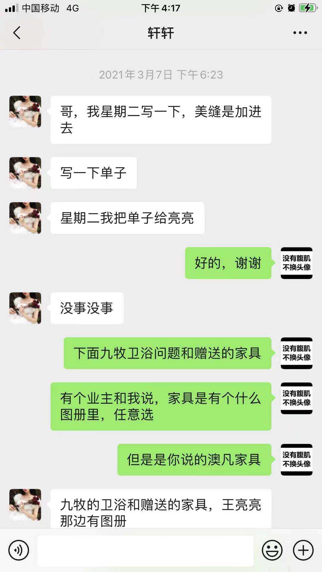 澳凡装饰负责人发现是维权站来电,不接继续按掉。与消费者联系,已报警处理,微信聊天记录不能作为证据进行赔偿,没有那么多时间消耗,消费者已妥协处理 | 2021-06-01 |