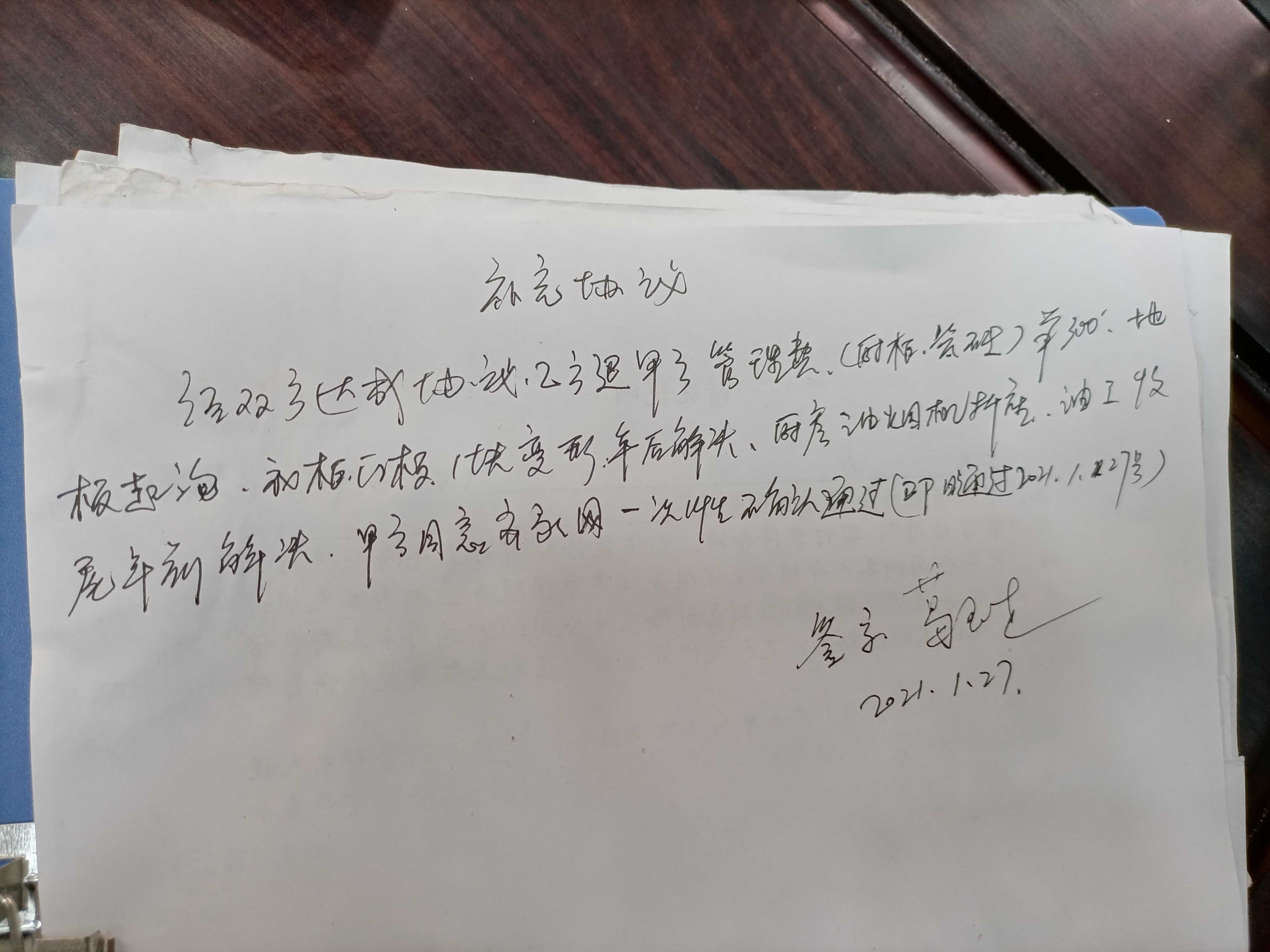 我于2020年5月3日与派醋装饰公司签订装修合同并交了定金,5月4日在建业区南苑新村台园9幢26号301室举行了开工典礼,一开始折旧动作滿快,之后就开始拖了一场马拉松开始了,光答应就是不来,好不容易水电工来了没有任何图纸合同上水电预收3000元多退少补,做完后算账1万多,几经交涉50-9平方的住房水电装修收1万无奈认倒霉。在此提醒想装修房子的人注意引以为戒。之后又拖了好長时间厨房卫生间阳贴瓷砖贴完后多出十箱瓷砖还有一些地砖,被我及时发现一直追讨多余瓷砖钱一直拖之后木工橱柜又发现尺寸与合同不符短斤少两。等等,这些钱一直到最后交尾款时我扣住尾款才得以解决。为此提醒以后装修人提高警惕。最后主要投诉地板起鼓,衣柜有一扇门变形,这个情况派酷公司程总清楚。2021年春节前为了年前将装修房屋整体验收竣工为此程总亲笔写了协议春节后一开工就来换门和地板让我签字同意整体验收。程总亲笔协议随后照片上传。这期间房屋墙开裂屋顶天花几处开裂,派漆工来漆工说是楼板原因拒绝修复并把天花挖了一个洞,你们装修公司是专搞老房装修,装修前什么都没说装修好了出现裂缝说是老房楼板问题一推了事。有你们这样做的吗?谁信呢!