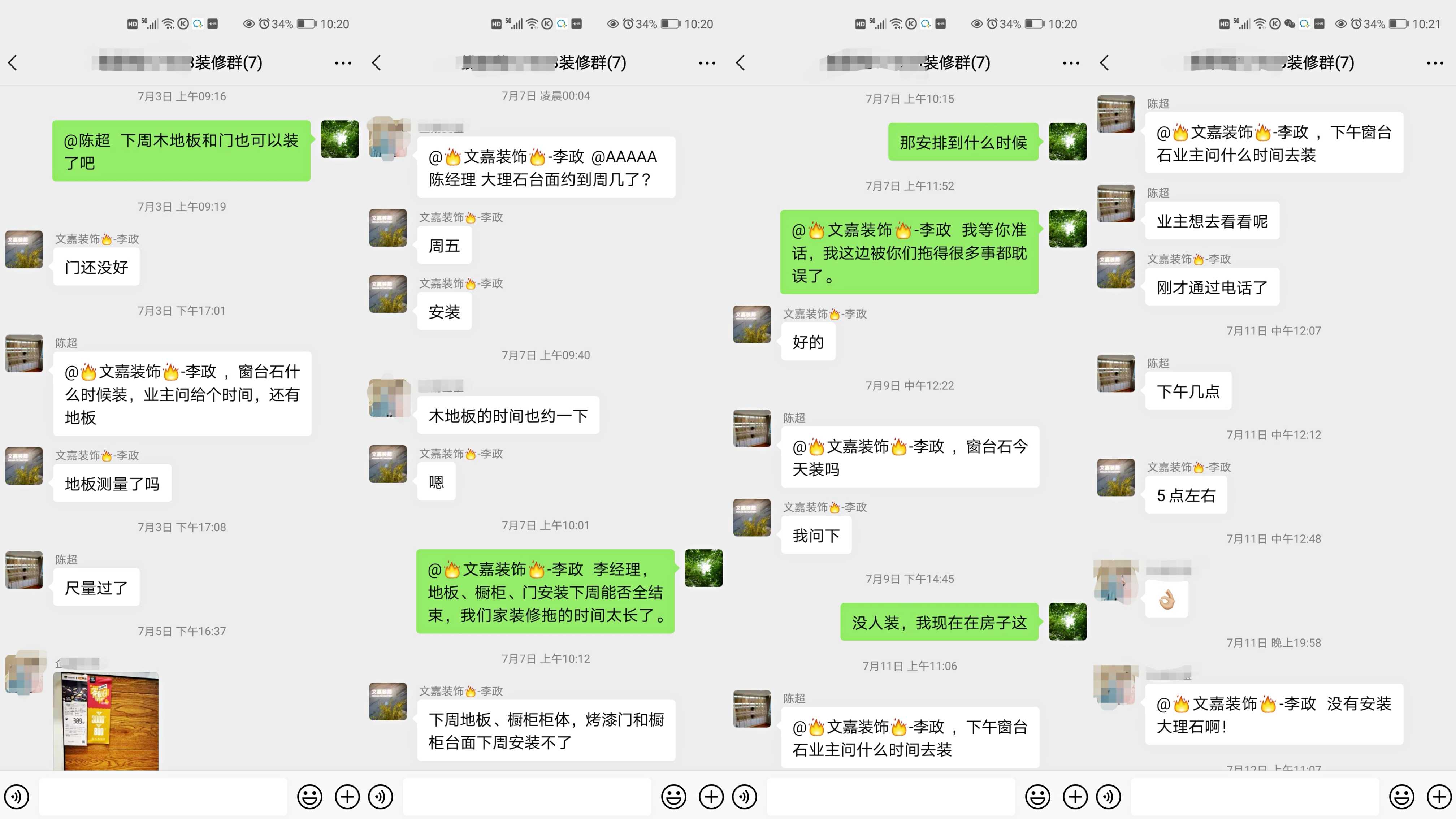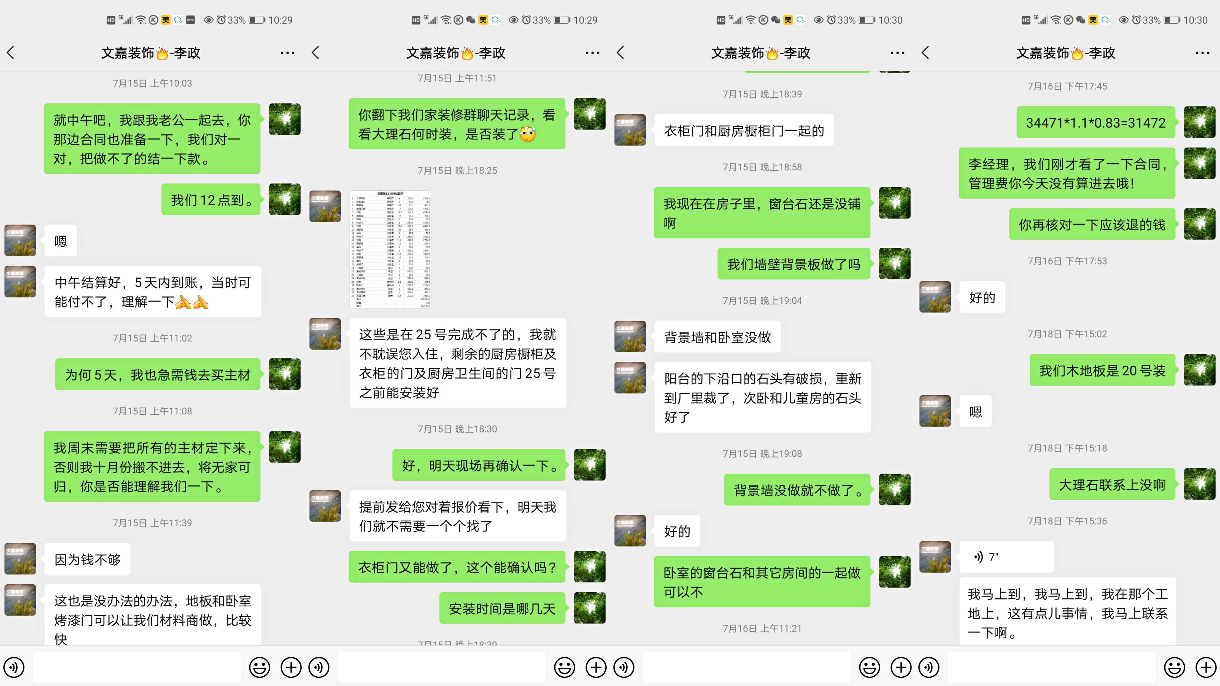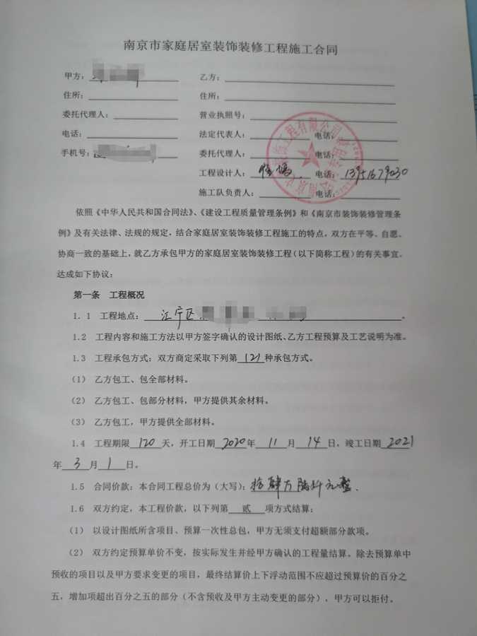2020年11月14日我方与南京文嘉装饰工程有限公司签订房屋装修合同,预计2021年3月1日完成。直到2021年7月16日,我方装修由于对方一直拖延主材安装,装修没法结束,这期间项目经理和我方多次催促对方李政经理(15850505835)安排主材安装,但对方屡次拖延,屡次爽约,严重影响了我方装修进度。本着解决问题的态度,我方与7月16日与李经理约在公司(江宁万达C座17楼)当面商量,部分主材款(后微信中补上了主材管理费)31472元,于7月23日前一次性付清,除厨房移门,其余主材7月25日前安装结束。时至今日,两项都没按时完成,期间电话或微信联系一直用拖欠的方式来糊弄我方。并且从7月25日起李经理不接电话,不回电话。现受到南京疫情影响,装修停止,但李经理一直没有主动联系我们归还主材欠款,根据李经理这种毫无诚信的表现。